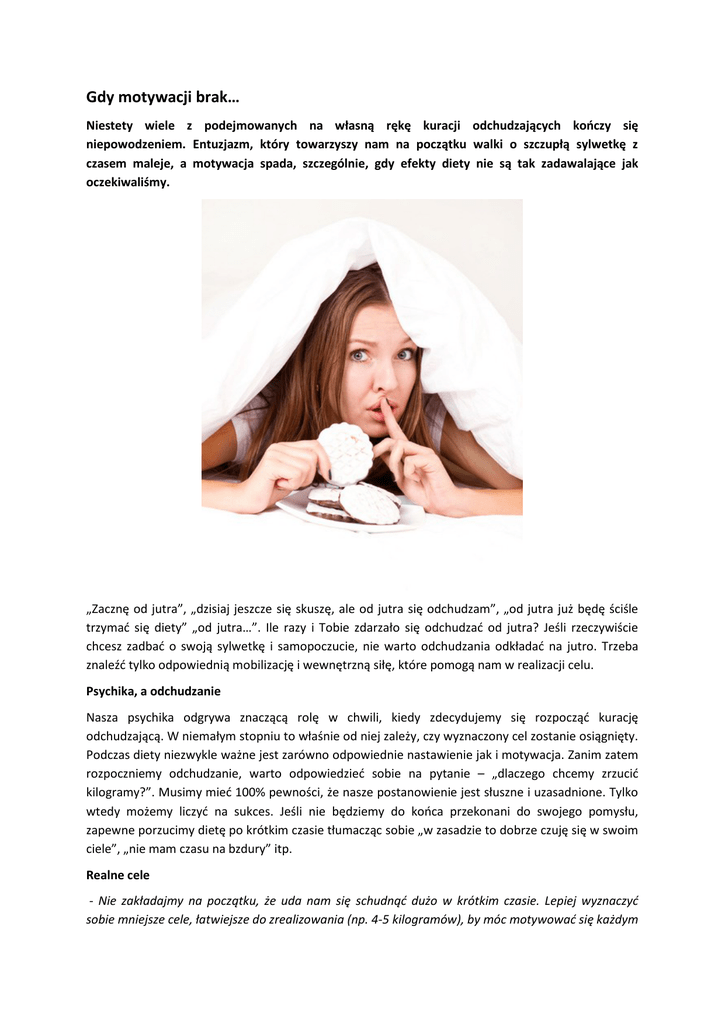 Gdy motywacji brak… Niestety wiele z podejmowanych na własną rękę kuracji odchudzających kończy się niepowodzeniem. Entuzjazm, który towarzyszy nam na początku walki o szczupłą sylwetkę z czasem maleje, a motywacja spada, szczególnie, gdy efekty diety nie są tak zadawalające jak oczekiwaliśmy. „Zacznę od jutra”, „dzisiaj jeszcze się skuszę, ale od jutra się odchudzam”, „od jutra już będę ściśle trzymać się diety” „od jutra…”. Ile razy i Tobie zdarzało się odchudzać od jutra? Jeśli rzeczywiście chcesz zadbać o swoją sylwetkę i samopoczucie, nie warto odchudzania odkładać na jutro. Trzeba znaleźć tylko odpowiednią mobilizację i wewnętrzną siłę, które pomogą nam w realizacji celu. Psychika, a odchudzanie Nasza psychika odgrywa znaczącą rolę w chwili, kiedy zdecydujemy się rozpocząć kurację odchudzającą. W niemałym stopniu to właśnie od niej zależy, czy wyznaczony cel zostanie osiągnięty. Podczas diety niezwykle ważne jest zarówno odpowiednie nastawienie jak i motywacja. Zanim zatem rozpoczniemy odchudzanie, warto odpowiedzieć sobie na pytanie – „dlaczego chcemy zrzucić kilogramy?”. Musimy mieć 100% pewności, że nasze postanowienie jest słuszne i uzasadnione. Tylko wtedy możemy liczyć na sukces. Jeśli nie będziemy do końca przekonani do swojego pomysłu, zapewne porzucimy dietę po krótkim czasie tłumacząc sobie „w zasadzie to dobrze czuję się w swoim ciele”, „nie mam czasu na bzdury” itp. Realne cele - Nie zakładajmy na początku, że uda nam się schudnąć dużo w krótkim czasie. Lepiej wyznaczyć sobie mniejsze cele, łatwiejsze do zrealizowania (np. 4-5 kilogramów), by móc motywować się każdym odniesionym sukcesem – stwierdza Beata Prusińska, dietetyk Naturhouse. Wyznaczenie sobie celu, którego nie będziemy w stanie zrealizować, poskutkuje spadkiem zapału i odejściem od diety. Pamiętajmy, by nie ważyć się codziennie – nie otrzymamy w ten sposób miarodajnego wyniku, gdyż waga waha się w zależności od tego co zjemy, wypijemy, od pory dnia, czy aktywności fizycznej. Najlepiej ważyć się raz w tygodniu o tej samej porze dnia. Zobaczymy wtedy, czy nasze wysiłki przynoszą rezultaty. Gdy nadejdzie kryzys Jeśli mimo naszych usilnych starań efekty odchudzania są mizerne, nie należy się poddawać! Nie przejmujmy się niewielkim niepowodzeniem, tylko pomyślmy sobie, jak będziemy wyglądać za kilka tygodni czy miesięcy. Zwizualizujmy swoje marzenia! Masz zbyt obcisłe dżinsy lub przymałą bluzkę, w które chciałabyś się wcisnąć? Połóż je w widocznym miejscu w szafie i pamiętaj, że czekają na dzień, gdy je założysz. A jak wtedy będziesz się czuć? Bosko i przeszczęśliwie! Myśl pozytywnie – to podstawa powodzenia. Jeśli nie masz jednak wystarczająco silnej woli, może wsparcie specjalisty dietetyka okaże się pomocne? Wsparcie i mobilizacja Podczas diety niezwykle przydatne jest wsparcie bliskich. Dobrym pomysłem bywa rozpoczęcie kuracji z drugą osobą, aby móc się nawzajem mobilizować. Równie istotne jest wsparcie eksperta. Dietetyk pomaga dopasować dietę do indywidualnych potrzeb organizmu, dzięki czemu łatwiej jest nam stosować się do zaleceń i osiągać zamierzone cele. Jego opieka zapewnia również poczucie bezpieczeństwa. Dzięki radom i wskazówkom łatwej jest pokonać chwile zwątpienia oraz zrozumieć reakcje organizmu, jakie zachodzą podczas całego procesu odchudzania. Mamy także pewność, że dieta przebiega prawidłowo, co daje nam duży komfort i spokój o własne zdrowie. Dietetyk nie tylko pomoże schudnąć, ale również wyprowadzi nas z diety i pomoże utrwalić uzyskane efekty. Co więcej, stosowanie się do zaleceń specjalisty wyrabia w nas właściwe nawyki żywieniowe, które gwarantują utrzymanie idealnej sylwetki również po zakończeniu całego procesu. Specjalista jest więc bezcennym wsparciem merytorycznym i psychicznym w drodze o szczupłą sylwetkę i dobre zdrowie. Od czego zacząć? Dobrą okazją do rozpoczęcia współpracy z dietetykiem jest ogólnopolska akcja „Uwaga Nadwaga” organizowana przez Centra Naturhouse. W ramach kampanii we wszystkich punktach Naturhouse na terenie całej Polski (ponad 230 placówek!) można skorzystać z bezpłatnych konsultacji dietetycznych, połączonych z pomiarami ciała, badaniem zawartości tkanki tłuszczowej oraz wody metabolicznej w organizmie. - Na pierwszej wizycie w naszym Centrum przeprowadzany jest szczegółowy wywiad dietetyczny wraz z dokładnymi pomiarami ciała. Na podstawie zebranych informacji dietetyk może ustalić jaka jest przyczyna problemu z wagą i zaproponować skuteczne rozwiązanie. – mówi Beata Prusińska z Naturhouse. Kampania „Uwaga Nadwaga” organizowana przez Centra Dietetyczne Naturhouse ma na celu zwrócenie uwagi na problemy nadwagi i otyłości oraz związane z nimi konsekwencje zdrowotne. Propaguje również zwiększenie świadomości w kwestii prawidłowych nawyków żywieniowych. Akcja trwa w dniach 15 września – 30 listopada. Więcej informacji o akcji i lista placówek, w których można skorzystać z bezpłatnych konsultacji z dietetykiem dostępne są na stronie www.uwaganadwaga.com.