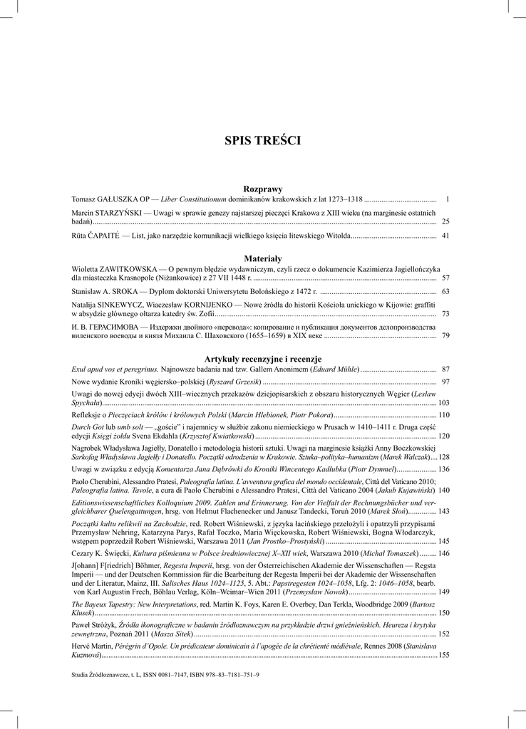 SPIS TREŚCI Rozprawy Tomasz GAŁUSZKA OP — Liber Constitutionum dominikanów krakowskich z lat 1273–1318 ...................................... 1 Marcin STARZYŃSKI — Uwagi w sprawie genezy najstarszej pieczęci Krakowa z XIII wieku (na marginesie ostatnich badań).................................................................................................................................................................................... 25 . Rūta ČAPAITE — List, jako narzędzie komunikacji wielkiego księcia litewskiego Witolda ............................................. 41 Materiały Wioletta ZAWITKOWSKA — O pewnym błędzie wydawniczym, czyli rzecz o dokumencie Kazimierza Jagiellończyka dla miasteczka Krasnopole (Niżankowice) z 27 VII 1448 r. ................................................................................................ 57 Stanisław A. SROKA — Dyplom doktorski Uniwersytetu Bolońskiego z 1472 r. ............................................................. 63 Natalija SINKEWYCZ, Wiaczesław KORNIJENKO — Nowe źródła do historii Kościoła unickiego w Kijowie: graffiti w absydzie głównego ołtarza katedry św. Zofii .................................................................................................................... 73 И. В. ГЕРАСИМОВА — Издержки двойного «перевода»: копирование и публикация документов делопроизводства виленского воеводы и князя Михаила С. Шаховского (1655–1659) в XIX веке ........................................................... 79 Artykuły recenzyjne i recenzje Exul apud vos et peregrinus. Najnowsze badania nad tzw. Gallem Anonimem (Eduard Mühle) ........................................ 87 Nowe wydanie Kroniki węgiersko–polskiej (Ryszard Grzesik) ........................................................................................... 97 Uwagi do nowej edycji dwóch XIII–wiecznych przekazów dziejopisarskich z obszaru historycznych Węgier (Lesław Spychała)............................................................................................................................................................................... 103 Refleksje o Pieczęciach królów i królowych Polski (Marcin Hlebionek, Piotr Pokora) ...................................................... 110 Durch Got lub umb solt — „goście” i najemnicy w służbie zakonu niemieckiego w Prusach w 1410–1411 r. Druga część edycji Księgi żołdu Svena Ekdahla (Krzysztof Kwiatkowski) ............................................................................................... 120 Nagrobek Władysława Jagiełły, Donatello i metodologia historii sztuki. Uwagi na marginesie książki Anny Boczkowskiej Sarkofag Władysława Jagiełły i Donatello. Początki odrodzenia w Krakowie. Sztuka–polityka–humanizm (Marek Walczak) .... 128 Uwagi w związku z edycją Komentarza Jana Dąbrówki do Kroniki Wincentego Kadłubka (Piotr Dymmel)..................... 136 Paolo Cherubini, Alessandro Pratesi, Paleografia latina. L’avventura grafica del mondo occidentale, Città del Vaticano 2010; Paleografia latina. Tavole, a cura di Paolo Cherubini e Alessandro Pratesi, Città del Vaticano 2004 (Jakub Kujawiński) 140 Editionswissenschaftliches Kolloquium 2009. Zahlen und Erinnerung. Von der Vielfalt der Rechnungsbücher und vergleichbarer Quelengattungen, hrsg. von Helmut Flachenecker und Janusz Tandecki, Toruń 2010 (Marek Słoń)............... 143 Początki kultu relikwii na Zachodzie, red. Robert Wiśniewski, z języka łacińskiego przełożyli i opatrzyli przypisami Przemysław Nehring, Katarzyna Parys, Rafał Toczko, Maria Więckowska, Robert Wiśniewski, Bogna Włodarczyk, wstępem poprzedził Robert Wiśniewski, Warszawa 2011 (Jan Prostko–Prostyński) .......................................................... 145 Cezary K. Święcki, Kultura piśmienna w Polsce średniowiecznej X–XII wiek, Warszawa 2010 (Michał Tomaszek) ......... 146 J[ohann] F[riedrich] Böhmer, Regesta Imperii, hrsg. von der Österreichischen Akademie der Wissenschaften — Regsta Imperii — und der Deutschen Kommission für die Bearbeitung der Regesta Imperii bei der Akademie der Wissenschaften und der Literatur, Mainz, III. Salisches Haus 1024–1125, 5. Abt.: Papstregesten 1024–1058, Lfg. 2: 1046–1058, bearb. von Karl Augustin Frech, Böhlau Verlag, Köln–Weimar–Wien 2011 (Przemysław Nowak) .............................................. 149 The Bayeux Tapestry: New Interpretations, red. Martin K. Foys, Karen E. Overbey, Dan Terkla, Woodbridge 2009 (Bartosz Klusek) .............................................................................................................................................................................................. 150 Paweł Stróżyk, Źródła ikonograficzne w badaniu źródłoznawczym na przykładzie drzwi gnieźnieńskich. Heureza i krytyka zewnętrzna, Poznań 2011 (Masza Sitek) ............................................................................................................................... 152 Hervé Martin, Pérégrin d’Opole. Un prédicateur dominicain à l’apogée de la chrétienté médiévale, Rennes 2008 (Stanislava Kuzmová)............................................................................................................................................................................................... 155 Studia Źródłoznawcze, t. L, ISSN 0081–7147, ISBN 978–83–7181–751–9 VI Spis treści Bronisław Nowak, Ród Porajów w Małopolsce w średniowieczu, Kraków 2009 (Bożena Czwojdrak) .............................. 158 Elżbieta Knapek, Akta oficjalatu i wikariatu generalnego krakowskiego do połowy XVI wieku, Kraków 2010 (Marta Czyżak) .........................................................................