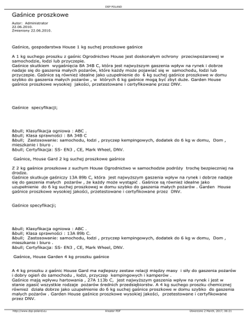 DSP POLAND Gaśnice proszkowe Autor: Administrator 22.06.2010. Zmieniony 22.06.2010. Gaśnice, gospodarstwa House 1 kg suchej proszkowe gaśnice A 1 kg suchego proszku z gaśnic Ogrodnictwo House jest doskonałym ochrony przeciwpożarowej w samochodzie, łodzi lub przyczepie. Gaśnice skutkiem wygaśnięcia 8A 34B C, która jest najwyższym gaszenia wpływ na rynek i dobrze nadaje się do gaszenia małych pożarów, które każdy może pojawiać się w samochodu, łodzi lub przyczepie. Gaśnice są również idealne jako uzupełnienie do 6 kg suchej gaśnice proszkowe w domu szybko do gaszenia małych pożarów , w których 6 kg gaśnice mogą być zbyt duże. Garden House gaśnice proszkowe wysokiej jakości, przetestowane i certyfikowane przez DNV. Gaśnice specyfikacji; • Klasyfikacja ogniowa : ABC . • Klasa sprawności : 8A 34B C • Zastosowanie: samochodu, łodzi , przyczep kempingowych, dodatek do 6 kg w domu, Dom , mieszkanie i biuro . • Certyfikacja: SS- EN3 , CE, Mark Wheel, DNV. Gaśnice, House Gard 2 kg suchej proszkowe gaśnice Z 2 kg gaśnice proszkowe z suchym House Ogrodnictwo w samochodzie podróży trochę bezpieczniej na drodze. Gaśnice skutkuje gaśniczy 13A 89b C, która jest najwyższym gaszenia wpływ na rynek i dobrze nadaje się do gaszenia małych pożarów , że każdy może wystąpić . Gaśnice są również idealne jako uzupełnienie do 6 kg suchej proszkowej w domu szybko do gaszenia małych pożarów . Garden House gaśnice proszkowe wysokiej jakości, przetestowane i certyfikowane przez DNV. Gaśnice specyfikacji; • Klasyfikacja ogniowa : ABC . • Klasa sprawności : 13A 89b C. • Zastosowanie: samochodu, łodzi , przyczep kempingowych, dodatek do 6 kg w domu, Dom , mieszkanie i biuro . • Certyfikacja: SS- EN3 , CE, Mark Wheel, DNV. Gaśnice, House Garden 4 kg proszku gaśnice A 4 kg proszku z gaśnic House Gard ma najlepszy zestaw relacji między masy i siły do gaszenia pożarów i dobry ogień do samochodu , łodzi, przyczep kempingowych i kamperów . Gaśnice mają wpływu hartowania , 27A 113b C, jest najwyższym gaszenia wpływ na rynek i jest w stanie zgasić wszystkie rodzaje pożarów średnich przedsiębiorstw. A 4 kg suchego proszku chemicznej również działa dobrze jako uzupełnienie do 6 kg suchej gaśnice proszkowe w domu szybko do gaszenia małych pożarów . Garden House gaśnice proszkowe wysokiej jakości, przetestowane i certyfikowane przez DNV. http://www.dsp-poland.eu Kreator PDF Utworzono 2 March, 2017, 06:21 DSP POLAND Gaśnice specyfikacji; • Klasyfikacja ogniowa : ABC . • Klasa sprawności : 27A 113b C. • Zastosowanie: samochodu, łodzi , przyczep kempingowych, dodatek do 6 kg w domu, Dom , mieszkanie i biuro . • Certyfikacja: SS- EN3 , CE, Mark Wheel, DNV. Gaśnice, House Gard 6 kg gaśnice proszkowe , najlepszy wybór dla Twojego domu Z 6 kg suchej gaśnice proszkowe z House Gard , pojawi się gaśnica do gaszenia pożarów i każdy z najwyższym efekt gaśniczy Wybór gaśnic nagle stała się o wiele łatwiejsze. Jest to zalecane jest gaśnica , że masz w domu. Z 6 kg suchej gaśnice proszkowe z House Gard , pojawi się gaśnica do gaszenia pożarów i każdy ma najwyższą moc gaszenia (wydajność klasy C 43A 233b) . Oznacza to, możesz umieścić na duży pożar House Gard 6 kg gaśnica proszku niż w większości innych gaśnic na rynku , które często mają niższe klasy wydajności. Garden House gaśnice proszkowe wysokiej jakości, przetestowane i certyfikowane przez DNV. Fire Protection Association zaleca gospodarstw domowych o 6 kg suchej proszkowe gaśnica 43A 233b efektywności gaśnice klasy C muszą być certyfikowane przez DNV lub innego Swedac akredytowaną jednostkę . Zalecenia do użytku domowego jest tylko 6 kg suchego proszku gaśnica nie jest tak naprawdę zaskakujące . Czy ogień gaśnice mniej (1,2 lub 4 kg) jako efekt gaśniczy jest niższy , większy gaśnica jest zbyt ciężka dla większości do w stanie ponieść . Gaśnice specyfikacji; • • • • Klasyfikacja ogniowa : ABC . Klasa sprawności : 43A 233b C. Zastosowanie: dom , wakacje w domu, mieszkaniu , biurowych i przemysłowych . Certyfikacja: SS- EN3 , CE, Mark Wheel, DNV. Gaśnice, House Gard 12 kg proszku gaśnice A 12 kg suchego proszku z gaśnic House Gardens jest ogromny pożar, który mieści się w biurach , statków, w przemyśle. Gaśnice mają wpływ na gaszenie 55A 233b C, która jest najwyższym gaszenia wpływ na rynek i dobrze nadaje się do gaszenia wszystkich typów dużych pożarów, które mogą wystąpić . Garden House gaśnice proszkowe wysokiej jakości, przetestowane i certyfikowane przez DNV. Gaśnice specyfikacji; • • • • Klasyfikacja ogniowa : ABC . Klasa sprawności : 55A 233b C. Zastosowanie: biura, statków i przemysłu. Certyfikacja: SS- EN3 , CE, Mark Wheel, DNV. http://www.dsp-poland.eu Kreator PDF Utworzono 2 March, 2017, 06:21 DSP POLAND http://www.dsp-poland.eu Kreator PDF Utworzono 2 March, 2017, 06:21