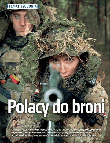 FOT. MARCIN KALIŃSKI/PAP TEMAT TYGODNIA Polacy do broni Wojciech Wybranowski 18 Kilka tysięcy osób – najwięcej na Podlasiu – zgłosiło już chęć wstąpienia w szeregi tworzonej obrony terytorialnej. Znacząco rośnie też liczba uczestników specjalistycznych kursów strzeleckich. Dla niektórych to hobby, wielu jednak mówi o chęci obrony kraju przed ewentualnym agresorem www.DORZECZY.pl DO RZECZY TYGODNIK LISICKIEGO MODA NA BROŃ CZY ŚWIADOMOŚĆ ZAGROŻEŃ? P ołowa czerwca, poligon w Nowej Dębie. Właśnie skończył się jeden z etapów wojskowych manewrów NATO „Anakonda 2016”. Batalion zmechanizowany z 21. Brygady Strzelców Podhalańskich wspólne z ukraińską kompanią powietrznodesantową prowadził tu operację „Cordon & Search”. Celem żołnierzy jest wykrycie działającego w okolicy miasteczka oddziału dywersantów, odizolowanie go od ludności cywilnej i „neutralizacja”. Zadanie zostaje przeprowadzone szybko i sprawnie. Udaje się to również dzięki wsparciu wojska przez grupę ludzi z organizacji proobronnych i paramilitarnych. Tuż po zakończeniu operacji w Nowej Dębi do stojących w szeregu żołnierzy wojsk operacyjnych podchodzi obserwujący całe manewry gen. Marek Tomaszycki, dowódca operacyjny Rodzajów Sił Zbrojnych. Przygląda się wyprężonym mundurowym i z pełnym przekonaniem dziękuje za zaangażowanie… właśnie cywilnym militarystom. – Pomylił ich z nami, więc chyba nie ustępowaliśmy zbytnio pola żołnierzom, nie odróżnialiśmy się, jedynie z musztrą mieliśmy problemy – śmieją się w rozmowie z „Do Rzeczy” młodzi entuzjaści broni palnej. W sumie w „Anakondzie” uczestniczyło ich 500. Wspólnie z żołnierzami brytyjskimi zabezpieczali przeprawę przez Odrę w okolicy Białej Góry, a pod Orzyszem, chronili sztab dowodzenia na terenie „opanowanym przez nieprzyjaciela”. Niezbędne wyposażenie i ekwipunek: kamizelki kuloodporne, stroje maskujące, sprzęt łączności kupili głównie za własne pieniądze lub otrzymali od zaprzyjaźnionych firm. Już liczą na kolejne wspólne manewry z wojskiem i przygotowują własne szkolenia strzeleckie. Wybuch walk na wschodniej Ukrainie w kwietniu 2014 r. i rosyjska agresja na naszego sąsiada były impulsem, który wywołał wzmożone zainteresowanie Polaków bronią i wojskowymi ćwiczeniami. Chociaż od tamtych wydarzeń minęły już ponad dwa lata, militarna aktywność Polaków rośnie. – Coraz więcej ludzi chce się nauczyć strzelać i to nie tylko z broni krótkiej. Polacy zobaczyli na przykładzie Ukrainy, co znaczy być bezbronnym, więc chcą mieć broń, chcą umieć strzelać – mówi Przemysław Wójtowicz, instruktor strzelców wyborowych, weteran misji wojskowych na Bliskim Wschodzie. – To bardzo po18–24 VII 2016 29/2016 zytywny trend, im więcej broni w rękach przeszkolonych strzelecko ludzi, tym bardziej będą oni bezpieczni – ocenia. Wraz ze wzrostem zainteresowania bronią rośnie też liczba uczestników profesjonalnych kursów – często prowadzonych przez byłych żołnierzy – na których adepci nie tylko poznają podstawy obsługi broni, lecz także uczą się zaawansowanych technik strzeleckich. JEDEN POCISK, JEDEN WRÓG Zdaniem Pawła Garlaka, jednego z najlepszych wojskowych strzelców wyborowych w Europie, dziś właściciela firmy Multi-Gun.pl organizującej m.in. specjalistyczne kursy snajperskie, rosnącej wśród Polaków popularności broni i nauki strzelania nie da się nie zauważyć. – Dla jednych, dobrze zarabiających, to rodzaj oryginalnego hobby, sportu, okazji do spędzenia nietypowo weekendu. Jednak jest też duża liczba młodych ludzi, najczęściej uczestników grupowych kursów, którzy chcą się nauczyć czegoś więcej. To patrioci w dobrym tego Polacy wciąż są jednym z najbardziej rozbrojonych narodów Europy, a o pozwolenie na posiadanie broni nie jest u nas łatwo słowa znaczeniu, którzy przygotowują się do obrony kraju, rodziny przed ewentualnym zagrożeniem – mówi Garlak w rozmowie z „Do Rzeczy”. Tymi młodymi ludźmi, potencjalnymi członkami tworzonych właśnie przez MON brygad obrony terytorialnej, w ostatnich miesiącach regularnie straszą lewicowe media. Publicyści „Gazety Wyborczej” i „Newsweeka” przekonują, że broń do ręki dostaną „kibole”, „faszyści z ONR”, „ armia PiS”, a wszyscy oni staną się „bojówkami Macierewicza”. Pytany o to Paweł Garlak przyznaje, że zainteresowanie bronią wśród ludzi o poglądach patriotycznych zdecydowanie rośnie. Alarmistyczne medialne publikacje kwituje jednak krótko: – Młodzi, którzy przychodzą na szkolenia, to poukładani, emocjonalnie stabilni, bardzo sympatyczni ludzie. Nigdy nie miałem żadnego problemu z nimi w trakcie zajęć. – Pamiętajmy, że pozwolenie na broń mogą dostać tylko ludzie o nieposzlakowanej opinii. Otrzymanie go przez osobę skazaną prawomocnym wyrokiem sądu nie jest możliwe. A za najmniejsze nawet przestępstwo takie pozwolenie się traci – dodaje stanowczo. Profesjonalne szkolenie strzeleckie też nie jest proste. Trzeba zaliczyć wykłady dotyczące bezpieczeństwa posługiwania się bronią, jej konserwacji i przechowywania oraz reagowania na incydenty, np. sytuacje, gdy broń zatnie się podczas strzelania. Później zaczyna się cykl szkoleń „na sucho” związany z techniką strzelecką. Dopiero po ich zakończeniu zaczyna się strzelanie na ostro pod okiem instruktora. Ostatni etap to strzelanie do oddalonych celów. To wszystko wymaga sporej ilości pieniędzy i czasu. Mimo to kursy strzelania z broni, zwłaszcza na długim dystansie, mają pełne obłożenie. Kto w nich uczestnicy? – Szkolę bardzo różnych ludzi, od 18-latków do profesorów wyższych uczelni. To ludzie świadomi, zorganizowani, mający w życiu cel. Motywacje bywają różne, coraz częściej są widoczny wątek patriotyczny, poczucie odpowiedzialności za kraj, jaki