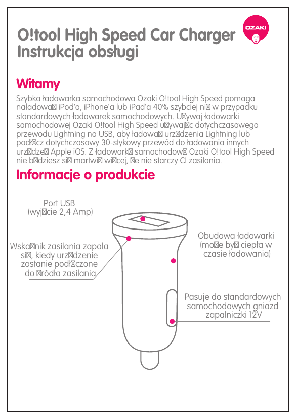 O!tool High Speed Car Charger Instrukcja obsługi Witamy Szybka ładowarka samochodowa Ozaki O!tool High Speed pomaga naładowa iPod'a, iPhone'a lub iPad'a 40% szybciej ni w przypadku standardowych ładowarek samochodowych. Uywaj ładowarki samochodowej Ozaki O!tool High Speed uywajc dotychczasowego przewodu Lightning na USB, aby ładowa urzdzenia Lightning lub podłcz dotychczasowy 30-stykowy przewód do ładowania innych urzdze Apple iOS. Z ładowark samochodow Ozaki O!tool High Speed nie bdziesz si martwi wicej, e nie starczy CI zasilania. Informacje o produkcie Port USB (wyjcie 2,4 Amp) Wskanik zasilania zapala si, kiedy urzdzenie zostanie podłczone do ródła zasilania Obudowa ładowarki (moe by ciepła w czasie ładowania) Pasuje do standardowych samochodowych gniazd zapalniczki 12V KROK 2 Jak odłączać i przechowywać 1 KROK 1 Obsługa 1 Gniazdo zapalniczki 12V Podłącz ładowarkę samochodową do dowolnego standardowego gniazda zapalniczki12V. 2 Odłącz przewód od urządzenia Lightning. 2 Zapali się wskaźnik zasilania Zapali się wskaźnik zasilania Przewód Lighting Przewód Apple 30-stykowy na USB na USB iPod,iPad, iPhone iPod,iPad, iPhone Podłącz przewód USB. (przewód nie znajduje się w zestawie) 3 Odłącz przewód od ładowarki samochodowej. 3 Gniazdo zapalniczki 12V Podłącz przewód i ładuj urządzenie iOS. Odłącz i schowaj ładowarkę samochodową, kiedy jej nie używasz. Dane techniczne produktu: Wej cie: DC 12V Wyj cie: DC 5V/ 2,4A (12W) Masa: 15g Przestrogi i ważne informacje (Zapoznaj się przed użyciem) Nie naley wystawia na działanie ognia i wysokich temperatur Nie naley powodowa spi W przypadku wycieków cieczy, przegrzania lub innych nietypowych warunków uytkowania naley zaprzesta korzystania ze sprztu Nie naley wystawia na działanie wody i duej wilgotnoci Najlepiej uywa w zakresie temperatur od 0°C do 40°C Uywa wyłcznie przewodów USB przeznaczonych do uytku z urzdzeniem Z uwagi na to, e niektóre samochody bezustannie zasilaj wyjcie zapalniczki zaleca si odłczanie ładowarki, gdy nie jest w uyciu Limited ONE (1)YEAR Warrant Information Warranty Coverage OZAKI’s warranty obligations are limited to the terms set forth below: OZAKI warrants this OZAKI hardware product against defects in design, workmanship and materials under normal use for a period of ONE (1) YEAR from the date of the original user purchase (“Warranty Period”). Accessories accompanying with this product are not covered. This Limited Hardware Warranty may be subject to OZAKl's change at anytime without prior notice. Repair and replacement The maximum liability of this OZAKI hardware product shall not exceed the purchase price originally paid by you for the product. The original purchaser shall without undue delay notify OZAKI of any defect which appears according to OZAKI‘s RMA Policy, failure to which shall mean that the purchaser waives its right to have the defect remedied. A valid form of a bill of sale or receipt from an authorized retailer/distributor with date of the original purchase must be presented to obtain warranty service. If a valid claim is received within the Warranty Period, the sole remedy of the original purchaser and OZAKI’s sole and exclusive liability shall be limited to, at OZAKI sole discretion, either repair of the hardware defect using new or refurbished replacement parts, or replacement of the product. Repaired or replacement hardware will be warranted for the remainder of the original Warranty Period or thirty (30) days, whichever is longer. When a product or part is exchanged, the replacement hardware becomes the property of the original purchaser and all hardware or part thereof that is replaced shall become the property of OZAKI. Exclusions and Limitations This warranty does not apply: (a) to faulty and improper installation, maintenance, service, repair and/or alteration in any way that is not contemplated in the documentation for the product or canted out with OZAKI' consent in writing, operational adjustments covered in the operating manual for the product or normal maintenance, (b) to cosmetic damages, (c) if the product is modified or tampered with, (d) to damage caused by acts of God, misuse, abuse, negligence, accident, normal wear and tear and deterioration, improper environmental conditions (including, but not limited to, electrical surges, water damage and/or heat/cold/chemical exposure) or lack of responsible care, (e) if the product has had the model or serial number altered, defaced or removed, (f) to consumables (such as batteries), (g) to products that have been purchased ‘as is’ and OZAKI, the seller or the liquidator expressly disclaim their warranty obligation pertaining to the product, (h) to any non-OZAKI hardware product or any software (irrespective of packaged or sold with an OZAKI hardware product) and OZAKI products purchased from an unauthorized distributor/reseller, (i) to damage that occurs in shipment or (j) to damages by any other causes not related to defective design, workmanship and/or materials, (k) cracked or broken cabinets, or units damaged by excessive heat. Warranty Service The Limited Warranty is applicable in all countries and may be enforced by contacting OZAKI support worldwide. For questions and supports, please visit: ozakiverse.com/support Legal Statement Users of this product do so at their own risk. Neither Ozaki nor it's associates, dealers or agents, assume the entire liability, cost of repair, correction or any payment or other remedy for the misuse or abuse of this product. Ozaki reserves the right to revise this publication and to make changes from time to time for the contents hereof without obligation or prior notice for the changes. Obsługa klienta http://ozakiverse.com/
