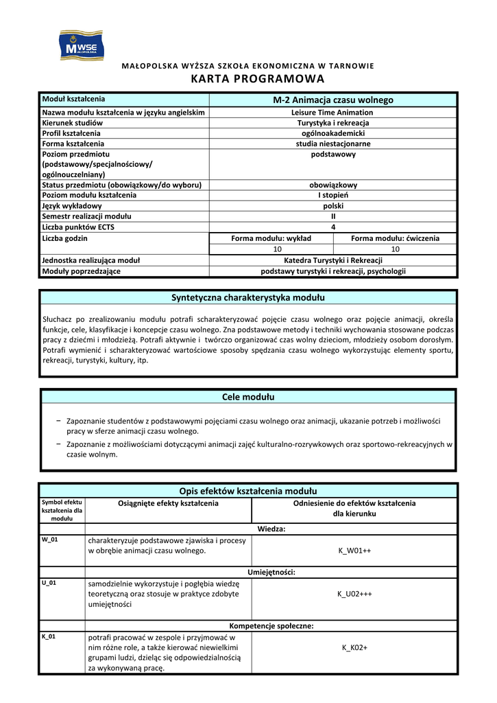 M AŁ O PO L S K A WYŻ SZ A S ZK OŁ A E K ON OM I CZN A W TA RN O WI E KARTA PROGRAMOWA Moduł kształcenia M-2 Animacja czasu wolnego Nazwa modułu kształcenia w języku angielskim Kierunek studiów Profil kształcenia Forma kształcenia Poziom przedmiotu (podstawowy/specjalnościowy/ ogólnouczelniany) Status przedmiotu (obowiązkowy/do wyboru) Poziom modułu kształcenia Język wykładowy Semestr realizacji modułu Liczba punktów ECTS Liczba godzin Jednostka realizująca moduł Moduły poprzedzające Leisure Time Animation Turystyka i rekreacja ogólnoakademicki studia niestacjonarne podstawowy obowiązkowy I stopień polski II 4 Forma modułu: wykład Forma modułu: ćwiczenia 10 10 Katedra Turystyki i Rekreacji podstawy turystyki i rekreacji, psychologii Syntetyczna charakterystyka modułu Słuchacz po zrealizowaniu modułu potrafi scharakteryzować pojęcie czasu wolnego oraz pojęcie animacji, określa funkcje, cele, klasyfikacje i koncepcje czasu wolnego. Zna podstawowe metody i techniki wychowania stosowane podczas pracy z dziećmi i młodzieżą. Potrafi aktywnie i twórczo organizować czas wolny dzieciom, młodzieży osobom dorosłym. Potrafi wymienić i scharakteryzować wartościowe sposoby spędzania czasu wolnego wykorzystując elementy sportu, rekreacji, turystyki, kultury, itp. Cele modułu − Zapoznanie studentów z podstawowymi pojęciami czasu wolnego oraz animacji, ukazanie potrzeb i możliwości pracy w sferze animacji czasu wolnego. − Zapoznanie z możliwościami dotyczącymi animacji zajęć kulturalno-rozrywkowych oraz sportowo-rekreacyjnych w czasie wolnym. Opis efektów kształcenia modułu Symbol efektu kształcenia dla modułu Osiągnięte efekty kształcenia Odniesienie do efektów kształcenia dla kierunku Wiedza: W_01 charakteryzuje podstawowe zjawiska i procesy w obrębie animacji czasu wolnego. K_W01++ Umiejętności: U_01 K_01 samodzielnie wykorzystuje i pogłębia wiedzę teoretyczną oraz stosuje w praktyce zdobyte umiejętności Kompetencje społeczne: potrafi pracować w zespole i przyjmować w nim różne role, a także kierować niewielkimi grupami ludzi, dzieląc się odpowiedzialnością za wykonywaną pracę. K_U02+++ K_K02+ Treści kształcenia modułu Forma modułu: wykład Forma modułu: ćwiczenia 1. Definicje podstawowych pojęć: czas wolny, animacja czasu wolnego, funkcje czasu wolnego, funkcje animacji. Czas wolny a animacja. 2. Wybrane koncepcje czasu wolnego: klasyczna, społeczna, kładąca nacisk na obligatoryjność czynności i zachowań, związana ze stanem ducha i umysłu, jako przeciwieństwo pracy. 3. Determinanty zachowań wolnoczasowych. 4. Istota i zadania wychowania. Naczelne cele wychowania oraz wychowanie do czasu wolnego. 5. Wychowanie w świetle teorii osobowości behawioralnej, humanistycznej, psychospołecznej. 6. Rola i znaczenie środowisk wychowawczych w wychowaniu do czasu wolnego i przez czas wolny. 7. Wychowanie a kształtowanie postaw prozdrowotnych. 1. Wprowadzenie do przedmiotu. Zarys rozwoju animacji. Omówienie zawodowej sylwetki animatora czasu wolnego, predyspozycji zawodowych. Typy osobowościowe animatorów. 2. Psychologiczne i pedagogiczne podstawy pracy z ludźmi (zachowania, komunikacja, motywacja, autoprezentacja itp. ). 3. Zakres obowiązków, odpowiedzialności oraz potrzeb animatorów. 4. Metodyka i technika pracy animatora z dziećmi, z młodzieżą, z osobami dorosłymi. Plan pracy animatora czasu wolnego oraz organizacja zajęć rekreacyjnych. 5. Propozycje gier i zabaw dla dzieci, młodzieży, dorosłych. 6. Psychologiczne aspekty funkcjonowania grupy. 7. Zachowanie animatora w sytuacjach trudnych. Literatura podstawowa 1. Pięta J., Pedagogika czasu wolnego, Almamer, Warszawa 2008. 2. Litwicka P., Metodyka i technika pracy animatora czasu wolnego, Proksenia, Kraków 2010. Literatura uzupełniająca 1. Bączek J.B., Animacja czasu wolnego. Praktyczny podręcznik dla animatorów, Wyd. Stageman Polska, Warszawa 2011. Metody dydaktyczne Wykład – metoda podająca, prezentacja multimedialna, film; Ćwiczenia: praca indywidualna, praca w grupach, prezentacje multimedialne, projekt.