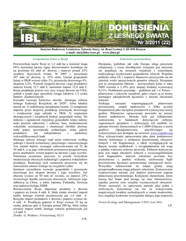 Instytut Badawczy Leśnictwa, Sękocin Stary, ul. Braci Leśnej 3, 05-090 Raszyn e-mail: [email protected] www.ibles.pl Gospodarka leśna w Rosji Zalesienia przemyślane Powierzchnia lasów Rosji to 1,2 mld ha a lesistość kraju 69%, natomiast łączny zapas drzewostanów kształtuje się na poziomie 82 mld m3 drewna i stanowi ponad 22% zasobów drzewnych świata. W 2007 r. pozyskano 207 mln m3 drewna, tj. 32% etatu. Udział gospodarki leśnej w PKB wynosi tylko 1%, przemysłu drzewnego 4%, eksportu 3,2%. Wartość eksportu drewna i jego produktów stanowi kwotę 15,7 mld €, natomiast import 12,9 mln €. Rosja produkuje prawie trzy razy więcej drewna niż USA, jednak z tytułu jego sprzedaży osiąga zaledwie 1/3 zysku Stanów Zjednoczonych. Kierunki rozwoju leśnictwa określa „Strategia sektora leśnego Federacji Rosyjskiej do 2020”, która kładzie nacisk na: 1) stabilizację zarządzania lasami, 2) zastąpienie importu przez krajową produkcję przemysłu drzewnego i zwiększenie jego udziału w PKB, 3) wspieranie ekologicznych i socjalnych funkcji gospodarki leśnej. Do słabości i ograniczeń rosyjskiej gospodarki leśnej należą: niski poziom odnowień i ochrony lasu, niedostateczne wskaźniki mechanizacji i chemizacji obróbki drewna, mały popyt, przestarzałe technologie, niska jakość produktów, zła infrastruktura i niedobory wykwalifikowanych kadr. Strategię sektora leśnego rząd może realizować według jednego z dwóch scenariuszy: pasywnego i innowacyjnego. Ten ostatni będzie wymagał zainwestowania od 32 do 54 mld €, a za jego wdrożeniem przemawia prognozowany przez analityków wzrost popytu na drewno i jego wyroby. Natomiast scenariusz pasywny to przede wszystkim modernizacja obecnych technologii i poprawa wskaźników produkcji. Realizacja tych zamierzeń przyczyni się do umocnienia sektora leśnego na rosyjskim rynku. Istotnym czynnikiem rozwoju gospodarki i przemysłu drzewnego jest eksport drewna i jego wyrobów. Już obecnie wynosi on 50 mln m3 rocznie, co stanowi 25% światowego handlu surowcem drzewnym. Głównym jego odbiorcą są Chiny, a także Japonia, Finlandia, Szwecja oraz państwa byłego ZSRR Równocześnie Rosja importuje produkty z drewna i papieru na kwotę 4 mld €. Stale rośnie również import mebli, którego wartość przekroczyła już 1,4 mld €. Rosyjski import produktów z drewna i papieru wynosi ok. 4 mld €. Produkcja papieru w Rosji wynosi 35 kg na osobę, podczas gdy w Europie ponad 200 kg. Stale rośnie również import mebli, którego wartość przekroczyła już 1,4 mld €. Źródło: G. Walkner, Forstzeitung, 02/11 A.K. Hiszpania, podobnie jak cała Europa ulega procesom urbanizacji, z czym nieodłącznie związane jest starzenie się populacji na terenach wiejskich i zaniechanie tradycyjnego użytkowania gospodarstw rolnych. Wspólna polityka rolna UE i wsparcie finansowe przyczyniło się do zalesień wielu opuszczonych gruntów rolnych. Hiszpania jest tu europejskim liderem – powierzchnia leśna w roku 2009 wzrosła o 2,19% przy unijnej średniej wynoszącej 0,51%. Problemem pozostaje – podobnie jak i w Polsce – planowanie i celowość nasadzeń, gdyż często są to tereny niemające jakiejkolwiek łączności z innymi obszarami leśnymi. Szukając narzędzi wspomagających planowanie przestrzenne, zespół naukowców z kilku uczelni hiszpańskich jako narzędzie postanowił wykorzystać teorię grafów. Pilotażowe opracowanie powstało na terenie dwóch nadleśnictw. Metoda była już kilkakrotnie zastosowana w badaniach dotyczących ochrony zagrożonych gatunków i waloryzacji ich siedlisk, co opisano również Doniesieniach nr 1/2009 (Głuszec a teoria grafów). Oprogramowanie umożliwiające jej wykorzystanie jest dostępne na serwerze www.conefor.org. Przy wykonywaniu opracowania jako dane podstawowe służyły informacje o strukturze przestrzennej obszarów leśnych i ich fragmentacji, a także występujących na danym terenie siedliskach, z uwzględnieniem ich wagi z punktu widzenia ochrony przyrody. Efektem końcowym prac jest mapa obszarów rolnych z wyszczególnieniem tych fragmentów, których zalesienie powinno być priorytetowe z punktu widzenia zachowania bądź przywrócenia łączności przestrzennej istniejących lasów. Wszystkie zobrazowane na mapie grunty mają przyporządkowaną rangę pilności zalesienia. Zastosowanie wypracowanej metody jest dopiero pierwszym etapem planowania przestrzennego. Kolejnymi elementami, które muszą być brane pod uwagę, są: stan własnościowy, aspekty prawne oraz socjalne wyznaczonych obszarów. Warto zauważyć, że opisywana metoda jako jedna z nielicznych, koncentruje się nie na wskazywaniu negatywnych trendów zachodzących w stanie środowiska, lecz znajduje konkretne rozwiązania służące jego poprawie. Forest Ecology and Management 1/2011 (vol 261); I.P. autor projektu Perter Neuman ze Szwajcarskiego Centrum Badań nad Pszczołami – „Nie ma gwałtownego załamania zapylania, ale katastrofa jest blisko. Musimy działać, aby zapewnić bezpieczeństwo następnym pokoleniom”. Szacuje się, że pszczoły i inne zwierzęta zapylające, jak motyle, chrząszcze czy ptaki, wykonują w ciągu roku pracę na rzecz człowieka wartą 153 mld euro – około 9,5% całkowitej produkcji spożywczej. „Ze 100 gatunków uprawnych, zapewniających 90% żywności światowej, ponad 70 jest zapylanych przez pszczoły” – stwierdził szef UNEP w swoim oświadczeniu - „Ludzkość stworzyła iluzję, że w XXI stuleciu technologia będzie na tyle rozwinięta, by uniezależnić się od sił przyrody. Na przykładzie pszczół widać, że w rzeczywistości jesteśmy bardziej, a nie mniej zależni od natury”. W raporcie zachęca się do przestawiania rolnictwa na bardziej ekologiczne - niezależne od insektycydów, odporniejsze na zagrożenia. Według UNEP rolnicy powinni być zachęcani do pozostawiania części ziemi bez upraw, by przywrócić 