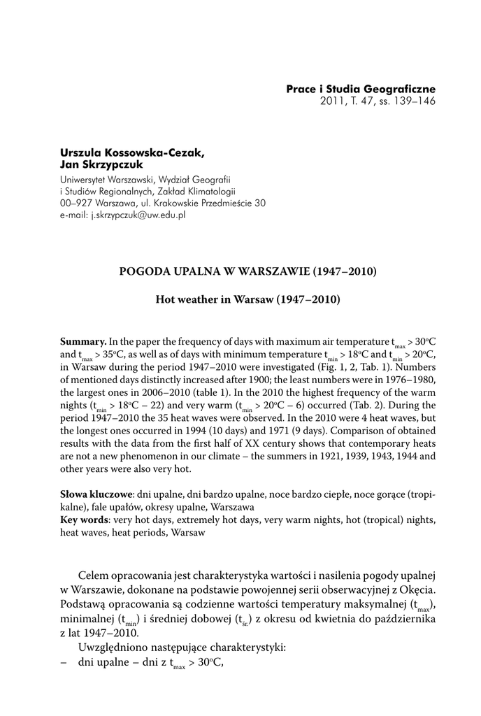 Prace i Studia Geograficzne 2011, T. 47, ss. 139–146 Urszula Kossowska-Cezak, Jan Skrzypczuk Uniwersytet Warszawski, Wydział Geografii i Studiów Regionalnych, Zakład Klimatologii 00–927 Warszawa, ul. Krakowskie Przedmieście 30 e-mail: [email protected] POGODA UPALNA W WARSZAWIE (1947–2010) Hot weather in Warsaw (1947–2010) Summary. In the paper the frequency of days with maximum air temperature tmax > 30oC and tmax > 35oC, as well as of days with minimum temperature tmin > 18oC and tmin > 20oC, in Warsaw during the period 1947–2010 were investigated (Fig. 1, 2, Tab. 1). Numbers of mentioned days distinctly increased after 1900; the least numbers were in 1976–1980, the largest ones in 2006–2010 (table 1). In the 2010 the highest frequency of the warm nights (tmin > 18oC – 22) and very warm (tmin > 20oC – 6) occurred (Tab. 2). During the period 1947–2010 the 35 heat waves were observed. In the 2010 were 4 heat waves, but the longest ones occurred in 1994 (10 days) and 1971 (9 days). Comparison of obtained results with the data from the first half of XX century shows that contemporary heats are not a new phenomenon in our climate – the summers in 1921, 1939, 1943, 1944 and other years were also very hot. Słowa kluczowe: dni upalne, dni bardzo upalne, noce bardzo ciepłe, noce gorące (tropikalne), fale upałów, okresy upalne, Warszawa Key words: very hot days, extremely hot days, very warm nights, hot (tropical) nights, heat waves, heat periods, Warsaw Celem opracowania jest charakterystyka wartości i nasilenia pogody upalnej w Warszawie, dokonane na podstawie powojennej serii obserwacyjnej z Okęcia. Podstawą opracowania są codzienne wartości temperatury maksymalnej (tmax), minimalnej (tmin) i średniej dobowej (tśr.) z okresu od kwietnia do października z lat 1947–2010. Uwzględniono następujące charakterystyki: – dni upalne – dni z tmax > 30oC, 140 Urszula Kossowska-Cezak, Jan Skrzypczuk dni bardzo upalne – dni z tmax > 35oC noce bardzo ciepłe – dni z tmin > 18oC noce gorące (tropikalne) – dni z tmin > 20oC doby tropikalne – dni z tmax > 30oC i tmin > 20oC, fale upałów – ciągi przynajmniej 3 kolejnych dni upalnych, okresy upalne – okresy przynajmniej 3-dniowe ze średnią tmax ≥ 30oC, podczas których dni upalne stanowią przynajmniej połowę, a ciąg dni gorących między upalnymi nie przekracza 3 dni. Ponadto jako charakterystyki pomocnicze podano liczby dni gorących (tmax > 25oC) i nocy ciepłych (tmin > 15oC). Dni upalne i bardzo upalne (Słownik... 2003, Kossowska-Cezak 2003). W wieloleciu 1947–2010 średnio w roku było 38 dni gorących, spośród których zaledwie 5 stanowiło dni upalne; dni bardzo upalne pojawiały się średnio raz na 5 lat (tab. 1). Liczba dni upalnych w poszczególnych latach była bardzo zróżnicowana – od całkowitego braku do 22 (2006 r.) (ryc. 1). Lata bez dni upalnych pojawiały się tylko do roku 1980, a szczególnie małą ich częstością wyróżniło się 5-lecie 1976–1980. Liczba dni upalnych wyraźnie wzrosła po roku 1990, a największą ich częstością odznaczało się ostatnie 5-lecie 2006–2010 (tab. 1). W tym to 5-leciu dni upalnych było prawie o 10 więcej niż w 5-leciu 1976–1980 i dwukrotnie więcej niż przeciętnie w całym wieloleciu. Dni bardzo upalnych w wieloleciu 1947–2010 zanotowano 13 (tab. 2); przed rokiem 1990 wystąpiły zaledwie 3 spośród nich. Maksimum absolutne temperatury 36,4oC zanotowano 1 VIII 1994 r. – – – – – – Ryc. 1. Liczba dni upalnych (tmax > 30oC) Fig. 1. Number of the very hot days (tmax > 30oC) Pogoda upalna w Warszawie (1947–2010) 141 Tabela 1. Średnia liczba dni gorących, upalnych i bardzo upalnych oraz nocy ciepłych, bardzo ciepłych i gorących w wieloleciu 1947–2010 oraz w 5-leciach o najchłodniejszych (1976–1980) i najcieplejszych (2006–2010) sezonach letnich (Warszawa-Okęcie) Table 1. Mean numbers of hot, very hot and extremely hot days and warm, very warm and hot nights in the multiyear period 1947–2010 and in the 5-year periods with the coldest (1976–1980) and the warmest (2006–2010) summers (WarszawaOkęcie) Liczba dni IV V VI VII VIII IX X IV–X 1947–2010 (tśr. VI-VIII = 17,8oC) tmax > 25oC 0,7 3,7 8,4 12,5 10,9 2,6 0,1 38,3 tmax > 30 C 0,0 0,2 1,0 2,4 1,6 0,1 – 5,4 tmax > 35oC – – 0,0 0,1 0,1 – – 0,2 tmin > 15 C – 0,7 4,3 8,7 7,0 0,6 – 20,9 tmin > 18oC – 0,0 0,5 1,6 0,7 0,0 – 2,7 tmin > 20oC – – 0,0 0,2 0,1 – – 0,3 o o 1976–1980 (tśr. VI-VIII = 16,5oC) tmax > 25oC 0,2 3,6 10,0 6,2 6,2 1,8 – 28,0 tmax > 30 C – 0,2 0,8 0,4 – – – 1,4 tmax > 35oC – – – – – – – – tmin > 15 C – 0,8 4,6 4,8 4,6 – – 14,8 tmin > 18oC – – – 0,2 – – – 0,2 tmin > 20oC – – – – – – – – o o 2006–2010 (tśr. VI-VIII = 18,9oC) tmax > 25oC 0,2 2,8 11,6 19,0 11,6 2,2 – 47,4 tmax > 30 C – 0,6 1,8 7,4 1,2 – – 11,0 tmax > 35oC – – – 0,4 – – – 0,4 tmin > 15 C – 1,8 5,8 16,2 13,0 1,0 – 37,8 tmin > 18oC – 0,2 1,8 6,2 1,8 – – 10,0 tmin > 20oC – – 0,2 1,4 0,2 – – 1,8 o o Dni upalne występują w zasadzie od maja do sierpnia, choć na początku wielolecia, w latach 1947–1950 zdarzyły się pojedyncze przypadki już w maju i jeszcze we wrześniu; najwięcej jest ich w lipcu. Dni bardzo upalne pojawiają się wyłącznie od czerwca do sierpnia. Urszula Kossowska-Cezak, Jan Skrzypczuk 142 Tabela 2. Charakterystyki termiczne (oC) dni bardzo upalnych (tmax > 35oC) (Warszawa-Okęcie, 1947–2010) Table 2. Thermic characteristics (oC) of the extremely hot days (tmax > 35oC) (WarszawaOkęcie, 1947–2010) Data tmax tmin tśr. 1. 7 VIII 1952 35,1 17,0 24,6 2. 13 VII 1959 35,1 17,3 27,2 3. 25 VII 1963 35,3 18,3 28,4 4. 9 VIII 1992 35,2 18,2 27,1 5. 10 VIII 1992 36,0 19,7 28,0 6. 29 VIII 1992 35,9 19,7 28,0 7. 29 VII 1994 35,1 15,3 26,9 8. 30 VII 1994 35,9 17,2 28,0 9. 31 VII 1994 35,8 17,9 27,9 10. 1 VIII 1994 36