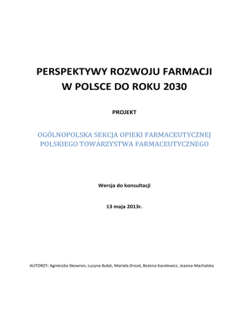 PERSPEKTYWY ROZWOJU FARMACJI W POLSCE DO ROKU 2030 PROJEKT OGÓLNOPOLSKA SEKCJA OPIEKI FARMACEUTYCZNEJ POLSKIEGO TOWARZYSTWA FARMACEUTYCZNEGO Wersja do konsultacji 13 maja 2013r. AUTORZY: Agnieszka Skowron, Lucyna Bułaś, Mariola Drozd, Bożena Karolewicz, Joanna Machalska OGÓLNOPOLSKA SEKCJA OPIEKI FARMACEUTYCZNEJ POLSKIEGO TOWARZYSTWA FARMACEUTYCZNEGO 13 maja 2013r. Spis treści PREAMBUŁA ............................................................................................................................................ 3 CZĘŚĆ I. KIERUNKI ROZWOJU PRAKTYKI FARMACEUTYCZNEJ W APTEKACH OGÓLNODOSTĘPNYCH ... 4 Przeglądy leków................................................................................................................................... 4 Systemy indywidualnego pakowania leków........................................................................................ 6 Edukacja pacjentów w aptekach ogólnodostępnych .......................................................................... 7 Przygotowanie leków w aptekach ....................................................................................................... 8 Programy opieki farmaceutycznej ....................................................................................................... 8 Opieka farmaceutyczna dla osób starszych .................................................................................... 8 Opieka farmaceutyczna dla pacjentów przewlekle chorych ........................................................... 9 Kontrola bezpieczeństwa stosowania leków bez recepty ................................................................... 9 Kontrola stosowania suplementów diety............................................................................................ 9 Profilaktyka i promocja zdrowia ........................................................................................................ 10 Przepisywanie recept przez farmaceutów ........................................................................................ 11 Certyfikacja farmaceutów i akredytacja aptek do prowadzenia dodatkowych usług ...................... 11 CZĘŚĆ II. DZIAŁANIA NA RZECZ ZWIĘKSZENIA ROLI FARMACEUTY W SYSTEMIE ZDROWOTNYM ....... 13 Włączenie farmaceutów w działania związane z polityką refundacyjną........................................... 13 Włączenie farmaceutów do zespołów medycznych zajmujących się pacjentami z wybranymi chorobami – diabetycy, astmatycy.................................................................................................... 14 Zwiększenie zaangażowania farmaceutów w monitorowanie działań niepożądanych leków ......... 14 Zwiększenie świadomości i zaangażowania farmaceutów w badania praktyki farmaceutycznej .... 14 CZĘŚĆ III. ZADANIA DLA INSTYTUCJI PAŃSTWA ORAZ ORGANIZACJI PUBLICZNYCH ............................ 16 Nowe zadania dla wybranych instytucji państwa ............................................................................. 16 Zadania dla Inspekcji Farmaceutycznej ......................................................................................... 16 Zadania dla Ministerstwa Zdrowia ................................................................................................ 17 Nowe zadania dla organizacji publicznych w farmacji – samorząd zawodowy, towarzystwa naukowe, fundacje i inne .................................................................................................................. 17 Zadania dla samorządu zawodowego ........................................................................................... 17 Zadania dla organizacji i stowarzyszeń naukowych ...................................................................... 18 Nowe zespoły i organy państwowe i/lub publiczne .......................................................................... 18 Wypracowanie stałej formy współpracy pomiędzy instytucjami państwa i organizacjami publicznymi i przedstawicielami prywatnych przedsiębiorców ........................................................ 19 Zmiana prawa .................................................................................................................................... 19 Wersja do konsultacji Strona 2 OGÓLNOPOLSKA SEKCJA OPIEKI FARMACEUTYCZNEJ POLSKIEGO TOWARZYSTWA FARMACEUTYCZNEGO 13 maja 2013r. PREAMBUŁA W każdym systemie zdrowotnym farmakoterapia stanowi podstawową metodę terapeutyczną, zlecaną obecnie już nie tylko przez lekarzy, ale także przez innych członków zespołu medycznego. Jednak to farmaceuci posiadają kompleksową wiedzę nie tylko na temat mechanizmu działania leku i jego losów w organizmie, lecz również czynników gwarantujących utrzymanie jego jakości i stabilności w środowisku, w którym jest stosowany. Współczesne społeczeństwo oczekuje od farmaceutów większego zaangażowania w monitorowanie i nadzorowanie farmakoterapii. Międzynarodowe dokumenty jednoznacznie definiują bowiem farmaceutę jako strażnika bezpieczeństwa i skuteczności farmakoterapii, nie bez powodu kwestie bezpieczeństwa stawiając na pierwszym miejscu. W czasach wyspecjalizowanych lekarzy, trudno nie docenić farmaceuty, którego wiedza obejmuje wiele aspektów związanych z farmakodynamiką, farmakokinetyką czy właściwościami fizykochemicznymi leków, więc wszystkim tym, co wpływa na proces terapeutyczny. W zawodach zaufania publicznego, które zgodnie z przypisaną im rolą stoją na straży interesu publicznego, stawiając dobro społeczeństwa i poszczególnych jego jednostek, ponad interesy własnej grupy, istotne jest wskazywanie drogi, która gwarantuje realizację tego celu. Prestiż zawodu nie jest bowiem sumą prestiżu poszczególnych jego przedstawicieli, a nieprawidłowe, lub co gorsza nieetyczne działania niewielkiej grupy przedstawicieli danego zawodu, mogą poważnie osłabić pozytywne