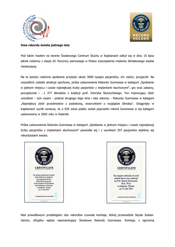 Dwa rekordy świata jednego lata Pod takim hasłem na terenie Światowego Centrum Słuchu w Kajetanach odbył się w dniu 15 lipca piknik rodzinny z okazji 20. Rocznicy pierwszego w Polsce wszczepienia implantu ślimakowego osobie niesłyszącej. Na to bardzo rodzinne spotkanie przybyło około 3000 tysiące pacjentów, ich rodzin, przyjaciół. Na wszystkich czekały atrakcje sportowe, próba ustanowienia Rekordu Guinnessa w kategorii „Spotkanie w jednym miejscu i czasie największej liczby pacjentów z implantami słuchowymi”, gry oraz zabawy, poczęstunek i …1 377 ślimaków z kolekcji prof. Henryka Skarżyńskiego. Ten imponujący zbiór umożliwił – tym razem - pobicie drugiego tego dnia i lata rekordu - Rekordu Guinnessa w kategorii „Największy zbiór przedmiotów z podobizną, wizerunkiem o wyglądzie ślimaka”. Osiągnięty w Kajetanach wynik oznacza, że o 920 sztuk pobity został poprzedni rekord Guinnessa w tej kategorii ustanowiony w 2002 roku w Holandii. Próba ustanowienia Rekordu Guinnessa w kategorii „Spotkanie w jednym miejscu i czasie największej liczby pacjentów z implantami słuchowymi” powiodła się i z wynikiem 557 pacjentów staliśmy się rekordzistami świata. Nad prawidłowym przebiegiem obu rekordów czuwała komisja, której przewodziła Seyda SubasiGemici, oficjalny sędzia reprezentujący Światowe Rekordy Guinnessa. Komisja, z ogromną dokładnością zliczała wszystkich uczestników oraz przedmioty, dbając przy tym o spełnienie niezwykle restryktywnych wymogów m.in. specjalnych zaświadczeń lekarskich, których wielu pacjentów nie miało ze sobą. Mimo, iż nie wszyscy implantowani zdołali dojechać na godzinę 12.00 i spóźnili się, to rekord został ustanowiony. Pierwszych 20 najmłodszych pacjentów miało także niepowtarzalną okazję brać udział – wspólnie z panią Teresą Sukniewicz-Kleiber, wybitną polską lekkoatletką, która trzykrotnie ustanawiała rekord świata w biegu na 100 m przez płotki - w otwarciu „Parku 10 000 kroków”. Ideę tego Parku w Kajetanach zrealizował Prof. Henryk Skarżyński i Zespół Światowego Centrum Słuchu, a inicjatorami i osobami wspierającymi ten projekt byli Teresa Sukniewicz-Kleiber, Konsultanci Krajowi, Wybitni Eksperci w różnych dziedzinach medycyny i Przewodniczący Komitetów Naukowych Polskiej Akademii Nauk - prof. Grzegorz Opolski, prof. Bolesław Samoliński, prof. Janina Stępińska, prof. Marian Zembala i prof. Tomasz Zdrojewski. Dużym zainteresowaniem cieszyło się stoisko plastyczne, na którym dzieci wspólnie z rodzicami mogły przygotować rysunki i malowanki. Do namiotu Klubu "Ślimaczek" na prowadzone tam konsultacje ze specjalistami: inżynierami klinicznymi, psychologami, surdopedagogami, surdologopedami, lekarzami, genetykami molekularnymi przyszło kilkaset osób. A w gościnnych progach „Kawiarenki Ślimaczek” osoby implantowane mogły usiąść i prowadzić swobodne rozmowy, poznawać nowych przyjaciół, podzielić się swoimi wrażeniami słuchowymi. W namiocie znajdowała się także Galeria Doświadczeń, gdzie osoby implantowane duże i małe mogły się wypowiedzieć na temat swoich doświadczeń pisemnie. Na koniec można było usiąść w zaciszu namiotu Poczty Polowej i napisać „Pozdrowienia z Kajetan”. nadawców wysłano ponad 1500 pocztówek do różnych nadawców.