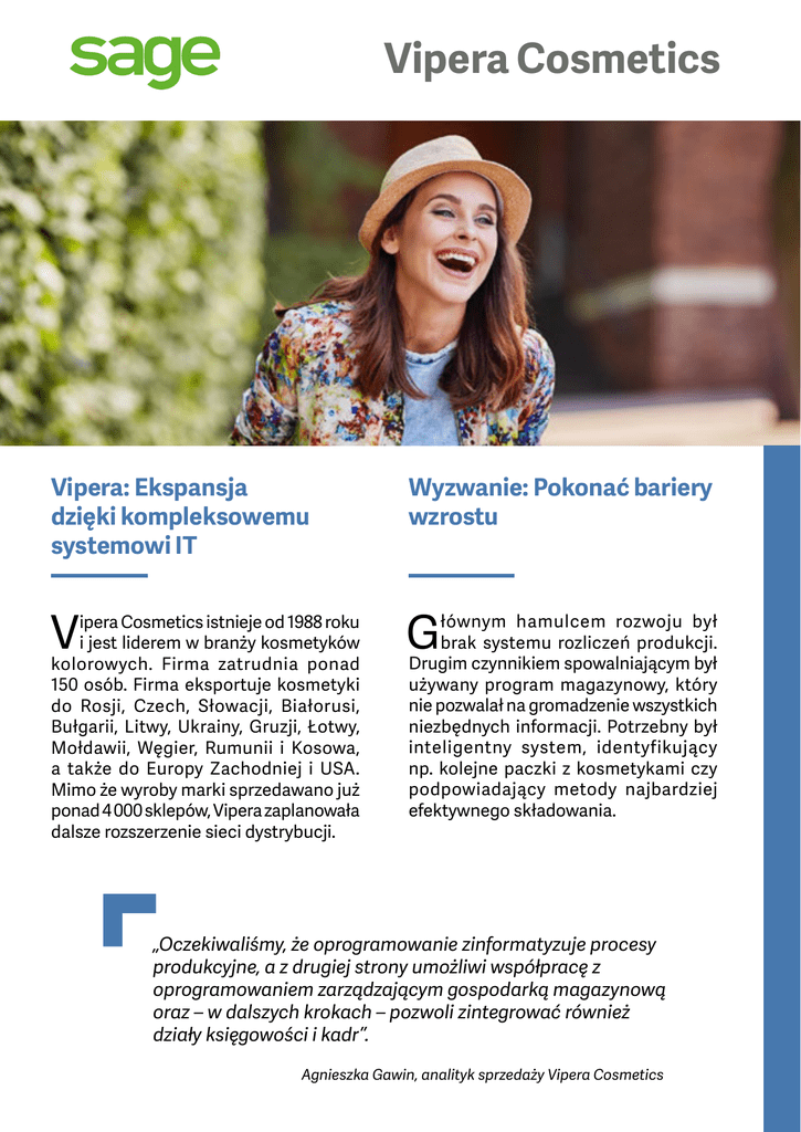 Vipera Cosmetics Vipera: Ekspansja dzięki kompleksowemu systemowi IT Wyzwanie: Pokonać bariery wzrostu V G ipera Cosmetics istnieje od 1988 roku i jest liderem w branży kosmetyków kolorowych. Firma zatrudnia ponad 150 osób. Firma eksportuje kosmetyki do Rosji, Czech, Słowacji, Białorusi, Bułgarii, Litwy, Ukrainy, Gruzji, Łotwy, Mołdawii, Węgier, Rumunii i Kosowa, a także do Europy Zachodniej i USA. Mimo że wyroby marki sprzedawano już ponad 4 000 sklepów, Vipera zaplanowała dalsze rozszerzenie sieci dystrybucji. łównym hamulcem rozwoju był brak systemu rozliczeń produkcji. Drugim czynnikiem spowalniającym był używany program magazynowy, który nie pozwalał na gromadzenie wszystkich niezbędnych informacji. Potrzebny był inteligentny system, identyfikujący np. kolejne paczki z kosmetykami czy podpowiadający metody najbardziej efektywnego składowania. „Oczekiwaliśmy, że oprogramowanie zinformatyzuje procesy produkcyjne, a z drugiej strony umożliwi współpracę z oprogramowaniem zarządzającym gospodarką magazynową oraz – w dalszych krokach – pozwoli zintegrować również działy księgowości i kadr”. Agnieszka Gawin, analityk sprzedaży Vipera Cosmetics Vipera Cosmetics Wybór partnera kluczem do sukcesu Korzyści z wdrożenia Wybór padł na SerwNet, Złotego Autoryzowanego Partnera Sage. Zdecydowano się na wprowadzenie systemu Sage Symfonia ERP, z modułami: Zarządzanie Produkcją oraz Handel, Finanse i Księgowość, Kadry i Płace. Udane, trwające zaledwie 4 miesiące wdrożenie systemu, spowodowało, że Vipera zdecydowała się na kolejne moduły – Środki Trwałe oraz Analizy Finansowe. Pierwotnym założeniem było usprawnienie procesu produkcji poprzez jego informatyzację. Dzięki temu zautomatyzowano większość czynności, które do tej pory były wykonywane ręcznie. To posunięcie przyniosło znaczne oszczędności czasu. Nowy system był ponadto łatwiejszy w obsłudze i konserwacji, dzięki czemu praca stała się przyjemniejsza. „Często klient w rozmowach z nami patrzy na nowy system z perspektywy starego. Nie ujawnia pewnych istotnych informacji, uważając je za oczywiste. Kluczową kwestią pierwszego etapu wdrożenia było więc dokładne zrozumienie, jak pracuje klient i czego rzeczywiście potrzebuje”. Leszek Antolik właściciel firmy SerwNet, implementującej System Sage Symfonia ERP