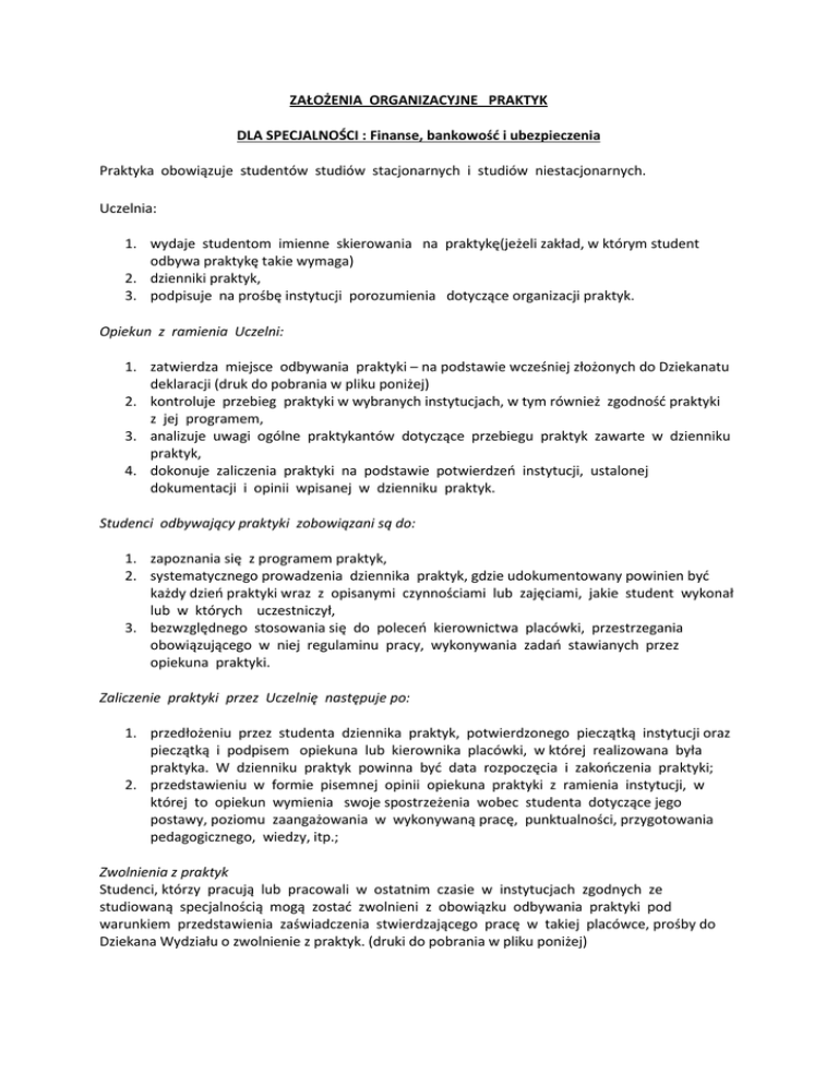 ZAŁOŻENIA ORGANIZACYJNE PRAKTYK DLA SPECJALNOŚCI : Finanse, bankowość i ubezpieczenia Praktyka obowiązuje studentów studiów stacjonarnych i studiów niestacjonarnych. Uczelnia: 1. wydaje studentom imienne skierowania na praktykę(jeżeli zakład, w którym student odbywa praktykę takie wymaga) 2. dzienniki praktyk, 3. podpisuje na prośbę instytucji porozumienia dotyczące organizacji praktyk. Opiekun z ramienia Uczelni: 1. zatwierdza miejsce odbywania praktyki – na podstawie wcześniej złożonych do Dziekanatu deklaracji (druk do pobrania w pliku poniżej) 2. kontroluje przebieg praktyki w wybranych instytucjach, w tym również zgodność praktyki z jej programem, 3. analizuje uwagi ogólne praktykantów dotyczące przebiegu praktyk zawarte w dzienniku praktyk, 4. dokonuje zaliczenia praktyki na podstawie potwierdzeń instytucji, ustalonej dokumentacji i opinii wpisanej w dzienniku praktyk. Studenci odbywający praktyki zobowiązani są do: 1. zapoznania się z programem praktyk, 2. systematycznego prowadzenia dziennika praktyk, gdzie udokumentowany powinien być każdy dzień praktyki wraz z opisanymi czynnościami lub zajęciami, jakie student wykonał lub w których uczestniczył, 3. bezwzględnego stosowania się do poleceń kierownictwa placówki, przestrzegania obowiązującego w niej regulaminu pracy, wykonywania zadań stawianych przez opiekuna praktyki. Zaliczenie praktyki przez Uczelnię następuje po: 1. przedłożeniu przez studenta dziennika praktyk, potwierdzonego pieczątką instytucji oraz pieczątką i podpisem opiekuna lub kierownika placówki, w której realizowana była praktyka. W dzienniku praktyk powinna być data rozpoczęcia i zakończenia praktyki; 2. przedstawieniu w formie pisemnej opinii opiekuna praktyki z ramienia instytucji, w której to opiekun wymienia swoje spostrzeżenia wobec studenta dotyczące jego postawy, poziomu zaangażowania w wykonywaną pracę, punktualności, przygotowania pedagogicznego, wiedzy, itp.; Zwolnienia z praktyk Studenci, którzy pracują lub pracowali w ostatnim czasie w instytucjach zgodnych ze studiowaną specjalnością mogą zostać zwolnieni z obowiązku odbywania praktyki pod warunkiem przedstawienia zaświadczenia stwierdzającego pracę w takiej placówce, prośby do Dziekana Wydziału o zwolnienie z praktyk. (druki do pobrania w pliku poniżej) PROGRAM PRAKTYKI DLA SPECJALNOŚCI : Finanse, bankowość i ubezpieczenia Studenckie praktyki stanowią integralną część kształcenia w WWSSE w Środzie Wlkp. Doświadczenia z praktyk uważane są za jedne z najważniejszych działań profesjonalnych w jakich uczestniczą studenci w trakcie realizacji programu studiów. Praktykanci otrzymują możliwość zastosowania wiedzy teoretycznej uzyskanej w toku studiów w praktyce funkcjonowania danej placówki. Z uwagi na specyfikę wykonywanego, przyszłego zawodu, studenci są przygotowywani w sposób odpowiedzialny do podjęcia roli zawodowej. Każdy student w czasie trwania studiów musi odbyć bezwzględnie 3 tygodnie praktyk zawodowych ciągłych. Studenci specjalności: Finanse, bankowość i ubezpieczenia mogą odbywać praktykę w: przedsiębiorstwach i instytucjach, w których mają miejsce procesy finansowo - gospodarcze lub występują działania związane z obsługą podmiotów gospodarczych. W działach finansowo księgowych przedsiębiorstw, bankach i instytucjach finansowych, urzędach skarbowych. Studenci specjalności Finanse, bankowość i ubezpieczenia odbywający praktykę w przedsiębiorstwach zapoznają się z dokumentacją księgową, poznają metody analizy sytuacji ekonomicznej przedsiębiorstwa i zbierają materiały związane bezpośrednio z tematem pracy licencjackiej. Studenci odbywający praktykę w bankach poznają strukturę organizacyjną banku, działalność kredytową i depozytową banku. Praktyka w jednostkach samorządu terytorialnego umożliwi zapoznanie się z zadaniami realizowanymi w tych jednostkach oraz źródłami ich finansowania.