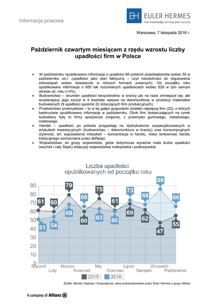 Informacja prasowa Warszawa, 7 listopada 2016 r. Październik czwartym miesiącem z rzędu wzrostu liczby upadłości firm w Polsce W październiku opublikowano informacje o upadłości 66 polskich przedsiębiorstw wobec 55 w październiku ub.r. (upadłości jako stan faktyczny – czyli niezdolności do regulowania zobowiązań wobec dostawców w różnych formach prawnych). Od początku roku opublikowano informacje o 655 tak rozumianych upadłościach wobec 629 w tym samym okresie ub. roku (+4%). Budownictwo – strumień upadłości bezpośrednio w branży jak na razie zmniejszył się, ale wcześniejszy jego szczyt w II kwartale wpływa na dekoniunkturę w produkcji materiałów budowlanych (9 upadłości spośród 22 dotyczących firm produkcyjnych). Przetwórstwo przemysłowe – to w tej gałęzi gospodarki działało najwięcej firm (22), o których bankructwie opublikowano informacje w październiku. Obok firm dostarczających na rynek budowlany były to firmy spożywcze (mięsne), z przemysłu gumowego, metalowego, meblowego. Handel – upadłości po połowie przypadają na dystrybutorów wyspecjalizowanych w artykułach inwestycyjnych (budownictwo – dekoniunktura w branży) oraz konsumpcyjnych (żywność, art. wyposażenia mieszkań – koncentracja w handlu, niska rentowność handlu tradycyjnego wzmacniana przez deflację). Województwa: do grupy województw, gdzie dotychczas wyraźnie rosła liczba upadłości (wschód i cały Śląsk) dołączyły województwa małopolskie i podkarpackie. Źródło: Monitor Sądowy i Gospodarczy, dane przeanalizowane przez Euler Hermes z grupy Allianz Źródło: Monitor Sądowy i Gospodarczy, dane przeanalizowane przez Euler Hermes z grupy Allianz Upadali producenci – nie radzący sobie z malejącym popytem i kapitałem zamrożonym w zapasach (dobra inwestycyjne), z niską rentownością w efekcie deflacji (m.in. producenci żywności) lub w efekcie… wielu potencjalnych błędów w zarządzaniu Stopniowy spadek liczby zamówień u producentów dóbr inwestycyjnych i wzrost zapasów pociągnął za sobą w efekcie kłopoty części wytwórców. W najliczniejszej wśród nich grupie firm dostarczających art. inwestycyjnych to efekt zmniejszenia produkcji budowlano–montażowej, której spadek wciąż oscyluje wokół -15% r/r. O problemach firm produkujących dobra inwestycyjne świadczą m.in. stopniowo zmniejszane przez nie tzw. minima logistyczne – dowóz do odbiorcy transportem producenta. Sygnały z rynku m.in. producentów okien wskazują, iż niegdyś transport producenta (w tym konkretnym przypadku) zapewniany był od zamówień o wartości 4,5 tys. zł netto, a z czasem granica ta spadała do 3 tys. zł, potem 2,5 tys., a obecnie wynosi formalnie 1 tys. zł, a i tak producent gotowy jest dostarczyć na miejsce nawet pojedyncze okno… Źródło: Monitor Sądowy i Gospodarczy, dane przeanalizowane przez Euler Hermes z grupy Allianz Największe upadłości miały miejsce w przemyśle związanym z hodowlą i przetwórstwem mięsa (3 firmy o łącznym obrocie ponad 370 mln złotych). Problemy w branży mięsnej (ASF – problem na rynkach eksportowych, znaczne rozdrobnienie, duża konkurencja gospodarstw i przetwórców wielkoprzemysłowych z UE) nie mówią nam wszystkiego o ich przyczynach. Upadały bowiem również firmy produkcyjne z sektorów, które nie tylko nie przeżywają dekoniunktury jak budownictwo, ale nawet święcą kolejne tryumfy, w tym na lukratywnym rynku eksportowym – jak branża meblarska (2 upadłości w październiku) czy w sektorze wyrobów metalowych (części, konstrukcje – 3 firmy). To potwierdza tylko, iż upadłości mają nie tylko rynkowe podłoże (hossa-bessa), ale wiążą się z wieloma elementami potencjalnego ryzyka, które trudniej jednoznacznie wychwycić w porównaniu do wspomnianej koniunktury branżowej (a mogą to być kwestie np. błędów w zarządzaniu, przeinwestowania, złej struktury finansowania, zmian kadrowych – w tym kwestie sukcesji etc.). Brak inwestycji w samym przemyśle – potencjalne ryzyko niedopasowania do popytu, zwłaszcza na rynku eksportowym Wahania zapasów odczuwali jednak także producenci innych dóbr przemysłowych, co wiązać się może z brakiem inwestycji w samym przemyśle. Zapasy nie zawsze są oczywiście oznaką kłopotów ze sprzedażą a co za tym idzie kłopotów finansowych wytwórcy. Czasami do ich tworzenia skłaniają firmy dobre perspektywy - chęć skorzystania z nich z wyprzedzeniem przy wykorzystaniu obecnych mocy produkcyjnych czy długoterminowe zlecenia. Wzrost zapasów (obserwowany zwłaszcza w I kwartale) zbiegł się bowiem ze zmniejszeniem inwestycji przedsiębiorstw o krajowej strukturze własnościowej (inwestują głównie firmy z kapitałem zagranicznym): w sytuacji niepewności mniejszym ryzykiem jest produkować „na magazyn” niż rozpoczynać inwestycje dla zwiększenia mocy produkcyjnych do realizacji zleceń „na zamówienie”. W obydwu przypadkach zamraża się kapitał, ale tworzenie zapasów jest jednak mniej kapitałochłonne. Efekty? Według badań NBP (Informacja o kondycji sektora przedsiębiorstw ze szczególnym uwzględnieniem stanu koniunktury w III kwartale 2016 r. oraz prognoz koniunktury na IV kwartał 2016 r.) w relacji rocznej i kwartalnej pogorszył się poziom zapasów niedopasowanych w przemyśle (posiada je obecnie 18,5% badanych firm). Zamówienia, które na dużą skalę napłynęły z zagranicy w I kw. i były realizowane w II kwartale sprawiły, że o ile wcześniej były nadmierne stany produktów gotowych, to po II kwartale w niektórych obszarach występował ich niedobór. Niedopasowanie finansowania? Inwestycje mimo dobrej kondycji finansowej polskich producentów (minimalnie zwiększył się odsetek firm rentownych) i ich znacznych zasobów finansowych wymagają nierzadko jednak wsparcia finansowego z zewnątrz. Co prawda opierając się na cytowanych wcześniej badaniach NBP moż