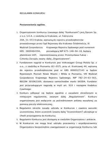 REGULAMIN KONKURSU Postanowienia ogólne. 1. Organizatorem konkursu (zwanego dalej “Konkursem”) jest0 Opcom Sp. z o.o. S.K.A. z siedzibą w Krakowie, ul. Fabryczna 20A, 31-553 Kraków, wpisana0 do rejestru przedsiębiorców prowadzonego przez Sąd Rejonowy dla Krakowa-Śródmieścia, XI Wydział Gospodarczy Krajowego Rejestru Sądowego pod numerem KRS : 0000464394, posiadającą NIP 675-148-94-18, będącą płatnikiem VAT, reprezentowaną przez: Przemysława Fuksę - Członka Zarządu zwany dalej „Organizatorem”. 2. Fundatorem nagród w Konkursie jest Volkswagen Group Polska Sp. z o.o., z siedzibą w Poznaniu (61-037), przy ul. Krańcowej 44, wpisaną do rejestru przedsiębiorców pod nr KRS 0000327143 w Sądzie Rejonowym Poznań Nowe Miasto i Wilda w Poznaniu, VIII Wydział Gospodarczy Krajowego Rejestru Sądowego, NIP 782-24-63-563, REGON 301062169, dostawca samochodów marki SKODA. Fundator jest przyrzekającym nagrodę w myśl art. 919 i następne Kodeksu Cywilnego. 3. Konkurs odbywać się będzie zgodnie z zasadami określonymi w niniejszym regulaminie, zwanym dalej „Regulaminem”. Konkurs organizowany jest wyłącznie za pośrednictwem ankiety wysyłanej za pomocą poczty elektronicznej. 4. Regulamin określa zasady udziału w Konkursie i zawiera warunki uczestnictwa, które uczestnik (zwany dalej "Uczestnikiem") akceptuje w chwili przystąpienia do Konkursu. 5. Regulamin Konkursu jest dostępny w siedzibie Organizatora i ankiecie. 6. W Konkursie nie mogą brać udziału pracownicy i współpracownicy Organizatora bezpośrednio zaangażowani w organizację Konkursu lub mający związek z jego organizacją oraz członkowie ich najbliższych rodzin, tj.: wstępni, zstępni, rodzeństwo, małżonkowie, rodzice małżonków i osoby pozostające z nimi w stosunku przysposobienia. Wyłączenie to dotyczy również pracowników innych podmiotów bezpośrednio zaangażowanych w organizację Konkursu. 7. Celem zapewnienia prawidłowej organizacji i przebiegu Konkursu, a w szczególności w celu dokonania oceny prawidłowości przebiegu Konkursu, Organizator powoła trzyosobową Komisję Konkursową. W skład Komisji Konkursowej wejdą osoby delegowane przez Organizatora. Nagrody. 8. 0Nagrodami 0są książki w formacie audio zwane dalej audiobookami z kolekcji SKODY, dostępnej pod adresem: audioteka.pl/skoda0 9. Zwycięzcom Konkursu nie przysługuje roszczenie o wypłatę wartości nagrody w gotówce lub zamiany utraconego uprawnienia na inne uprawnienie. Po upływie Konkursu Uczestnikom realizacja nagrody nie przysługuje. 10.Zwycięzcy Konkursu nie mają możliwości zamiany nagrody na inną nagrodę przez Organizatora. 11.Kod można zrealizować do dnia 31.12.2013. 12.Konkurs trwa do 19.12.2013. Warunki uczestnictwa. 13.Uczestnikiem Konkursu może zostać wyłącznie osoba, która otrzyma od Organizatora zaproszenie do Konkursu oraz specjalny kod logowania do ankiety. 14.Z zastrzeżeniem pkt 12 powyżej, Uczestnikiem Konkursu może być wyłącznie osoba fizyczna mająca ukończone 18 lat, posiadająca pełną zdolność do czynności prawnych, będąca konsumentem w myśl art. 221 Kodeksu Cywilnego, posiadająca miejsce stałego zamieszkania w Polsce oraz ważne prawo jazdy kategorii B. 15.Warunkiem przystąpienia do Konkursu jest zalogowanie się do ankiety przy użyciu specjalnego odpowiedzenie na kodu zadane otrzymanego pytania. 0 od Organizatora Uczestnik ma i możliwość przystąpienia do Konkursu tylko jeden raz. 16.Zabrania się uczestnikowi korzystania z kodów logowania innych zaproszonych do Konkursu osób. 17.Wszelkie uzasadnione nieprawidłowości w celu podejrzenia wpływania Organizatora na wynik dotyczące Konkursu mogą skutkować usunięciem Uczestnika z Konkursu. 18.Administratorem danych osobowych Uczestników jest Organizator Konkursu. 19.Dane osobowe Uczestników przetwarzane będą przez Organizatora zgodnie z postanowieniami ustawy z dnia 19 sierpnia 1997 r. o ochronie danych osobowych (Dz.U. z 2002 r., nr 101, poz. 926 z późn. zm.) wyłącznie w celach związanych z organizacją i prowadzeniem Konkursu, wyłonieniem zwycięzców oraz wręczeniem nagród. 20.Uczestnikom przysługuje prawo dostępu do danych, ich poprawiania oraz żądania usunięcia. Podanie danych jest dobrowolne, ale niezbędne do uzyskania nagród oraz rozpatrzenia ewentualnych reklamacji. 21.Uczestnictwo w Konkursie polega na spełnieniu oznaczonych w niniejszym Regulaminie zadań, z zastrzeżeniem, iż w ramach ich realizacji Uczestnicy obowiązujących mają przepisów obowiązek prawa, przestrzegania niniejszego wszystkich Regulaminu powszechnie przyjętych zwyczajowych zasad fair play. Przebieg Konkursu i zadania Uczestnika Konkursu. oraz 22.Uczestnik realizuje zadanie Konkursu logując się ankiety przesłanej za pośrednictwem poczty elektronicznej 23.Ankieta Konkursowa nie jest grą hazardową w rozumieniu ustawy z dnia 19 listopada 2009 r. o grach hazardowych (Dz. U. Nr 201, poz. 1540, z późn. zm.). 24.Zadanie konkursowe polega na: a. odpowiedzeniu na 7 pytań. 23.Zwycięzcami Konkursu zostaną osoby, które jako pierwsze udzieliły odpowiedzi na wszystkie zadane pytania. 24.W celu otrzymania nagrody Zwycięzca zobowiązany jest do podania, po wypełnieniu ankiety, numeru telefonu oraz adresu zamieszkania. Na podany adres wyłana zostanie nagroda pocieszenia w postaci karty z kodem umożliwiającej pobranie audiobooka. Odbiór nagród. 25.Po zakończeniu Konkursu zwycięzcy powiadomieni zostaną o fakcie wygranej oraz sposobie odbioru nagrody0 pocztą tradycyjną, w przypadku wygrania audiobooka. Podatek dochodowy od osób fizycznych 1. Organizator jako płatnik ponosi odpowiedzialność za zobowiązania podatkowe z tytułu podatku dochodowego od osób fizycznych, które powstały ze względu na organizację Konkursu i przyznanie nagród w Konkursie. 2. Nagrody zostaną wydane Zwycięzcom Konkursu zgodnie z przepisami ustawy o podatku dochodowym od osób fizycznych. 