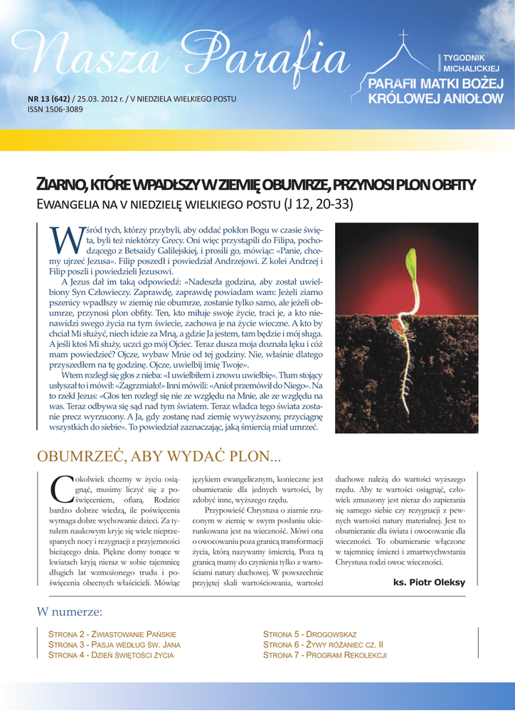 NR 13 •642• / 25.03. 2012 r. / V NIEDZIELA WIELKIEGO POSTU ISSN 1506!3089 Z!"#$%,&'(#)*+"-./05*0!)7!8%9:7#0),+#05$%/!+;%$%9<!'5 E"#$%&'(# $# ) $(&*+(&', "(&'-(&%4 74:;< (J 12, 20-33) W śród tych, którzy przybyli, aby oddać pokłon Bogu w czasie święta, byli też niektórzy Grecy. Oni więc przystąpili do Filipa, pochodzącego z Betsaidy Galilejskiej, i prosili go, mówiąc: «Panie, chcemy ujrzeć Jezusa». Filip poszedł i powiedział Andrzejowi. Z kolei Andrzej i Filip poszli i powiedzieli Jezusowi. A Jezus dał im taką odpowiedź: «Nadeszła godzina, aby został uwielbiony Syn Człowieczy. Zaprawdę, zaprawdę powiadam wam: Jeżeli ziarno pszenicy wpadłszy w ziemię nie obumrze, zostanie tylko samo, ale jeżeli obumrze, przynosi plon obfity. Ten, kto miłuje swoje życie, traci je, a kto nienawidzi swego życia na tym świecie, zachowa je na życie wieczne. A kto by chciał Mi służyć, niech idzie za Mną, a gdzie Ja jestem, tam będzie i mój sługa. A jeśli ktoś Mi służy, uczci go mój Ojciec. Teraz dusza moja doznała lęku i cóż mam powiedzieć? Ojcze, wybaw Mnie od tej godziny. Nie, właśnie dlatego przyszedłem na tę godzinę. Ojcze, uwielbij imię Twoje». Wtem rozległ się głos z nieba: «I uwielbiłem i znowu uwielbię». Tłum stojący usłyszał to i mówił: «Zagrzmiało!» Inni mówili: «Anioł przemówił do Niego». Na to rzekł Jezus: «Głos ten rozległ się nie ze względu na Mnie, ale ze względu na was. Teraz odbywa się sąd nad tym światem. Teraz władca tego świata zostanie precz wyrzucony. A Ja, gdy zostanę nad ziemię wywyższony, przyciągnę wszystkich do siebie». To powiedział zaznaczając, jaką śmiercią miał umrzeć. OBUMRZEĆ, ABY WYDAĆ PLON... C okolwiek chcemy w życiu osiągnąć, musimy liczyć się z poświęceniem, ofiarą. Rodzice bardzo dobrze wiedzą, ile poświęcenia wymaga dobre wychowanie dzieci. Za tytułem naukowym kryje się wiele nieprzespanych nocy i rezygnacji z przyjemności bieżącego dnia. Piękne domy tonące w kwiatach kryją nieraz w sobie tajemnicę długich lat wzmożonego trudu i poświęcenia obecnych właścicieli. Mówiąc językiem ewangelicznym, konieczne jest obumieranie dla jednych wartości, by zdobyć inne, wyższego rzędu. Przypowieść Chrystusa o ziarnie rzuconym w ziemię w swym posłaniu ukierunkowana jest na wieczność. Mówi ona o owocowaniu poza granicą transformacji życia, którą nazywamy śmiercią. Poza tą granicą mamy do czynienia tylko z wartościami natury duchowej. W powszechnie przyjętej skali wartościowania, wartości duchowe należą do wartości wyższego rzędu. Aby te wartości osiągnąć, człowiek zmuszony jest nieraz do zapierania się samego siebie czy rezygnacji z pewnych wartości natury materialnej. Jest to obumieranie dla świata i owocowanie dla wieczności. To obumieranie włączone w tajemnicę śmierci i zmartwychwstania Chrystusa rodzi owoc wieczności. W numerze: STRONA 2 - ZWIASTOWANIE PAŃSKIE STRONA 3 - PASJA WEDŁUG ŚW. JANA STRONA 4 - DZIEŃ ŚWIĘTOŚCI ŻYCIA STRONA 5 - DROGOWSKAZ STRONA 6 - ŻYWY RÓŻANIEC CZ. II STRONA 7 - PROGRAM REKOLEKCJI ks. Piotr Oleksy Nasza Parafia nr 13/2012 M•••••••!"#$%$••••&"$S•#• Z!"#$%&!#'"( P#)$*"( - E!#'+(,"# (Ł* 1, 26-38 ) B óg posłał anioła Gabriela do miasta w Galilei, zwanego Nazaret, do Dziewicy poślubionej mężowi, imieniem Józef, z rodu Dawida; a Dziewicy było na imię Maryja. Anioł wszedł do Niej i rzekł: «Bądź pozdrowiona, pełna łaski, Pan z Tobą, błogosławiona jesteś między niewiastami». Ona zmieszała się na te słowa i rozważała, co miałoby znaczyć to pozdrowienie. Lecz anioł rzekł do Niej: «Nie bój się, Maryjo, znalazłaś bowiem łaskę u Boga. Oto poczniesz i porodzisz Syna, któremu nadasz imię Jezus. Będzie On wielki i będzie nazwany Synem Najwyższego, a Pan Bóg da Mu tron Jego praojca, Dawida. Będzie panował nad domem Jakuba na wieki, a Jego panowaniu nie będzie końca». Na to Maryja rzekła do anioła: «Jakże się to stanie, skoro nie znam męża?» Anioł Jej odpowiedział: «Duch Święty zstąpi na Ciebie i moc Najwyższego osłoni Cię. Dlatego też Święte, które się narodzi, będzie nazwane Synem Bożym. A oto również krewna Twoja, Elżbieta, poczęła w swej starości syna i jest już w szóstym miesiącu ta, która uchodzi za niepłodną. Dla Boga bowiem nie ma nic niemożliwego». Na to rzekła Maryja: «Oto Ja służebnica Pańska, niech Mi się stanie według twego słowa! Wtedy odszedł od Niej anioł». ZWIASTOWANIE PAŃSKIE – UROCZYSTOŚĆ A rchanioł Gabriel przyszedł do Maryi, niewiasty z Nazaretu, by zwiastować Jej, że to na Niej spełnią się obietnice proroków, a Jej Syn, którego pocznie w cudowny i dziewiczy sposób za sprawą Ducha Świętego, będzie Synem samego Boga. Fakt, że uroczystość ta przypada często w trakcie Wielkiego Postu, uzmysławia nam, że tajemnica Wcielenia jest nierozerwalnie związana z tajemnicą śmierci i zmartwychwstania Chrystusa. Uroczystość Zwiastowania zaczął najpierw wprowadzać Kościół Wschodni, już od wieku V. Na Zachodzie święto Zwiastowania przyjęło się od czasów papieża św. Grzegorza Wielkiego (+ 604). Najstarszym świadectwem tego święta na Wschodzie jest homilia Abrahama z Efezu, wygłoszona najprawdopodobniej w Konstantynopolu pomiędzy latami 530-550. Święto w Konstantynopolu potwierdzone jest w VI wieku, w Antiochii pod koniec VI wieku, w Jerozolimie w I połowie VII wieku. Na Zachodzie natomiast potwierdzenie znajdujemy w VII wieku (Rzym i Hiszpania). Wiadomo także, że już w IV wieku w Nazarecie powstała Bazylika Zwiastowania. Chrześcijanie pierwszych wieków przywiązywali wielką wagę do ostatnich dni marca i początku kwietnia. Związane to było z datą 14 Nizan w Starym Testamencie – ze świętem Paschy. Prawdopodobnie dlatego właśnie w ostatnich dniach marca wspominano moment Zwiastowania – 