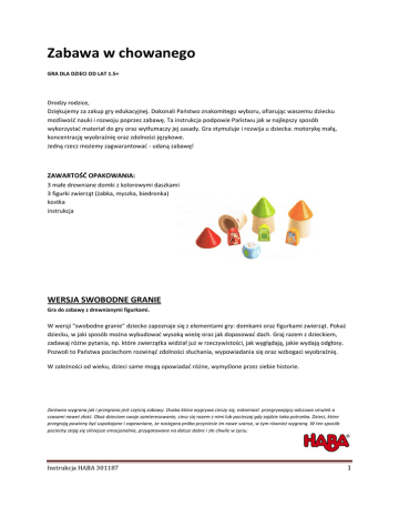 Zabawa w chowanego GRA DLA DZIECI OD LAT 1.5+ Drodzy rodzice, Dziękujemy za zakup gry edukacyjnej. Dokonali Państwo znakomitego wyboru, ofiarując waszemu dziecku możliwość nauki i rozwoju poprzez zabawę. Ta instrukcja podpowie Państwu jak w najlepszy sposób wykorzystać materiał do gry oraz wytłumaczy jej zasady. Gra stymuluje i rozwija u dziecka: motorykę małą, koncentrację wyobraźnię oraz zdolności językowe. Jedną rzecz możemy zagwarantować - udaną zabawę! ZAWARTOŚĆ OPAKOWANIA: 3 małe drewniane domki z kolorowymi daszkami 3 figurki zwierząt (żabka, myszka, biedronka) kostka instrukcja WERSJA SWOBODNE GRANIE Gra do zabawy z drewnianymi figurkami. W wersji "swobodne granie" dziecko zapoznaje się z elementami gry: domkami oraz figurkami zwierząt. Pokaż dziecku, w jaki sposób można wybudować wysoką wieżę oraz jak dopasować dach. Graj razem z dzieckiem, zadawaj różne pytania, np. które zwierzątka widział już w rzeczywistości, jak wyglądają, jakie wydają odgłosy. Pozwoli to Państwa pociechom rozwinąć zdolności słuchania, wypowiadania się oraz wzbogaci wyobraźnię. W zależności od wieku, dzieci same mogą opowiadać różne, wymyślone przez siebie historie. Zarówno wygrana jak i przegrana jest częścią zabawy. Osoba która wygrywa cieszy się, natomiast przegrywający odczuwa smutek a czasami nawet złość. Okaż dzieciom swoje zainteresowanie, ciesz się razem z nimi lub pocieszaj gdy zajdzie taka potrzeba. Dzieci, które przegrają powinny być uspokajane i zapewniane, że następna próba przyniesie im nowe szanse, w tym również wygraną. W ten sposób pociechy stają się silniejsze emocjonalnie, przygotowane na dalsze dobre i złe chwile w życiu. Instrukcja HABA 301187 1 URODZINY MAŁEJ BIEDRONKI Zadania do uważnego słuchania, dla jednego bądź większej ilości dzieci i 1 osoby dorosłej PRZYGOTOWANIE DO GRY: Umieść domki w następujący sposób: Po prawej stronie ustaw domek w kolorze żółtym, pośrodku w niewielkiej odległości ustaw domek w kolorze zielonym, a po lewej stronie w znacznej odległości ustaw domek w kolorze czerwonym. Następnie włóż figurki zwierząt do domków. Powoli i na głos czytaj zadania. Dziecko, poruszając elementami gry powinno starać się odtworzyć czytane zadanie. Jeżeli w grze bierze więcej osób, to uczestniczą w niej na zmianę. Każde z zadań składa się z dwóch części: opowiadania i określonej reakcji (wydrukowanej w nawiasach). W przypadku, gdy dziecko jest małe lub gra po raz pierwszy, należy przeczytać zarówno opowiadanie jak i czynność, którą dziecko powinno wykonać. Mogą Państwo urozmaicać zadania poprzez zamianę figurek, a także wymyślać własne historie. Starsze dzieci powinny zamieniać się rolami, a także powtarzać zadania z pamięci. ZADANIA DO UWAŻNEGO SŁUCHANIA: Słońce zdążyło już wzejść i jasno oświetla domki trójki przyjaciół. Mała myszka wystawia swój nosek i szybko wybiega na zewnątrz. (Wyjmij z domku figurkę myszki i ustaw ją przed domkiem). Myszka nagle coś sobie przypomniała. Szybko biegnie do zielonego domku i woła: „Żabko, obudź się!” (Przesuń figurkę myszki do zielonego domku i wołaniem obudź żabkę.) Żabka budzi się i staje naprzeciwko drzwi patrząc ze zdumieniem na myszkę. „Dzień dobry, myszko!” mówi żabka. „Czemu mnie obudziłaś?”. „Cześć żabko, pomyśl jaki dzisiaj mamy dzień?” odpowiada myszka. Żabka szeroko otwiera oczy i się uśmiecha „Chodź do mojego domku żabko, przygotujmy naszemu przyjacielowi niespodziankę.” (Przeprowadź figurkę myszki i żabki do domku myszki.) Myszka wchodzi do swojego domku. (Podnieś domek myszki i włóż do środka figurkę myszki.) Instrukcja HABA 301187 2 Żabka rozciąga się i napawa się przez chwilę ciepłym porannym słoneczkiem, następnie w podskokach okrąża domek myszki. (Przeprowadź figurkę żabki dookoła domku myszki). Promienie słoneczne wybudziły ze snu biedronkę, która wyszła ze swojego małego czerwonego domku. Rozglądając się dookoła podbiega do zielonego domku żabki. (Wyjmij figurkę biedronki z czerwonego domku i przeprowadź ją do domku żabki.) Biedronka puka do drzwi domku żabki, ale nikt nie odpowiada, wchodzi więc do środka. (Podnieś domek żabki i włóż do środka figurkę biedronki.) W tym samym momencie myszka wychodzi ze swojego domku. „Już mam!” mówi do żabki. Przyjaciele podążają razem do domku biedronki. (Wyjmij figurkę myszki z domku, następnie przeprowadź ją wraz z figurkę żabki do czerwonego domku biedronki.) „Dzień dobry biedronko”, myszka i żabka krzyczą jednocześnie, jednak nikt nie odpowiada. Wiedząc, że biedronka lubi przebywać w ogródku, przyjaciele udają się na za domek biedronki. (Krzyknij „Dzień dobry biedronko” i przeprowadź figurki dwóch zwierząt na tył domku biedronki.) Biedronka wraca do swojego domku. Jest zdziwiona, bo jej przyjaciółka, która lubi długo spać już opuściła domek. Gdzie się podziewają jej przyjaciele? (Wyjmij z domku żabki figurkę biedronki i przeprowadź ją do domku biedronki.) Widząc nadchodzącą biedronkę przyjaciele składają jej życzenia: „Wszystkiego najlepszego z okazji urodzin, biedronko!” Biedronka jest szczęśliwa widząc myszkę i żabkę . Jak sądzisz, jaki prezent otrzyma? (Krzyknij „Wszystkiego najlepszego z okazji urodzin biedronko”, a następnie przeprowadź figurkę myszki żabki do czerwonego domku biedronki. Pomyśl, jaką niespodziankę mogły przygotować zwierzęta swojej przyjaciółce. BIEDRONKA, MYSZKA I ŻABKA GRAJĄ W CHOWANEGO Gra dla 1 - 2 dzieci i 1 osoby dorosłej Zakres edukacji: uważna obserwacja, utrwalanie pamięci, koncentracja. PRZYGOTOWANIE DO GRY: Ustaw trzy domki na stole, a następnie umieść na nich daszki. Figurki zwierząt ustaw przed domkami. Wyjaśnij dzieciom symbole na kostkach, a w razie potrzeby naucz je rzucać kostką