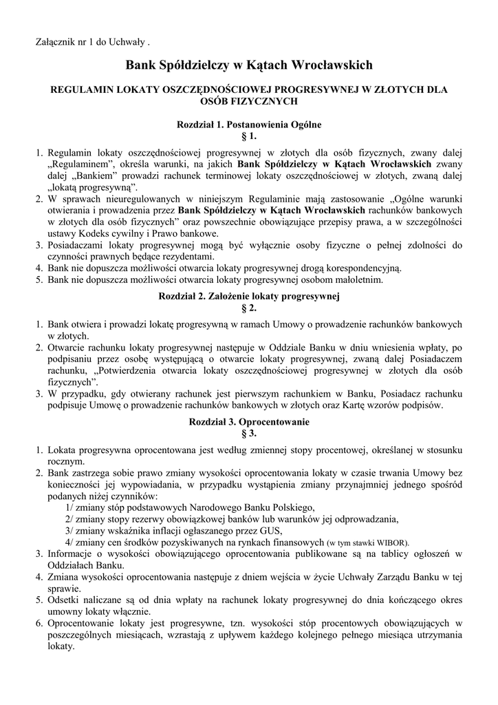 Załącznik nr 1 do Uchwały . Bank Spółdzielczy w Kątach Wrocławskich REGULAMIN LOKATY OSZCZĘDNOŚCIOWEJ PROGRESYWNEJ W ZŁOTYCH DLA OSÓB FIZYCZNYCH Rozdział 1. Postanowienia Ogólne § 1. 1. Regulamin lokaty oszczędnościowej progresywnej w złotych dla osób fizycznych, zwany dalej „Regulaminem”, określa warunki, na jakich Bank Spółdzielczy w Kątach Wrocławskich zwany dalej „Bankiem” prowadzi rachunek terminowej lokaty oszczędnościowej w złotych, zwaną dalej „lokatą progresywną”. 2. W sprawach nieuregulowanych w niniejszym Regulaminie mają zastosowanie „Ogólne warunki otwierania i prowadzenia przez Bank Spółdzielczy w Kątach Wrocławskich rachunków bankowych w złotych dla osób fizycznych” oraz powszechnie obowiązujące przepisy prawa, a w szczególności ustawy Kodeks cywilny i Prawo bankowe. 3. Posiadaczami lokaty progresywnej mogą być wyłącznie osoby fizyczne o pełnej zdolności do czynności prawnych będące rezydentami. 4. Bank nie dopuszcza możliwości otwarcia lokaty progresywnej drogą korespondencyjną. 5. Bank nie dopuszcza możliwości otwarcia lokaty progresywnej osobom małoletnim. Rozdział 2. Założenie lokaty progresywnej § 2. 1. Bank otwiera i prowadzi lokatę progresywną w ramach Umowy o prowadzenie rachunków bankowych w złotych. 2. Otwarcie rachunku lokaty progresywnej następuje w Oddziale Banku w dniu wniesienia wpłaty, po podpisaniu przez osobę występującą o otwarcie lokaty progresywnej, zwaną dalej Posiadaczem rachunku, „Potwierdzenia otwarcia lokaty oszczędnościowej progresywnej w złotych dla osób fizycznych”. 3. W przypadku, gdy otwierany rachunek jest pierwszym rachunkiem w Banku, Posiadacz rachunku podpisuje Umowę o prowadzenie rachunków bankowych w złotych oraz Kartę wzorów podpisów. Rozdział 3. Oprocentowanie § 3. 1. Lokata progresywna oprocentowana jest według zmiennej stopy procentowej, określanej w stosunku rocznym. 2. Bank zastrzega sobie prawo zmiany wysokości oprocentowania lokaty w czasie trwania Umowy bez konieczności jej wypowiadania, w przypadku wystąpienia zmiany przynajmniej jednego spośród podanych niżej czynników: 1/ zmiany stóp podstawowych Narodowego Banku Polskiego, 2/ zmiany stopy rezerwy obowiązkowej banków lub warunków jej odprowadzania, 3/ zmiany wskaźnika inflacji ogłaszanego przez GUS, 4/ zmiany cen środków pozyskiwanych na rynkach finansowych (w tym stawki WIBOR). 3. Informacje o wysokości obowiązującego oprocentowania publikowane są na tablicy ogłoszeń w Oddziałach Banku. 4. Zmiana wysokości oprocentowania następuje z dniem wejścia w życie Uchwały Zarządu Banku w tej sprawie. 5. Odsetki naliczane są od dnia wpłaty na rachunek lokaty progresywnej do dnia kończącego okres umowny lokaty włącznie. 6. Oprocentowanie lokaty jest progresywne, tzn. wysokości stóp procentowych obowiązujących w poszczególnych miesiącach, wzrastają z upływem każdego kolejnego pełnego miesiąca utrzymania lokaty. 7. Lokata progresywna zawierana jest na okres 6 miesięcy i składa się z sześciu jednomiesięcznych okresów. 8. Lokata progresywna jest odnawialna, tzn. jeżeli po upływie okresu umownego lokata nie zostanie zlikwidowana, Bank automatycznie odnawia lokatę wraz z naliczonymi odsetkami na kolejny taki sam okres umowny na warunkach obowiązujących w dniu jej każdorazowego odnowienia, o ile do dnia upływu okresu umownego (włącznie), nie została złożona inna dyspozycja. 9. Kolejny okres umowny rozpoczyna się od następnego dnia po upływie poprzedniego okresu umownego, tj. w dniu, który datą odpowiada dniowi wniesienia lokaty. 10. Minimalna kwota lokaty progresywnej wynosi 1 000 zł. (jeden tysiąc złotych). § 4. Do obliczania należnych odsetek od środków pieniężnych zgromadzonych na rachunku lokaty progresywnej przyjmuje się, że rok liczy 365 dni. Rozdział 4. Dysponowanie środkami § 5. Przyjmując środki na lokatę progresywną Bank zobowiązuje się wobec Klienta do przechowywania jego środków pieniężnych przez zadeklarowany okres i wypłacania mu odsetek na zasadach określonych w niniejszym Regulaminie. 2. W umownym okresie przechowywania środków na rachunku lokaty progresywnej Bank nie przyjmuje wpłat uzupełniających i nie dokonuje częściowych wypłat. 3. Każda wypłata środków z lokaty progresywnej w trakcie trwania 6-miesięcznego okresu umownego stanowi naruszenie warunków prowadzenia lokaty progresywnej i jej zerwanie. 4. Z chwilą wycofania lokaty progresywnej przed upływem zadeklarowanego6-miesięcznego okresu odsetki nalicza się za każdy zakończony okres jednomiesięczny według stopy procentowej dla danego okresu, przy czym Bank nie nalicza odsetek za ostatni niepełny okres, w którym nastąpiła wypłata. 5. Klient nie otrzymuje odsetek w przypadku lokaty wycofanej przed upływem pierwszego miesiąca umownego. 6. Odsetki od lokaty progresywnej podlegają kapitalizacji po upływie 6-miesięcznego okresu umownego z zastrzeżeniem pkt. 7. 7. Odsetki stawiane są do dyspozycji Posiadacza rachunku tylko w pierwszym dniu roboczym po upływie okresu umownego i mogą być: - przelane na wskazany przez Posiadacza rachunek bankowy, - doliczone do kapitału na kolejny 6-miesięczny okres umowny. 8. Kapitał wraz z odsetkami po upływie okresu umownego lub w przypadku wcześniej likwidacji lokaty progresywnej zgodnie z dyspozycją Posiadacza rachunku może być przelany na wskazany rachunek bankowy. 9. Gdy koniec okresu umownego przypada w dniu wolnym od pracy, to koniec okresu umownego przesuwa się na pierwszy dzień roboczy Banku. 1. § 6. Bank nie dopuszcza możliwości dokonania przeniesienia praw Posiadacza rachunku do lokaty progresywnej na rzecz innej osoby(cesja). Regulamin obowiązuje od 20.08.2009 r. Zarząd Banku Spółdzielczego w Kątach Wrocławskich
