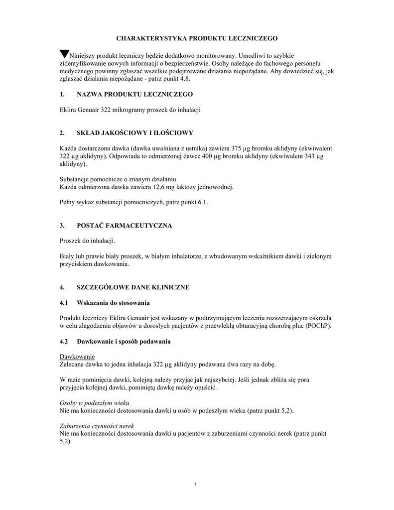 CHARAKTERYSTYKA PRODUKTU LECZNICZEGO Niniejszy produkt leczniczy będzie dodatkowo monitorowany. Umożliwi to szybkie zidentyfikowanie nowych informacji o bezpieczeństwie. Osoby należące do fachowego personelu medycznego powinny zgłaszać wszelkie podejrzewane działania niepożądane. Aby dowiedzieć się, jak zgłaszać działania niepożądane - patrz punkt 4.8. 1. NAZWA PRODUKTU LECZNICZEGO Eklira Genuair 322 mikrogramy proszek do inhalacji 2. SKŁAD JAKOŚCIOWY I ILOŚCIOWY Każda dostarczona dawka (dawka uwalniana z ustnika) zawiera 375 µg bromku aklidyny (ekwiwalent 322 µg aklidyny). Odpowiada to odmierzonej dawce 400 µg bromku aklidyny (ekwiwalent 343 µg aklidyny). Substancje pomocnicze o znanym działaniu Każda odmierzona dawka zawiera 12,6 mg laktozy jednowodnej. Pełny wykaz substancji pomocniczych, patrz punkt 6.1. 3. POSTAĆ FARMACEUTYCZNA Proszek do inhalacji. Biały lub prawie biały proszek, w białym inhalatorze, z wbudowanym wskaźnikiem dawki i zielonym przyciskiem dawkowania. 4. SZCZEGÓŁOWE DANE KLINICZNE 4.1 Wskazania do stosowania Produkt leczniczy Eklira Genuair jest wskazany w podtrzymującym leczeniu rozszerzającym oskrzela w celu złagodzenia objawów u dorosłych pacjentów z przewlekłą obturacyjną chorobą płuc (POChP). 4.2 Dawkowanie i sposób podawania Dawkowanie Zalecana dawka to jedna inhalacja 322 µg aklidyny podawana dwa razy na dobę. W razie pominięcia dawki, kolejną należy przyjąć jak najszybciej. Jeśli jednak zbliża się pora przyjęcia kolejnej dawki, pominiętą dawkę należy opuścić. Osoby w podeszłym wieku Nie ma konieczności dostosowania dawki u osób w podeszłym wieku (patrz punkt 5.2). Zaburzenia czynności nerek Nie ma konieczności dostosowania dawki u pacjentów z zaburzeniami czynności nerek (patrz punkt 5.2). 1 Zaburzenia czynności wątroby Nie ma konieczności dostosowania dawki u pacjentów z zaburzeniami czynności wątroby (patrz punkt 5.2). Dzieci i młodzież Stosowanie produktu leczniczego Eklira Genuair u dzieci i młodzieży (w wieku poniżej 18 lat) nie jest właściwe we wskazaniu: przewlekła obturacyjna choroba płuc (POChP). Sposób podawania Do podawania wziewnego. Pacjentom należy udzielić instrukcji dotyczącej właściwego podawania produktu. Instrukcja obsługi: Zapoznanie się z budową inhalatora Eklira Genuair: Wskaźnik dawki Zielony przycisk Osłona zabezpieczająca Kolorowe okienko kontrolne Ustnik Wyjąć inhalator Genuair z torebki i zapoznać się z jego elementami. Jak stosować Eklira Genuair Podsumowanie Przed użyciem inhalatora Genuair, po zdjęciu jego osłony zabezpieczającej, należy wykonać 2 czynności: Krok 1 - Wcisnąć i ZWOLNIĆ zielony przycisk i wykonać całkowity wydech poza inhalator. Krok 2 - Dokładnie zacisnąć usta wokół ustnika i wykonać MOCNY i GŁĘBOKI wdech przez inhalator. Po wykonaniu inhalacji należy pamiętać o założeniu osłony zabezpieczającej. Początek stosowania Przed pierwszym użyciem należy rozerwać zamkniętą torebkę wzdłuż wycięcia i wyjąć inhalator Genuair. Przed przyjęciem dawki produktu leczniczego należy zdjąć osłonę zabezpieczającą, poprzez lekkie ściśnięcie strzałek oznaczonych po każdej stronie inhalatora i ściągnięcie jej na zewnątrz (patrz rysunek 1). 2 RYSUNEK 1 Sprawdzić, czy nic nie blokuje ustnika. Przytrzymać inhalator Genuair poziomo z ustnikiem skierowanym w stronę użytkownika i zielonym przyciskiem skierowanym w górę (patrz rysunek 2). Przytrzymać z zielonym przyciskiem skierowanym w górę. NIE OBRACAĆ. RYSUNEK 2 KROK 1: WCISNĄĆ zielony przycisk całkowicie w dół, a następnie go ZWOLNIĆ (patrz rysunki 3 i 4). NIE TRZYMAĆ ZIELONEGO PRZYCISKU WCIŚNIĘTEGO W DÓŁ. WCISNĄĆ zielony przycisk całkowicie w dół ZWOLNIĆ zielony przycisk RYSUNEK 3 RYSUNEK 4 Przerwać i sprawdzić: Upewnić się, że dawka produktu leczniczego jest gotowa do inhalacji Upewnić się, że kolorowe okienko kontrolne zmieniło kolor na zielony (patrz rysunek 5). Zielone okienko kontrolne potwierdza, że produkt leczniczy jest gotowy do inhalacji. 3 Gotowy do użycia ZIELONY RYSUNEK 5 JEŚLI KOLOROWE OKIENKO KONTROLNE POZOSTAJE CZERWONE, NALEŻY POWTÓRZYĆ WCIŚNIĘCIE I ZWOLNIENIE (PATRZ KROK 1). Przed zbliżeniem inhalatora do ust należy wykonać całkowity wydech. Nie wolno dmuchać (wydychać powietrza) do inhalatora. KROK 2: Dokładnie zacisnąć usta wokół ustnika inhalatora Genuair i wykonać MOCNY i GŁĘBOKI wdech przez ustnik (patrz rysunek 6). Mocny i głęboki wdech powoduje wniknięcie produktu leczniczego przez inhalator do płuc. UWAGA: PODCZAS WYKONYWANIA INHALACJI NIE NALEŻY TRZYMAĆ ZIELONEGO PRZYCISKU. PRAWIDŁOWO NIEPRAWIDŁOWO RYSUNEK 6 Podczas wdychania można usłyszeć „KLIKNIĘCIE”, które sygnalizuje prawidłowe stosowanie inhalatora Genuair. Mimo „KLIKNIĘCIA” należy kontynuować wdychanie, aby mieć pewność, że zostanie podana pełna dawka produktu leczniczego. Wyjąć inhalator Genuair z ust i wstrzymać oddech na tak długo, jak jest to możliwe, nie powodując przy tym uczucia dyskomfortu, a następnie powoli wydychać powietrze przez nos. Uwaga: Niektórzy pacjenci mogą odczuwać łagodny słodki lub gorzkawy posmak lub mieć wrażenie przełykania grudek, w zależności od pacjenta, podczas wdychania produktu leczniczego. W razie braku odczuwania posmaku lub innego wrażenia po wykonaniu wdechu nie należy przyjmować dodatkowej dawki. Przerwać i sprawdzić: Upewnić się, że inhalacja została wykonana prawidłowo Upewnić się, że kolorowe okienko kontrolne zmieniło kolor na czerwony (patrz rysunek 7). Potwierdza to prawidłowe przyjęcie pełnej dawki produktu leczniczego. 4 Prawidłowa inhalacja CZERWONY RYSUNEK 7 JEŚLI KOLOROWE OKIENKO KONTROLNE NADAL POZOSTAJE ZIELONE, NALEŻY POWTÓRZYĆ MOCNĄ I GŁĘBOKĄ INHALACJĘ PRZEZ USTNIK (PATRZ KROK 2). Jeśli okienko nadal nie zmienia barwy na czerwoną, oznacza to, że użytkownik móg