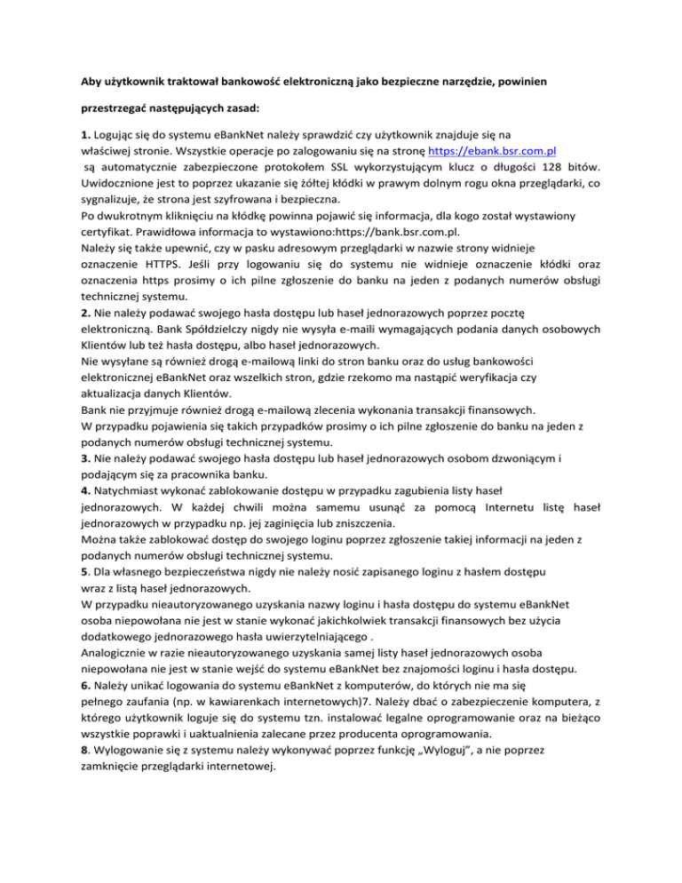 Aby użytkownik traktował bankowośd elektroniczną jako bezpieczne narzędzie, powinien przestrzegad następujących zasad: 1. Logując się do systemu eBankNet należy sprawdzid czy użytkownik znajduje się na właściwej stronie. Wszystkie operacje po zalogowaniu się na stronę https://ebank.bsr.com.pl są automatycznie zabezpieczone protokołem SSL wykorzystującym klucz o długości 128 bitów. Uwidocznione jest to poprzez ukazanie się żółtej kłódki w prawym dolnym rogu okna przeglądarki, co sygnalizuje, że strona jest szyfrowana i bezpieczna. Po dwukrotnym kliknięciu na kłódkę powinna pojawid się informacja, dla kogo został wystawiony certyfikat. Prawidłowa informacja to wystawiono:https://bank.bsr.com.pl. Należy się także upewnid, czy w pasku adresowym przeglądarki w nazwie strony widnieje oznaczenie HTTPS. Jeśli przy logowaniu się do systemu nie widnieje oznaczenie kłódki oraz oznaczenia https prosimy o ich pilne zgłoszenie do banku na jeden z podanych numerów obsługi technicznej systemu. 2. Nie należy podawad swojego hasła dostępu lub haseł jednorazowych poprzez pocztę elektroniczną. Bank Spółdzielczy nigdy nie wysyła e-maili wymagających podania danych osobowych Klientów lub też hasła dostępu, albo haseł jednorazowych. Nie wysyłane są również drogą e-mailową linki do stron banku oraz do usług bankowości elektronicznej eBankNet oraz wszelkich stron, gdzie rzekomo ma nastąpid weryfikacja czy aktualizacja danych Klientów. Bank nie przyjmuje również drogą e-mailową zlecenia wykonania transakcji finansowych. W przypadku pojawienia się takich przypadków prosimy o ich pilne zgłoszenie do banku na jeden z podanych numerów obsługi technicznej systemu. 3. Nie należy podawad swojego hasła dostępu lub haseł jednorazowych osobom dzwoniącym i podającym się za pracownika banku. 4. Natychmiast wykonad zablokowanie dostępu w przypadku zagubienia listy haseł jednorazowych. W każdej chwili można samemu usunąd za pomocą Internetu listę haseł jednorazowych w przypadku np. jej zaginięcia lub zniszczenia. Można także zablokowad dostęp do swojego loginu poprzez zgłoszenie takiej informacji na jeden z podanych numerów obsługi technicznej systemu. 5. Dla własnego bezpieczeostwa nigdy nie należy nosid zapisanego loginu z hasłem dostępu wraz z listą haseł jednorazowych. W przypadku nieautoryzowanego uzyskania nazwy loginu i hasła dostępu do systemu eBankNet osoba niepowołana nie jest w stanie wykonad jakichkolwiek transakcji finansowych bez użycia dodatkowego jednorazowego hasła uwierzytelniającego . Analogicznie w razie nieautoryzowanego uzyskania samej listy haseł jednorazowych osoba niepowołana nie jest w stanie wejśd do systemu eBankNet bez znajomości loginu i hasła dostępu. 6. Należy unikad logowania do systemu eBankNet z komputerów, do których nie ma się pełnego zaufania (np. w kawiarenkach internetowych)7. Należy dbad o zabezpieczenie komputera, z którego użytkownik loguje się do systemu tzn. instalowad legalne oprogramowanie oraz na bieżąco wszystkie poprawki i uaktualnienia zalecane przez producenta oprogramowania. 8. Wylogowanie się z systemu należy wykonywad poprzez funkcję „Wyloguj”, a nie poprzez zamknięcie przeglądarki internetowej. Ochrona systemu eBankNet jest zapewniana w kilku warstwach: W systemie istnieją w chwili obecnej dwa typy blokad: − blokada autoryzacji, − blokada transakcji; Pierwsza z nich występuje po n nieudanych próbach wykonania operacji wymagającej podania hasła dostępu do systemu, czyli: − zalogowanie do systemu, − zmiana hasła, − usunięcie listy haseł, − usunięcie zamówienia listy haseł; Blokada transakcji zostaje aktywowana po n nieudanych próbach wykonania operacji wymagającej podania hasła jednorazowego, czyli: − tworzenie, modyfikacja definicji przelewu, − wykonanie przelewu; W przypadku, gdy ilośd błędnych autoryzacji nie osiągnie limitu a kolejna jest poprawna, wtedy licznik błędnych autoryzacji ulega wyzerowaniu. Istnieje również możliwośd ręcznego ustawienia dowolnej blokady dowolnemu użytkownikowi. Odblokowanie zarówno ręcznej jak i automatycznej blokady wymaga kontaktu z bankiem. System bankowości elektronicznej eBankNet został stworzony w oparciu o technologię i doświadczenie znanej firmy informatycznej - lidera wśród firm zajmującym się oprogramowaniem dla banków spółdzielczych. Szyfrowanie transmisji Połączenie z kontem internetowym jest transmisją zaszyfrowaną. Dzięki temu wszelkie informacje, które są przesyłane lub otrzymywane są dostępne tylko i wyłącznie dla uprawnionego użytkownika. W systemie eBankNet zastosowano jedno z najsilniejszych obecnie szyfrowao algorytmem SSL o długości klucza 128 bitów. Wszystkie transakcje, które zostaną dokonane na koncie, każdorazowo wymagają dodatkowego uwierzytelnienia poprzez wpisanie hasła jednorazowego. Wejście do systemu Aby wejśd do systemu eBankNet należy podad: • numer identyfikacyjny - tzw. Login (10 znakowy), który jest częściowo określany przez bank, • unikatowe hasło dostępu, które przy pierwszym wejściu do systemu system wymusza do zmiany przez użytkownika (min 8- max 16 znaków)- dzięki niemu użytkownik wchodzi na swoje konto, ale nie może jeszcze realizowad transakcji. Lista haseł jednorazowych Jest to lista z nadrukowanymi hasłami do autoryzacji/wykonywania transakcji, służącymi do uwierzytelniania operacji dokonywanych przez Internet. Lista haseł jednorazowych jest przypisana do konkretnego loginu (klient może posiadad kilka loginów np. mąż i żona do rachunku wspólnego). Listę zawiera 50 haseł jednorazowych oznaczonych kolejnymi numerami. System automatycznie sam kontroluje, które hasła z karty są już wykorzystane i prosi o podanie konkretnego numeru z listy. Blokowanie dostępu do systemu Trzykrotne błędne uwierzytelnienie Klienta podczas wejścia do systemu eBankNet