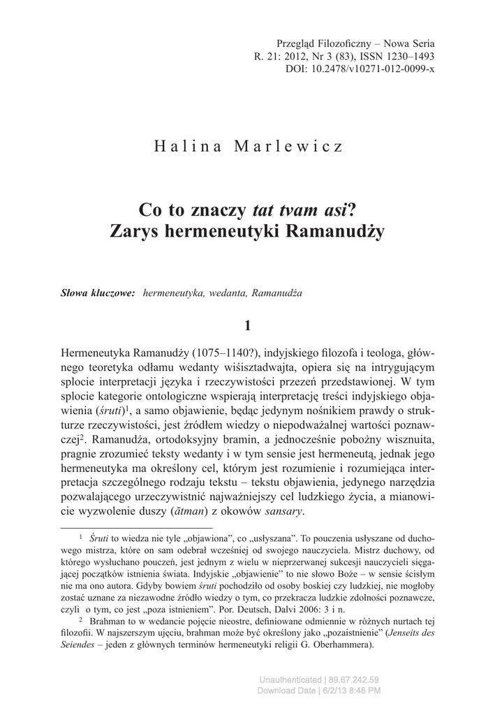 Przegląd Filozoficzny – Nowa Seria R. 21: 2012, Nr 3 (83), ISSN 1230–1493 DOI: 10.2478/v10271-012-0099-x Halina Marlewicz Co to znaczy tat tvam asi? Zarys hermeneutyki Ramanudży Słowa kluczowe: hermeneutyka, wedanta, Ramanudża 1 Hermeneutyka Ramanudży (1075–1140?), indyjskiego filozofa i teologa, głównego teoretyka odłamu wedanty wiśisztadwajta, opiera się na intrygującym splocie interpretacji języka i rzeczywistości przezeń przedstawionej. W tym splocie kategorie ontologiczne wspierają interpretację treści indyjskiego objawienia (śruti)1, a samo objawienie, będąc jedynym nośnikiem prawdy o strukturze rzeczywistości, jest źródłem wiedzy o niepodważalnej wartości poznawczej2. Ramanudża, ortodoksyjny bramin, a jednocześnie pobożny wisznuita, pragnie zrozumieć teksty wedanty i w tym sensie jest hermeneutą, jednak jego hermeneutyka ma określony cel, którym jest rozumienie i rozumiejąca interpretacja szczególnego rodzaju tekstu – tekstu objawienia, jedynego narzędzia pozwalającego urzeczywistnić najważniejszy cel ludzkiego życia, a mianowicie wyzwolenie duszy (ātman) z okowów sansary. 1 Śruti to wiedza nie tyle „objawiona”, co „usłyszana”. To pouczenia usłyszane od duchowego mistrza, które on sam odebrał wcześniej od swojego nauczyciela. Mistrz duchowy, od którego wysłuchano pouczeń, jest jednym z wielu w nieprzerwanej sukcesji nauczycieli sięgającej początków istnienia świata. Indyjskie „objawienie” to nie słowo Boże – w sensie ścisłym nie ma ono autora. Gdyby bowiem śruti pochodziło od osoby boskiej czy ludzkiej, nie mogłoby zostać uznane za niezawodne źródło wiedzy o tym, co przekracza ludzkie zdolności poznawcze, czyli o tym, co jest „poza istnieniem”. Por. Deutsch, Dalvi 2006: 3 i n. 2 Brahman to w wedancie pojęcie nieostre, definiowane odmiennie w różnych nurtach tej filozofii. W najszerszym ujęciu, brahman może być określony jako „pozaistnienie” (Jenseits des Seiendes – jeden z głównych terminów hermeneutyki religii G. Oberhammera). Unauthenticated | 89.67.242.59 Download Date | 6/2/13 8:46 PM 586 Halina Marlewicz Badanie słowa zakłada możliwość dotarcia do pełni jego znaczenia zbawczego i jest nieodzownym etapem w dążności ku brahmanowi, bytowi metafizycznemu. Owa dążność, nazwana „pragnieniem poznania brahmana” (brahmajijñāsā), jest zarazem głównym przedmiotem refleksji filozofów związanych z różnymi nurtami wedanty. To wyraz pragnienia metafizycznego3, najgłębszej ludzkiej potrzeby poznania tego, co jest „poza” i „ponad” istnieniem. Punktem wyjścia oraz stałym punktem odniesienia w tych poszukiwaniach jest Słowo. Wedanta daleka jest jednak od naturalnego mistycyzmu – nie w świecie, bowiem, a w Słowie objawia się brahman. Jeśli więc mocą języka, nie świata, jest objawiać prawdę o tym, co jest poza istnieniem, to tylko poprzez język można tę prawdę odkryć. Ponieważ śruti jest samą prawdą, Ramanudża najczęściej nie dyskutuje „prawdziwości” zdań w rodzaju tat tvam asi:4 „tym ty jesteś”, które ma oddawać naturę relacji brahman–dusza. Nie jest rzeczą przypadkową, że swój debiut pisarski: Vedārthasaṃrgaha (VedS) Ramanudża rozpoczyna od analizy ChU 6.8.7, zdania kluczowego także dla filozofów innej tradycji wedanty – adwajta5, z których poglądami Ramanudża niejednokrotnie polemizował. Według adwajtina to samo zdanie wyraża istotową tożsamość brahmana i duszy, przy czym brahman jest czystym bytem (sanmātra), jedyną prawdziwie istniejącą rzeczywistością. Przy tym założeniu wszystko, co nie jest owym czystym bytem, a więc wszystko, co posiada cechy, co jest różnorodne, co jest wielością, może być co najwyżej względnie prawdziwe. Jeśli człowiek dążący do wyzwolenia duchowego (mumukṣu) uświadomi sobie tę prawdę o naturze świata, staje na drodze do poznania prawdy o sobie i tym, co jest w nim samym istotowo tożsame z czystym bytem. Hermeneutyka adwajty zakłada zatem swoistą „redukcję fenomenologiczną” badanych całostek, która to redukcja obrazuje jednocześnie istotę filozofii adwajty, często nazywanej radykalnym idealizmem. Ramanudża poprzez swoją hermeneutykę pragnie pokazać, że to samo zdanie oferuje możliwość realizmu, gdyż wskazanie na istotową tożsamość dwóch całostek, a więc tat, które wyraża brahmana, i tvam, które wyraża duszę indywidualną, nie polega na redukcji obydwu do „bytu prawdziwego”, ale na inkluzji wszelkich postaci bytowania w „byt prawdziwy”. Jednak ta zasadnicza różnica między adwajtinem i wiśisztadwajtinem nie wynika przecież z treści samego zdania, ale z kierującej jej rozumieniem antycypacji sensu. Bez względu na to, czy hermeneutą jest wiśisztadwajtin, 3 Por. Lévinas 1998: 18–21. Upaniszada Ćhandogja (ChU): 6.8.7. 5 A-dvaita = advaya to: „bez-drugiego”. Tak ten termin rozumie P. Hacker, wskazując na jego uwarunkowanie ideami buddyjskimi Gaudapady. Por. Hacker 1995b: 131–132, przyp. 21. A więc brahman a-dvaita to brahman „bez-drugiego”. Pod tym określeniem kryje się rozumienie brahmana jako czystego bytu. 4 Unauthenticated | 89.67.242.59 Download Date | 6/2/13 8:46 PM Co to znaczy tat tvam asi? Zarys hermeneutyki Ramanudży 587 czy adwajtin, procesem hermeneutycznym kieruje pewien uprzedni, prekognitywny „zarys oczekiwań”6 co do treści analizowanych pojęć czy opisanego zjawiska. Zarys oczekiwań nie jest monosubiektywny, jest wynikiem ukształtowania myślenia danego filozofa na pewnym wspólnotowym gruncie. Ów wspólnotowy grunt z jednej strony wiąże antycypację sensu z tradycją, w tym przypadku tradycją jednego z odłamów wedanty. Z drugiej strony ten sens, już od pierwszej próby jego odczytania, jest rewidowany przez hermeneutę w dynamicznym procesie interpretowania i rozumienia. 2 Tłem hermeneutyki Ramanudży jest wisznuicka tradycja religijna,