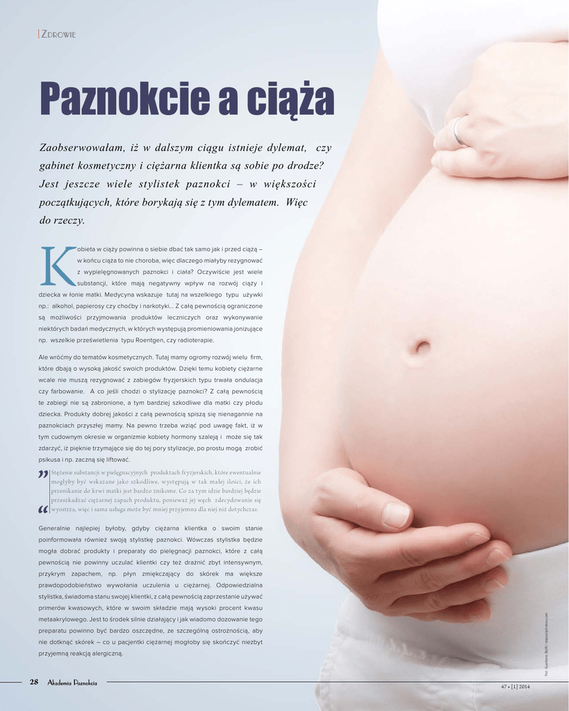 Z drowie Paznokcie a ciąża Zaobserwowałam, iż w dalszym ciągu istnieje dylemat, czy gabinet kosmetyczny i ciężarna klientka są sobie po drodze? Jest jeszcze wiele stylistek paznokci – w większości początkujących, które borykają się z tym dylematem. Więc do rzeczy. K obieta w ciąży powinna o siebie dbać tak samo jak i przed ciążą – w końcu ciąża to nie choroba, więc dlaczego miałyby rezygnować z wypielęgnowanych paznokci i ciała? Oczywiście jest wiele substancji, które mają negatywny wpływ na rozwój ciąży i dziecka w łonie matki. Medycyna wskazuje tutaj na wszelkiego typu używki np.: alkohol, papierosy czy choćby i narkotyki... Z całą pewnością ograniczone są możliwości przyjmowania produktów leczniczych oraz wykonywanie niektórych badań medycznych, w których występują promieniowania jonizujące np. wszelkie prześwietlenia typu Roentgen, czy radioterapie. Ale wróćmy do tematów kosmetycznych. Tutaj mamy ogromy rozwój wielu firm, które dbają o wysoką jakość swoich produktów. Dzięki temu kobiety ciężarne wcale nie muszą rezygnować z zabiegów fryzjerskich typu trwała ondulacja czy farbowanie. A co jeśli chodzi o stylizację paznokci? Z całą pewnością te zabiegi nie są zabronione, a tym bardziej szkodliwe dla matki czy płodu dziecka. Produkty dobrej jakości z całą pewnością spiszą się nienagannie na paznokciach przyszłej mamy. Na pewno trzeba wziąć pod uwagę fakt, iż w tym cudownym okresie w organizmie kobiety hormony szaleją i może się tak zdarzyć, iż pięknie trzymające się do tej pory stylizacje, po prostu mogą zrobić psikusa i np. zaczną się liftować. Stężenie substancji w pielęgnacyjnych produktach fryzjerskich, które ewentualnie mogłyby być wskazane jako szkodliwe, występują w tak małej ilości, że ich przenikanie do krwi matki jest bardzo znikome. Co za tym idzie bardziej będzie przeszkadzać ciężarnej zapach produktu, ponieważ jej węch zdecydowanie się wyostrza, więc i sama usługa może być mniej przyjemna dla niej niż dotychczas. Generalnie najlepiej byłoby, gdyby ciężarna klientka o swoim stanie poinformowała również swoją stylistkę paznokci. Wówczas stylistka będzie mogła dobrać produkty i preparaty do pielęgnacji paznokci, które z całą pewnością nie powinny uczulać klientki czy też drażnić zbyt intensywnym, przykrym zapachem, np. płyn zmiękczający do skórek ma większe prawdopodobieństwo wywołania uczulenia u ciężarnej. Odpowiedzialna stylistka, świadoma stanu swojej klientki, z całą pewnością zaprzestanie używać Fot. Gualtiero Boffi / depositphotos.com primerów kwasowych, które w swoim składzie mają wysoki procent kwasu metaakrylowego. Jest to środek silnie działający i jak wiadomo dozowanie tego preparatu powinno być bardzo oszczędne, ze szczególną ostrożnością, aby nie dotknąć skórek – co u pacjentki ciężarnej mogłoby się skończyć niezbyt przyjemną reakcją alergiczną. 28 Akademia Paznokcia 47 • [1] 2014 Z drowie Pomalowane paznokcie taką ocenę uniemożliwiają albo wręcz zamazują prawidłowy obraz. Kolejnym powodem mówiącym „NIE” pomalowanym paznokciom podczas porodu jest fakt, iż zaburzają one prawidłową pracę pulsoksymetra – jest on zakładany przeważnie na palec środkowy. Urządzenie to jest używane przez lekarzy przy znieczuleniu pacjentki, które np. rodzą za pomocą cięcia cesarskiego. Ewa Hejman-Lenga Dyplomowany Instruktor Nails Company Zabrze Administrator forum www.nailscompany.pl www.evahl.pl Ponadto klientce w ciąży lepiej nie aplikować na paznokcie lakieru, który w swoim składzie zawiera formaldehyd bądź toluen – te substancje również mogą doprowadzić do silnego podrażnienia. Wiele kobiet nie zdaje sobie sprawy, że w trakcie porodu wszelkie pierwsze objawy np. problem z układem krążenia lekarze mogą zaobserwować między innymi na paznokciach. Pomalowane paznokcie taką ocenę uniemożliwiają albo wręcz zamazują prawidłowy obraz. Kolejnym powodem mówiącym „NIE” pomalowanym paznokciom podczas porodu jest fakt, iż zaburzają one prawidłową pracę pulsoksymetra – jest on zakładany przeważnie na palec środkowy. Wiem, że każda kobieta ma wolny wybór, czy pięknie wyglądać na sali porodowej z kolorowymi paznokciami, czy jednak zwycięży zdrowy rozsądek i najwyższe dobro maleństwa... Ale jako odpowiedzialna stylistka zawsze czułam się w obowiązku, aby poinformować moje ciężarne klientki o konsekwencjach pomalowanych paznokci w Odpowiedzialna stylistka, świadoma stanu swojej klientki, z całą pewnością zaprzestanie używać primerów kwasowych, które w swoim składzie mają wysoki procent kwasu metaakrylowego. Jest to środek silnie działający i jak wiadomo dozowanie tego preparatu powinno być bardzo oszczędne, ze szczególną ostrożnością, aby nie dotknąć skórek – co u pacjentki ciężarnej mogłoby się skończyć niezbyt przyjemną reakcją alergiczną. trakcie porodu, czy innego zabiegu medycznego. Bo tak naprawdę nigdy do końca nie wiemy, czy poród, który miał odbyć się drogami naturalnymi w nieoczekiwany sposób zamieni się w cesarskie cięcie. Wszystkim Co prawda świadomość stylistek w kwestii sterylizacji narzędzi jest już bardzo przyszłym mamusiom życzę dużo zdrowia oraz szczęśliwego rozwiązania!!!!!! wysoka, ale jednak czuję się w obowiązku podkreślić, iż jest to tym bardziej istotna czynność, która wyklucza do minimum ryzyko zarażenia klientki choćby grzybicą, czy znacznie poważniejszym wirusowym zapaleniem wątroby typu B lub C. Co w przypadku zarażenia kobiety ciężarnej spowoduje ryzyko, iż w trakcie porodu wirus ten może zostać przeniesiony na dziecko. Ponadto warto również wspomnieć, iż u kobiet w ciąży występuje nadmiar temat dość poważny, estrogenów co przyczynia się do tego, iż macierz paznokcia w znacznie szybszym Dzisiejszy 