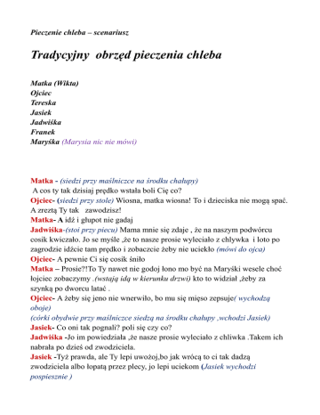 Pieczenie chleba – scenariusz Tradycyjny obrzęd pieczenia chleba Matka (Wikta) Ojciec Tereska Jasiek Jadwiśka Franek Maryśka (Marysia nic nie mówi) Matka - (siedzi przy maślniczce na środku chałupy) A cos ty tak dzisiaj prędko wstała boli Cię co? Ojciec- (siedzi przy stole) Wiosna, matka wiosna! To i dzieciska nie mogą spać. A zreztą Ty tak zawodzisz! Matka- A idź i głupot nie gadaj Jadwiśka-(stoi przy piecu) Mama mnie się zdaje , że na naszym podwórcu cosik kwiczało. Jo se myśle ,że to nasze prosie wyleciało z chlywka i loto po zagrodzie idźcie tam prędko i zobaczcie żeby nie uciekło (mówi do ojca) Ojciec- A pewnie Ci się cosik śniło Matka – Prosie?!To Ty nawet nie godoj łono mo być na Maryśki wesele choć łojciec zobaczymy .(wstają idą w kierunku drzwi) kto to widział ,żeby za szynką po dworcu latać . Ojciec- A żeby się jeno nie wnerwiło, bo mu się mięso zepsuje( wychodzą oboje) (córki obydwie przy maślniczce siedzą na środku chałupy ,wchodzi Jasiek) Jasiek- Co oni tak pognali? poli się czy co? Jadwiśka -Jo im powiedziała ,że nasze prosie wyleciało z chliwka .Takem ich nabrała po dzieś od zwodziciela. Jasiek -Tyż prawda, ale Ty lepi uwożoj,bo jak wrócą to ci tak dadzą zwodziciela albo łopatą przez plecy, jo lepi uciekom (Jasiek wychodzi pospiesznie ) (Jadwiśka siada przy Marysi przy maślniczce) (wchodzi matka i ojciec) Matka -Jadwiśka coś ty wymyśliła, na dworcu cicho, prosie w chliwku, ino sąsiad Staszek na progu siedzi i chrząka a przeklino przy tym Ojciec - (siedzi na stołku) Pytał nas się co my tak lotomy dookoła ty chałupy. To o co ci chodziło ? Jadwiśka - zwodziciela, zwodziciela Matka (bije ścierką córke)- To ty zgago ja ci dam zwodziciela ,Ty. Ojciec- Matka dej jej spokoj, to jej się udało nas nabrać, ale jo ją jeszcze dzisiaj zwiede Matka – dobra dość tych żartów, bo roboty jest sporo. Lepiej chleba trza napiec, idź tam Jadwiśka wołoj Franka niech wstaje Ojciec- Matka, niech no Marysia zacznie piec chleb, bo będzie się wydawać, to musi umieć. Jo wam naniese drewna do pieca ( wychodzi) Jadwiśka - Franek wstawaj ! Matka- Nie powiedziałam mu jakiego drewna ma nanieść ale może wreszcie cosik sam podumo Franek -(przeciąga się) Tak rano wołacie, co się dzieje ? Matka - Chleb będziemy piec, a gadają do chleba trzeba rani wstać Tereska- Pochwalony Ty chałupie Matka- Na wieki wieków, a co Cie tu sprowodzo Tereska- A wasz chłop gadał, że będziecie piec chleb. Moze jo bym wom pomogła, a potem bym se sama w waszym piecu upiekła bo mój bardzo dymi. A jo słyszala,ze ty dzisiaj coś słabujesz. Matka -A takom Ci do niczego. Tereska- To jo Ci pomoge, raźni będzie Matka -To tak Franek, Maryśka przynieśta nam te dzieżke, jeno uważajcie tam w ni zaczyn rośnie Tereska-to pewnie zescie wczora zaczyn z kwasu przygotowali Matka -Wczora wieczorem żem zrobiła Franek-A uważamy żeby nie zruszać, chlyb musi być ładny, dzieżka to najważniejsza rzecz w chałupie, trza z nią z szacunkiem, w niej się ciasto miesi na chlyb (wchodzi ojciec) Ojciec - Chlyb i woda ni ma głoda. Przekoże wam drewno Jadwiśka - Tata a jakie zeście drewno przynieśli Ojciec- A co to, ty się znosz na chlebowym drewnie, jo przynis dobre, sosnowe, bedzie wielki płomień, cały piec ogrzeje, jak trza jeszcze to mnie wołajcie, bede na dworcu (wychodzi) Matka- Franek, Marysia przynieście no te dzieżke bliżej. (do Marysi) Idź jeszcze przynieś niecke, mąke i sito. (do Franka) A ty se idź już do swoi roboty. Chleb pieko baby. Jadwiśka- Mama, niech Marysia miesi ciasto, bo chce się nauczyć, wy jej będziecie godać co i jak mo robić, jo wprawdzie bolą zęby i nie może godać, ale miesić może. Matka -A tak, jak chce się wydawać to musi umieć piec chleb. A umyłaś se ręce ? Jadwiśka- umyła,umyła (ma zapaske i chustke) Matka- no to w imię Boże zaczynej. (stoją wszystkie razem, robią znak krzyża) Matka- Do zaczynu wlej troche wody, wsyp soli, przesij mąke i mieszoj, ino zaczynaj prawo ręką w prawą strone, prawo ręką się żegnosz, prawo mieś ciasto Tereska- Wikta jo wom w piecu napole. Ło dobre drewno, suche, to się wnet napoli. Maryś! Tu już wystarczy, bo cie ręce bolą od tego mieszania. Wikta! -(wskazuje do matki) Matka-A jak ona se myślała, trza cieżko harować na kawałek chleba. Pokaż no tu. A wystarczy, bedzie dość już. Zostawmy niech już rośnie. Matka - Idź tam Tereska zobacz czy się w piecu spoliło, a Ty Maryś przynieś kociube i łopatę z kumory będziemy wsadzać chlyb. Tereska - Wikta, piec gotowy Matka -No to Maryś trzymaj łopatę,jo bede nakładać ciasto. Przyśpiewka Mało nas mało nas do pieczenia chleba tylko nam tylko nam Maryski tu potrzeba Tereska-juz czekoj ino,maczaj se ( podaje matce miske,ta moczy rece). A czekajcie ja wam mąką podsypie ( kicha,apsik) Matka- Teraz to ty sie już odsuń jo dom na łopatę Tereska-Jo wom posypie po wierzchu czarnuszką Matka- no to w imię Boże do pieca Tereska- Jo podrzuce łopate do powały, żeby nom chlyb rósł wysoko ( wchodzi ojciec z Frankiem) Ojciec- Chlyb już pewnie w piecu, możemy wyjść chodźta, ino drzwi dobrze zapirojcie, żeby przeciągów nie było Franek- Mama a może by co zjadł, tu tak pachnie, że się jeść chce Matka - jak chlyb będzie gotowy to wom dom zjecie. (przyśpiewka) Tereska - Wikta, my tu śpiwomy a chleb trza z pieca wyjmować Matka - to chodźmy Tereska -sie spoli, to będzie Matka - łotwiroj Tereska Tereska - chodź Franek weź ( podaje nam kociube) Matka - oooo...udał nam się,wprawdzie troche wypieczony ale będzie dobry Franek - Matka dejże troche skosztować bo nie moge się już doczekać Matka - Wprawdzie jeszcze troche ciepły, ale dom wom po pajdce. Łojciec zaczynej. Ojciec -Dejcie nóż ( robi znak krzyża), matka ne piętke, a wy Tereska podzielcie się. Tereska - Ale pachnie Ojciec - Masz Franek ( Franek upuszcza kromkę),uwa