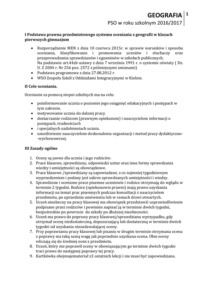 GEOGRAFIA PSO w roku szkolnym 2016/2017 I Podstawa prawna przedmiotowego systemu oceniania z geografii w klasach pierwszych gimnazjum Rozporządzenie MEN z dnia 10 czerwca 2015r. w sprawie warunków i sposobu oceniania, klasyfikowania i promowania uczniów i słuchaczy oraz przeprowadzania sprawdzianów i egzaminów w szkołach publicznych. Na podstawie art.44zb ustawy z dnia 7 września 1991 r. o systemie oświaty ( Dz. U. Z 2004 r. Nr 256 poz. 2572 z późniejszymi zmianami) Podstawa programowa z dnia 27.08.2012 r. WSO Zespołu Szkół z Oddziałami Integracyjnymi w Kielnie. II Cele oceniania. Ocenianie za pomocą stopni szkolnych ma na celu: poinformowanie ucznia o poziomie jego osiągnięć edukacyjnych i postępach w tym zakresie. motywowanie ucznia do dalszej pracy. dostarczanie rodzicom (prawnym opiekunom) i nauczycielom informacji o postępach, trudnościach i specjalnych uzdolnieniach ucznia. umożliwienie nauczycielom doskonalenia organizacji i metod pracy dydaktyczno-wychowawczej. III Zasady ogólne 1. Oceny są jawne dla ucznia i jego rodziców. 2. Prace klasowe, sprawdziany, odpowiedzi ustne oraz inne formy sprawdzania wiedzy i umiejętności są obowiązkowe. 3. Prace klasowe /sprawdziany są zapowiadane, z co najmniej tygodniowym wyprzedzeniem i podany jest zakres sprawdzanych umiejętności i wiedzy. 4. Sprawdzone i ocenione prace pisemne uczniowie i rodzice otrzymują do wglądu w terminie 2 tygodni. Rodzice (opiekunowie prawni) mają prawo uzyskania informacji na temat prac pisemnych podczas konsultacji z nauczycielem przedmiotu, po uprzednim umówieniu lub w ramach drzwi otwartych. 5. Uczeń nieobecny na pracy klasowej ma obowiązek przedstawić usprawiedliwienie podpisane przez rodziców i powinien napisać ją w terminie dwóch tygodni, bezpośrednio po powrocie do szkoły po dłuższej nieobecności. 6. Uczeń ma prawo do poprawy pracy klasowej/sprawdzianu wprzypadku, gdy otrzymał ocenę niedostateczną, dopuszczającą lub dostateczną w terminie dwóch tygodni od uzyskania niezadawalającej oceny. 7. Przy poprawianiu pracy klasowej lub pisaniu w drugim terminie otrzymana ocena z poprawy ma taką samą wagę jak poprzednio uzyskana ocena. Obie oceny wliczają się do średniej ocen z przedmiotu. 8. Uczeń, który nie poprawił oceny w obowiązującym go terminie dwóch tygodni traci prawo do następnej poprawy tej pracy. 9. Kartkówka obejmujemateriał z3 ostatnich lekcji i nie musi być zapowiedziana. 1 GEOGRAFIA PSO w roku szkolnym 2016/2017 10. Korzystanie przez ucznia w czasie prac pisemnych, sprawdzianów, kartkówek i innych form sprawdzania wiedzy z niedozwolonych przez nauczyciela pomocy stanowi podstawę do wystawienia oceny niedostatecznej. 11. Po dłuższej nieobecności w szkole (powyżej 1 tygodnia) uczeń ma prawo być nieoceniany przez jedną lekcję geografii. 12. Uczeń ma prawo do 1-krotnego w ciągu semestru zgłoszenia nieprzygotowania do lekcji. Przez nieprzygotowanie do lekcji rozumiemy: brak zeszytu, brak pracy domowej, niegotowość do odpowiedzi, brak pomocy potrzebnych do lekcji. Każde nieprzygotowanie zaznaczane jest znakiem "-". 13. Po wykorzystaniu limitu określonego powyżej uczeń otrzymuje za każde nieprzygotowanie ocenę niedostateczną. 14. Prace pisemne oceniane są według skali procentowej i przeliczane na oceny: Procent ogólnej liczby punktów Poniżej 30% Co najmniej 31% Co najmniej 50% Co najmniej 70% Co najmniej 86% Co najmniej 96% Ocena Niedostateczny Dopuszczający Dostateczny Dobry Bardzo Dobry Celujący IV Narzędzia pomiaru Formy sprawdzania osiągnięć uczniów : a) prace klasowe / testy b) sprawdziany c) kartkówki d) odpowiedzi ustne z 3 ostatnich lekcji e) prace domowe f) aktywność g) praca dodatkowa i) mapa (odpowiedź ustna, kartkówka) j) karty pracy k) zeszyt przedmiotowy waga 4 waga 3 waga 2 waga 2 waga 2 waga 1 waga 3 waga 3 waga 2 waga 2 l) znaczące wyniki w konkursach: konkurs kuratoryjny Laureat szkolny – waga 5 Laureat gminny – waga 10 Laureat powiatowy – waga 20 Laureat wojewódzki – waga 30 -I, II i III miejsce w konkursie wewnątrzszkolnym – waga 5 2 GEOGRAFIA 3 PSO w roku szkolnym 2016/2017 Ad . a) i b) Prace klasowe/ sprawdziany stanowią podsumowanie treści i umiejętności z danego bloku tematycznego. Praca klasowa trwa maksymalnie 45 minut, umożliwia sprawdzenie wiedzy na wszystkich poziomach wymagań – od koniecznego do wykraczającego. Na tydzień przed pracą klasową uczeń otrzymuje dokładną informację ustną o terminie sprawdzianu oraz zakresie obowiązującego materiału. Szczegółowe zasady odnośnie poprawy prac klasowych/sprawdzianów opisane są w rozdziale III. Ad. c) Kartkówki sprawdzają podstawowe umiejętności, stosowanie schematów opanowanych na ostatnich kilku lekcjach oraz systematyczność pracy. Kartkówki nie muszą być zapowiedziane.Kartkówki nie podlegają poprawie. Ad.e) Sposoby sprawdzania zadań domowych: ilościowy- na lekcji sprawdza się, czy każdy uczeń odrobił pracę domową jakościowy - sprawdzana jest poprawność rozwiązania zadań z ostatniej pracy domowej u wybranych uczniów lub u wszystkich uczniów np. poprzez zabranie przez nauczyciela zeszytów przedmiotowych Ad. f) Przez aktywność na lekcji rozumiemy: częste zgłaszanie się na lekcji i udzielanie poprawnych odpowiedzi, rozwiązywanie zadań dodatkowych w czasie lekcji, aktywną pracę w grupach, rozwiązywanie dodatkowych prac domowych. Ad. g) Udział w pracach długoterminowych (projektach), przygotowanie referatów i prezentacji. Za trzy samodzielnie rozwiązane zadania o podwyższonym stopniu trudności uczeń otrzymuje cząstkową ocenę celującą. Ad. i) Uczniowie są oceniani ze znajomości mapy (kartkówki na mapach konturowych lub odpowiedź ustna przy mapie) Ad. j) i k) Uczeń zobowiązany jest do prowadzenia zeszytu przedmiotowego i zeszytu ćwiczeń/ kart pracy. Oceniana jest systematyczność pracy, staranność i poprawność wykonywanych zadań. Ad. l