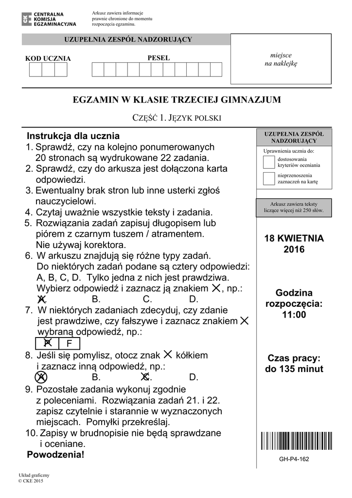 Arkusz zawiera informacje prawnie chronione do momentu rozpoczęcia egzaminu. UZUPEŁNIA ZESPÓŁ NADZORUJĄCY KOD UCZNIA PESEL miejsce na naklejkę EGZAMIN W KLASIE TRZECIEJ GIMNAZJUM CZĘŚĆ 1. JĘZYK POLSKI Instrukcja dla ucznia 1. Sprawdź, czy na kolejno ponumerowanych 20 stronach są wydrukowane 22 zadania. 2. Sprawdź, czy do arkusza jest dołączona karta odpowiedzi. 3. Ewentualny brak stron lub inne usterki zgłoś nauczycielowi. 4. Czytaj uważnie wszystkie teksty i zadania. 5. Rozwiązania zadań zapisuj długopisem lub piórem z czarnym tuszem / atramentem. Nie używaj korektora. 6. W arkuszu znajdują się różne typy zadań. Do niektórych zadań podane są cztery odpowiedzi: A, B, C, D. Tylko jedna z nich jest prawdziwa. Wybierz odpowiedź i zaznacz ją znakiem , np.: A. B. C. D. 7. W niektórych zadaniach zdecyduj, czy zdanie jest prawdziwe, czy fałszywe i zaznacz znakiem wybraną odpowiedź, np.: P F 8. Jeśli się pomylisz, otocz znak kółkiem i zaznacz inną odpowiedź, np.: A. B. C. D. 9. Pozostałe zadania wykonuj zgodnie z poleceniami. Rozwiązania zadań 21. i 22. zapisz czytelnie i starannie w wyznaczonych miejscach. Pomyłki przekreślaj. 10. Zapisy w brudnopisie nie będą sprawdzane i oceniane. Powodzenia! UZUPEŁNIA ZESPÓŁ NADZORUJĄCY Uprawnienia ucznia do: dostosowania kryteriów oceniania nieprzenoszenia zaznaczeń na kartę Arkusz zawiera teksty liczące więcej niż 250 słów. 18 KWIETNIA 2016 Godzina rozpoczęcia: 11:00 Czas pracy: do 135 minut Układ graficzny © CKE 2015 GH-P4-162 Pusta strona 2 GH-P4 Przeczytaj tekst i wykonaj zadania 1.–7. Henryk Sienkiewicz Krzyżacy (fragment) Zbyszko odgarnął włosy, które dawno nie podcinane z przodu, spadały mu aż na brwi, chwilę posiedział w milczeniu, po czym jął mówić: – Dałby Bóg, abym ja tyle mógł wiedzieć o mojej Danuśce, ile wiem o Malborgu. Pytacie, com tam widział? Widziałem potęgę krzyżacką niezmierną, przez wszystkich królów i przez wszystkie narody wspomaganą, z którą nie wiem, czyli kto w świecie mierzyć się zdoła. Widziałem zamek, jakiego chyba i sam cesarz rzymski nie ma. Widziałem skarby nieprzebrane, widziałem zbroje, widziałem mrowie orężnych mnichów, rycerzy i knechtów 1) – i relikwie jakby u Ojca Świętego w Rzymie, i mówię wam, że aże dusza zdrętwiała we mnie, bom sobie pomyślał: gdzie się tam komu na nich porywać? kto ich zmoże? kto się im oprze? kogo ich siła nie przełamie? […] Maćkowi dziwne wydały się […] słowa Zbyszka, więc choć chciało mu się poznać wszystkie przygody młodzianka, jednakże przerwał mu i rzekł: – […] A mało to razy zderzaliśmy się z nimi tarczą o tarcz i łbem o łeb! A toś zabaczył 2), jako im niesporo 3) bywało ku nam – i jak na zatwardziałość naszą narzekali: że to nie dość było konia zapocić i kopię pokruszyć, jeno trza było cudze gardło wziąć albo swoje dać! Byli tam przecie i goście, którzy nas pozywali – a wszyscy z hańbą odeszli. Cóżeś to tak zmiękł? – Nie zmiękłem ja, bom się i w Malborgu potykał, gdzie też i na ostre gonili 4). Ale wy ich wszystkiej potęgi nie znacie. GH-P4 3 Lecz stary rozgniewał się. – A ty znasz-li całą moc polską? Widziałeś wszystkie chorągwie w kupie? Nie widziałeś. A ich potęga na krzywdzie ludzkiej i na zdradzie stoi, bo tam i piędzi 5) ziemi nie ma, która by była ich. Przyjęli ci ich książęta nasi, jak się ubogiego w dom przyjmuje – i obdarowali, a oni porósłszy w moc, pokąsali tę rękę, co ich żywiła, jako psi bezecni 6) i wściekli. Ziemię zagarnęli, miasta zdradą pobrali i ot ich moc! Ale choćby wszyscy królowie świata szli im w pomoc – nadejdzie dzień sądu i pomsty. – Skoroście mi kazali gadać, com widział, a teraz się gniewacie, to wolej zaniecham 7) – rzekł Zbyszko. Maćko zaś sapał przez jakiś czas gniewnie, po chwili jednak uspokoił się i rzekł: – Albo to raz tak bywa! Stoi ci w lesie chojar 8) jako wieża sroga, myślałbyś, że wiek wieków postoi, a stukniesz w niego godnie obuchem, to ci się pustką obezwie. I próchno się w nim sypie. Taka to i krzyżacka moc! 1) 2) 3) 4) 5) 6) 7) 8) Knecht – żołnierz pieszy w dawnym wojsku niemieckim. Zabaczyć – zapomnieć. Niesporo – niechętnie, niewygodnie. Gonić na ostre – pojedynkować się konno na ostre kopie albo włócznie. Piędź – dawna miara długości. Psi bezecni – tu: budzący odrazę. Wolej zaniecham – tu: przestanę opowiadać, zamilknę. Chojar – stare, wysokie drzewo iglaste. [449 słów] 4 GH-P4 Zadanie 1. (0–1) Dokończ zdanie. Zaznacz odpowiedź spośród podanych. Zbyszko kilkakrotnie powtarza „widziałem”, aby A. B. C. D. nawiązać kontakt z rozmówcą. urozmaicić prezentowany opis. wyciszyć emocje towarzyszące rozmowie. wzmocnić wiarygodność swojego przekazu. Zadanie 2. (0–1) Dokończ zdanie. Zaznacz odpowiedź spośród podanych. Maćko odrzuca opinię Zbyszka o Krzyżakach, ponieważ uważa, że Zbyszko A. B. C. D. przecenia potęgę Krzyżaków. sprzymierzył się z Krzyżakami. podał zmyślone informacje o Krzyżakach. lekceważy zagrożenia ze strony Krzyżaków. Zadanie 3. (0–1) Oceń prawdziwość poniższych informacji. Zaznacz P, jeśli informacja jest prawdziwa, albo F – jeśli jest fałszywa. Według Maćka polskich rycerzy charakteryzuje wola walki i niezłomność. P F Według Maćka Krzyżacy byli wdzięczni polskim książętom za okazaną pomoc. P F GH-P4 5 Zadanie 4. (0–1) Dokończ zdanie. Zaznacz odpowiedź spośród podanych. Wypowiedź Maćka dotycząca Krzyżaków „Ale choćby wszyscy królowie świata szli im w pomoc – nadejdzie dzień sądu i pomsty” nie ma charakteru A. B. C. D. groźby. nakazu. ostrzeżenia. przepowiedni. Zadanie 5. (0–1) Dokończ zdanie. Zaznacz odpowiedź spośród podanych. Maćko posłużył się przykładem chojara, aby pokazać, że potęga Krzyżaków jest A. B. C. D. 6 ukryta