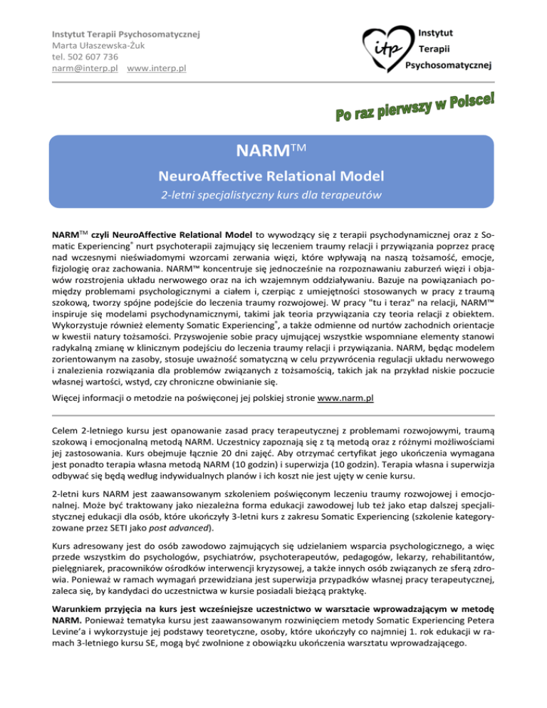 Instytut Terapii Psychosomatycznej Marta Ułaszewska-Żuk tel. 502 607 736 [email protected] www.interp.pl NARMTM NeuroAffective Relational Model 2-letni specjalistyczny kurs dla terapeutów NARMTM czyli NeuroAffective Relational Model to wywodzący się z terapii psychodynamicznej oraz z Somatic Experiencing® nurt psychoterapii zajmujący się leczeniem traumy relacji i przywiązania poprzez pracę nad wczesnymi nieświadomymi wzorcami zerwania więzi, które wpływają na naszą tożsamość, emocje, fizjologię oraz zachowania. NARM™ koncentruje się jednocześnie na rozpoznawaniu zaburzeń więzi i objawów rozstrojenia układu nerwowego oraz na ich wzajemnym oddziaływaniu. Bazuje na powiązaniach pomiędzy problemami psychologicznymi a ciałem i, czerpiąc z umiejętności stosowanych w pracy z traumą szokową, tworzy spójne podejście do leczenia traumy rozwojowej. W pracy "tu i teraz" na relacji, NARM™ inspiruje się modelami psychodynamicznymi, takimi jak teoria przywiązania czy teoria relacji z obiektem. Wykorzystuje również elementy Somatic Experiencing®, a także odmienne od nurtów zachodnich orientacje w kwestii natury tożsamości. Przyswojenie sobie pracy ujmującej wszystkie wspomniane elementy stanowi radykalną zmianę w klinicznym podejściu do leczenia traumy relacji i przywiązania. NARM, będąc modelem zorientowanym na zasoby, stosuje uważność somatyczną w celu przywrócenia regulacji układu nerwowego i znalezienia rozwiązania dla problemów związanych z tożsamością, takich jak na przykład niskie poczucie własnej wartości, wstyd, czy chroniczne obwinianie się. Więcej informacji o metodzie na poświęconej jej polskiej stronie www.narm.pl Celem 2-letniego kursu jest opanowanie zasad pracy terapeutycznej z problemami rozwojowymi, traumą szokową i emocjonalną metodą NARM. Uczestnicy zapoznają się z tą metodą oraz z różnymi możliwościami jej zastosowania. Kurs obejmuje łącznie 20 dni zajęć. Aby otrzymać certyfikat jego ukończenia wymagana jest ponadto terapia własna metodą NARM (10 godzin) i superwizja (10 godzin). Terapia własna i superwizja odbywać się będą według indywidualnych planów i ich koszt nie jest ujęty w cenie kursu. 2-letni kurs NARM jest zaawansowanym szkoleniem poświęconym leczeniu traumy rozwojowej i emocjonalnej. Może być traktowany jako niezależna forma edukacji zawodowej lub też jako etap dalszej specjalistycznej edukacji dla osób, które ukończyły 3-letni kurs z zakresu Somatic Experiencing (szkolenie kategoryzowane przez SETI jako post advanced). Kurs adresowany jest do osób zawodowo zajmujących się udzielaniem wsparcia psychologicznego, a więc przede wszystkim do psychologów, psychiatrów, psychoterapeutów, pedagogów, lekarzy, rehabilitantów, pielęgniarek, pracowników ośrodków interwencji kryzysowej, a także innych osób związanych ze sferą zdrowia. Ponieważ w ramach wymagań przewidziana jest superwizja przypadków własnej pracy terapeutycznej, zaleca się, by kandydaci do uczestnictwa w kursie posiadali bieżącą praktykę. Warunkiem przyjęcia na kurs jest wcześniejsze uczestnictwo w warsztacie wprowadzającym w metodę NARM. Ponieważ tematyka kursu jest zaawansowanym rozwinięciem metody Somatic Experiencing Petera Levine’a i wykorzystuje jej podstawy teoretyczne, osoby, które ukończyły co najmniej 1. rok edukacji w ramach 3-letniego kursu SE, mogą być zwolnione z obowiązku ukończenia warsztatu wprowadzającego. Instytut Terapii Psychosomatycznej Marta Ułaszewska-Żuk tel. 502 607 736 [email protected] www.interp.pl Kurs poprowadzi: Michael Mokrus – akredytowany nauczyciel NARM, licencjonowany terapeuta i superwizor metod Somatic Experiencing i NARM. Michael ukończył również wiele szkoleń z zakresu terapii psychodynamicznej, terapii czaszkowo-krzyżowej oraz integralnej psychoterapii somatycznej. Posiada także wieloletnie doświadczenie w medytacji i praktyce mindfulness. Więcej na www.michaelmokrus.de Zajęcia będą prowadzone w języku angielskim i tłumaczone na język polski. Harmonogram zajęć: 1 moduł: 11-15 marca 2017 r. 2 moduł: 13-17 września 2017 r. 3 moduł: 7-11 lutego 2018 r. 4 moduł: 20-24 czerwca 2018 r. Uwaga! Ilość miejsc ograniczona. Decyduje kolejność zgłoszeń, które przyjmowane będą do 30 listopada 2016 r. tylko poprzez formularz na stronie internetowej Instytutu: www.interp.pl Cena za udział w kursie wynosi 10 400 zł. Płatność w ratach: opłata wpisowa w wysokości 1 600 zł płatna do 15 grudnia 2016 r.* opłaty za każdy z kolejnych zjazdów w wysokości 2 200 zł płatne w terminach do: 10 lutego 2017 r., 11 sierpnia 2017 r., 12 stycznia 2018 r., 18 maja 2018 r. * Opłata wpisowa stanowi bezzwrotną opłatę wstępną, z której pokrywane są koszty rekrutacji uczestników i która jest jednocześnie zobowiązaniem, że zarezerwowane przez uczestnika miejsce będzie przez niego wykorzystane. Nie zostanie ona zwrócona w przypadku rezygnacji z udziału w kursie (za wyjątkiem pisemnego wycofania swojego zgłoszenia przed upływem 14 dni od momentu złożenia aplikacji internetowej). W związku z tym Organizator prosi o podjęcie rozważnej decyzji o zapisie na kurs. Podana cena nie uwzględnia opłat za pobyt w miejscu zajęć, a także terapii oraz superwizji wymaganych do uzyskania certyfikatu. Wpłat – po otrzymaniu potwierdzenia zgłoszenia – należy dokonywać na konto: Instytut Terapii Psychosomatycznej Marta Ułaszewska-Żuk Baranowice 10, 55-080 Kąty Wrocławskie 25 1140 2004 0000 3202 7545 9930 (mBank) tytułem: „kurs NARM” Uwaga! Po upływie terminu poniesienia opłaty wpisowej (15 grudnia 2016 r.) zgłoszenie niepotwierdzone wpływem na konto Organizatora zostanie anulowane. Miejsce szkolenia: Dokładna lokalizacja kursu zostanie przedstawiona uczestnikom w późniejszym terminie. Organizator planuje, że zajęcia odbywać się będą w ośrodku gwarantującym odpowiedni standard 