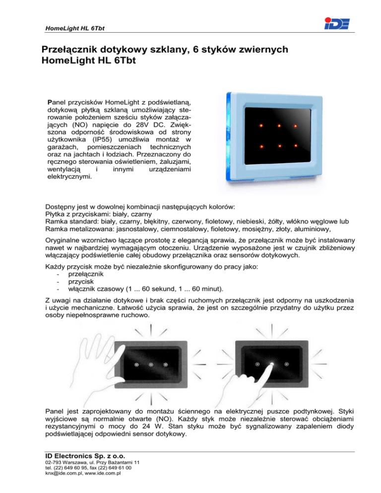 HomeLight HL 6Tbt Przełącznik dotykowy szklany, 6 styków zwiernych HomeLight HL 6Tbt Panel przycisków HomeLight z podświetlaną, dotykową płytką szklaną umoŜliwiający sterowanie połoŜeniem sześciu styków załączających (NO) napięcie do 28V DC. Zwiększona odporność środowiskowa od strony uŜytkownika (IP55) umoŜliwia montaŜ w garaŜach, pomieszczeniach technicznych oraz na jachtach i łodziach. Przeznaczony do ręcznego sterowania oświetleniem, Ŝaluzjami, wentylacją i innymi urządzeniami elektrycznymi. Dostępny jest w dowolnej kombinacji następujących kolorów: Płytka z przyciskami: biały, czarny Ramka standard: biały, czarny, błękitny, czerwony, fioletowy, niebieski, Ŝółty, włókno węglowe lub Ramka metalizowana: jasnostalowy, ciemnostalowy, fioletowy, mosięŜny, złoty, aluminiowy, Oryginalne wzornictwo łączące prostotę z elegancją sprawia, Ŝe przełącznik moŜe być instalowany nawet w najbardziej wymagającym otoczeniu. Urządzenie wyposaŜone jest w czujnik zbliŜeniowy włączający podświetlenie całej obudowy przełącznika oraz sensorów dotykowych. KaŜdy przycisk moŜe być niezaleŜnie skonfigurowany do pracy jako: - przełącznik - przycisk - włącznik czasowy (1 ... 60 sekund, 1 ... 60 minut). Z uwagi na działanie dotykowe i brak części ruchomych przełącznik jest odporny na uszkodzenia i uŜycie mechaniczne. Łatwość uŜycia sprawia, Ŝe jest on szczególnie przydatny do uŜytku przez osoby niepełnosprawne ruchowo. Panel jest zaprojektowany do montaŜu ściennego na elektrycznej puszce podtynkowej. Styki wyjściowe są normalnie otwarte (NO). KaŜdy styk moŜe niezaleŜnie sterować obciąŜeniami rezystancyjnymi o mocy do 24 W. Stan styku moŜe być sygnalizowany zapaleniem diody podświetlającej odpowiedni sensor dotykowy. ID Electronics Sp. z o.o. 02-793 Warszawa, ul. Przy BaŜantarni 11 tel. (22) 649 60 95, fax (22) 649 61 00 [email protected], www.ide.com.pl HomeLight HL 6Tbt Wyjścia: Wymiary (bez płytki z ramką): Parametry techniczne: Urządzenie HomeLight AGHL 6Tbt Zasilanie 10 - 31 V DC Pobór mocy maks. 2,5 W Przyciski 6 dotykowych Wyjścia 6 przekaźnikowych, zwiernych (NO), do 2A kaŜde Temperatura pracy -20 - +45 ºC Wymiary obudowy 118x83x31 mm, nad tynkiem 118x83x10 mm Stopień ochrony IP55 MontaŜ na puszce standard włoski 3M np. Vimar V71303 Uwagi montaŜowe: W trakcie wykonywania instalacji i uruchomienia naleŜy przestrzegać wszystkich przepisów bezpieczeństwa i zasad wykonywania prac elektrycznych. Obwód zasilający powinien być zabezpieczony bezpiecznikiem 2A. Przed podłączeniem kabli zaleŜy wyłączyć zasilanie. Urządzenie nie przeznaczone do sterowania urządzeniami mechanicznymi (windy, wyciągarki, dźwigi) ani sprzętem medycznym. Szczególną ostroŜność naleŜy zachować przy montaŜu i demontaŜu wierzchniej płytki szklanej – w przypadku pęknięcia jest bardzo ostra i moŜe spowodować skaleczenia. Do czyszczenia panelu naleŜy uŜywać wyłącznie wilgotnej szmatki. Nie naleŜy stosować rozpuszczalników ani środków chemicznych. ID Electronics Sp. z o.o. 02-793 Warszawa, ul. Przy BaŜantarni 11 tel. (22) 649 60 95, fax (22) 649 61 00 [email protected], www.ide.com.pl