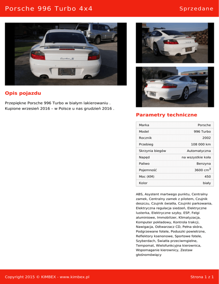 Porsche 996 Turbo 4x4 Sprzedane Opis pojazdu Przepiękne Porsche 996 Turbo w białym lakierowaniu . Kupione wrzesień 2016 – w Polsce u nas grudzień 2016 . Parametry techniczne Marka Porsche Model 996 Turbo Rocznik Przebieg Skrzynia biegów 2002 108 000 km Automatyczna Napęd na wszystkie koła Paliwo Benzyna 3600 cm3 Pojemność Moc (KM) 450 Kolor biały ABS, Asystent martwego punktu, Centralny zamek, Centralny zamek z pilotem, Czujnik deszczu, Czujnik światła, Czujniki parkowania, Elektryczna regulacja siedzeń, Elektryczne lusterka, Elektryczne szyby, ESP, Felgi aluminiowe, Immobilizer, Klimatyzacja, Komputer pokładowy, Kontrola trakcji, Nawigacja, Odtwarzacz CD, Pełna skóra, Podgrzewane fotele, Poduszki powietrzne, Reflektory ksenonowe, Sportowe fotele, Szyberdach, Światła przeciwmgielne, Tempomat, Wielofunkcyjna kierownica, Wspomaganie kierownicy, Zestaw głośnomówiący Copyright 2015 © KIMBEX - www.kimbex.pl Strona 1 z 1