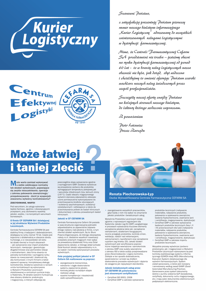 Szanowni Państwo, Kurier Logistyczny z satysfakcją prezentuję Państwu pierwszy numer naszego biuletynu informacyjnego „Kurier Logistyczny” adresowany do wszystkich zainteresowanych usługami logistycznymi w dystrybucji farmaceutycznej. Mimo, że Centrali Farmaceutycznej Cefarm SA przedstawiać nie trzeba – jesteśmy obecni na rynku dystrybucji farmaceutycznej od ponad 60 lat - to w branży usług logistycznych nasza obecność nie była, jak dotąd, zbyt widoczna i chcielibyśmy to zmienić oferując Państwu szeroki wachlarz naszych usług świadczonych przez zespół profesjonalistów. Szczegóły naszej oferty znajdą Państwo na kolejnych stronach naszego biuletynu, do lektury którego serdecznie zapraszam. Z poważaniem Piotr Latawiec Prezes Zarządu Może łatwiej i taniej zlecić M oże warto zamiast wykonywać u siebie zakłócające normalny tok działań wytwórczych, pojawiające się zwykle nieoczekiwanie, operacje z zakresu pakowania zewnętrznego/ przepakowywania - zlecić je wyspecjalizowanemu wytwórcy kontraktowemu? ZDECYDOWANIE, WARTO! Pod warunkiem, że usługa wykonana będzie fachowo, zgodnie z obowiązującymi przepisami, przy zachowaniu wysokiej jakości, szybko, i na korzystnych warunkach biznesowych. O firmie CF CEFARM SA i działającej w jej strukturze Wytwórni Produktów Leczniczych. Centrala Farmaceutyczna CEFARM SA jest stabilną firmą z tradycjami i doświadczeniem, działającą na rynku niemal 70 lat. Często jest kojarzona z działalnością w obszarze obrotu hurtowego, a w rzeczywistości od wielu lat działa również w innych obszarach – jak wytwarzanie oraz import produktów leczniczych, nawiązując i gwarantując długoterminowe oraz partnerskie relacje z kontrahentami. Jako firma otwarta na potrzeby kontrahentów i wymagania rynku stawia na nowoczesność i doskonali się, aby konkurować z innymi firmami a także zapewnić sprawną i kompleksową obsługę kontrahentów. Działania wytwórcze w ramach umów kontraktowych są wykonywane w Wytwórni Produktów Leczniczych zlokalizowanej w centralnym punkcie kraju, w Radomsku. W obrębie wytwórni funkcjonują dwa obszary działania: produkcyjny i magazynowy, w których odbywają się ? poszczególne etapy wytwarzania zgodnie z wymaganiami GMP. Działania wytwórcze są prowadzone zarówno dla produktów wymagających temperatury pokojowej jak i warunków chłodniczych (tzw. łańcuch zimny (2-8°C). Część obszaru magazynowego wytwórni stanowią odpowiednio zabezpieczone pomieszczenia wykorzystywane do przechowywania środków odurzających i substancji psychotropowych, substancji cytostatycznych i cefalosporyn a także do przechowywania próbek do badań klinicznych i dokumentacji z zakresu prowadzonych badań klinicznych. Jakość w CF CEFARM SA Centrala Farmaceutyczna Cefarm SA posiada w swej strukturze organizacyjnej jednostki odpowiedzialne za zapewnienie odpowiedniego nadzoru nad jakością w firmie, w tym również działań wytwórczych. Są to: Biuro Prawno-Organizacyjne, do którego obowiązków należy m.in. śledzenie wszelkich nowelizacji przepisów prawnych mogących mieć wpływ na prowadzoną działalność firmy oraz Dział Zapewnienia Jakości, w którego skład wchodzi Dział Kontroli Jakości odpowiedzialny m.in. za nadzór i kontrolę wykonywanych procesów wytwórczych. Cele przyjętej polityki jakości w CF Cefarm SA realizowane są poprzez: • zaangażowanie kierownictwa, • wdrożenie i ciągłe doskonalenie systemu zapewnienia jakości, • kontrolę jakości na każdym etapie realizacji usługi, • wysokie kompetencje i niezależność osób wykwalifikowanych, Renata Piechorowska-Łyp Osoba Wykwalifikowana Centrala Farmaceutyczna CEFARM SA • zaangażowanie wszystkich pracowników, gdyż każdy z nich ma wpływ na utrzymanie jakości produktów i świadczonych usług. Wytwórnia Produktów Leczniczych działa zgodnie z najnowszymi regulacjami dla Systemów Jakości (wg EU GMP) uwzględniając w procesach wytwarzania kluczowe elementy zarządzania jakością takie jak: zarządzanie odchyleniami, działaniami korygującymi, roczne przeglądy produktów, kontrola zmian, walidacje, nadzór nad reklamacjami, wstrzymaniami /wycofaniami oraz zarządzanie ryzykiem (wg Aneksu 20). Jakość działań wytwórczych jest weryfikowana poprzez liczne inspekcje wewnętrzne i samokontrole z zakresu GMP oraz audyty wewnętrzne z zakresu ISO a także audyty przeprowadzane przez Zleceniodawców i organy kontrolne. Zdobyte w ten sposób doświadczenia, spostrzeżenia i wnioski są źródłem doskonalenia procesów wytwórczych i dążenia do osiągania jak najwyższych standardów. Jakość świadczonych usług przez CF CEFARM SA potwierdzona jest stosownymi certyfikatami: • Certyfikat ISO 9001: 2008 • Certyfikat GMP w zakresie wytwarzania produktów leczniczych (nabywanie materiałów, nabywanie produktów, pakowanie w opakowania zewnętrzne, badania fizykochemiczne, zwalnianie serii i certyfikacja, magazynowanie, dystrybucja) • Certyfikat GMP w zakresie wytwarzania badanych produktów leczniczych (fazy I, II i III) przeznaczonych dla ludzi (nabywanie materiałów, nabywanie produktów, pakowanie w opakowania zewnętrzne, badania fizykochemiczne, zwalnianie serii i certyfikacja, magazynowanie, dystrybucja) • Certyfikat GMP w zakresie importu produktów leczniczych. Wszystkie procesy wytwórcze (zarówno produkcyjne, jak i magazynowe) w Wytwórni Produktów Leczniczych wykonywane są pod kontrolą zwalidowanego systemu informatycznego SZARŻA klasy MES (Manufacturing Execution System) dedykowanego dla wytwórni farmaceutycznych. System został opracowany, a także jest rozwijany i serwisowany według zasad GAMP (Good Automated Manufacturing Practice). Generowane przez system dokumenty istotne z punktu widzenia GxP (świadectwa, certyfikaty, dokumenty ruchu magazynowego, etc.) mają walor dokumentów elektronicznych podpisanych elektronicznie. Zakres świadczonych 