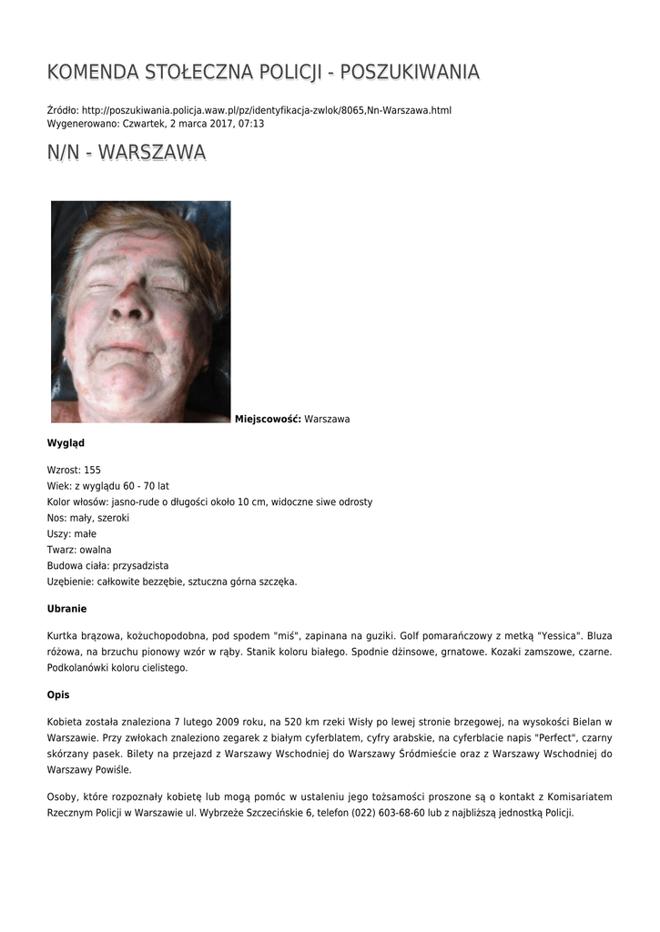 KOMENDA STOŁECZNA POLICJI - POSZUKIWANIA Źródło: http://poszukiwania.policja.waw.pl/pz/identyfikacja-zwlok/8065,Nn-Warszawa.html Wygenerowano: Czwartek, 2 marca 2017, 07:13 N/N - WARSZAWA Miejscowość: Warszawa Wygląd Wzrost: 155 Wiek: z wyglądu 60 - 70 lat Kolor włosów: jasno-rude o długości około 10 cm, widoczne siwe odrosty Nos: mały, szeroki Uszy: małe Twarz: owalna Budowa ciała: przysadzista Uzębienie: całkowite bezzębie, sztuczna górna szczęka. Ubranie Kurtka brązowa, kożuchopodobna, pod spodem "miś", zapinana na guziki. Golf pomarańczowy z metką "Yessica". Bluza różowa, na brzuchu pionowy wzór w rąby. Stanik koloru białego. Spodnie dżinsowe, grnatowe. Kozaki zamszowe, czarne. Podkolanówki koloru cielistego. Opis Kobieta została znaleziona 7 lutego 2009 roku, na 520 km rzeki Wisły po lewej stronie brzegowej, na wysokości Bielan w Warszawie. Przy zwłokach znaleziono zegarek z białym cyferblatem, cyfry arabskie, na cyferblacie napis "Perfect", czarny skórzany pasek. Bilety na przejazd z Warszawy Wschodniej do Warszawy Śródmieście oraz z Warszawy Wschodniej do Warszawy Powiśle. Osoby, które rozpoznały kobietę lub mogą pomóc w ustaleniu jego tożsamości proszone są o kontakt z Komisariatem Rzecznym Policji w Warszawie ul. Wybrzeże Szczecińskie 6, telefon (022) 603-68-60 lub z najbliższą jednostką Policji. Ocena: 0/5 (0) Tweetnij