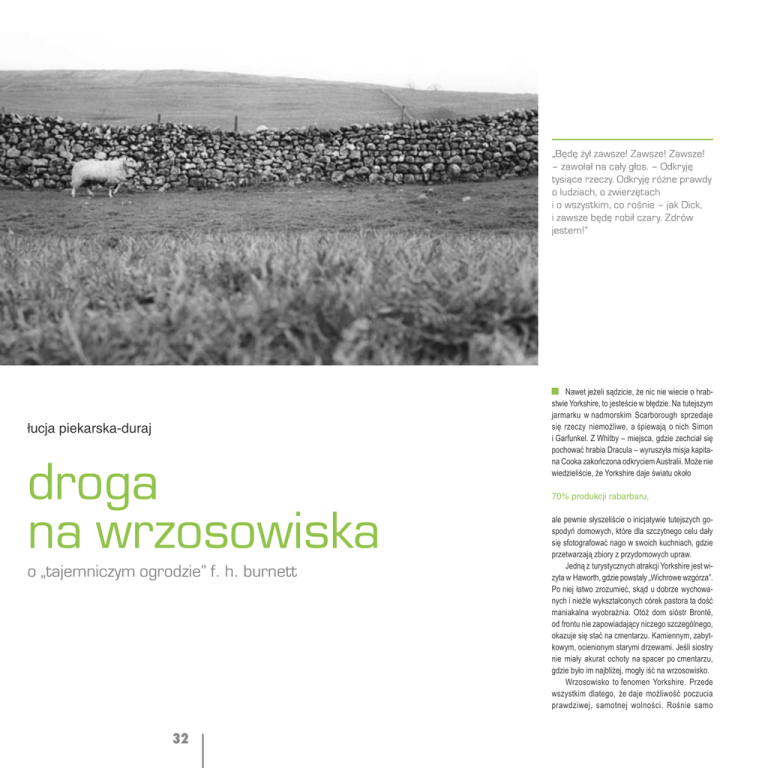 łucja piekarska-duraj droga na wrzosowiska o „tajemniczym ogrodzie” f. h. burnett 32 Nawet jeżeli sądzicie, że nic nie wiecie o hrabstwie Yorkshire, to jesteście w błędzie. Na tutejszym jarmarku w nadmorskim Scarborough sprzedaje się rzeczy niemożliwe, a śpiewają o nich Simon i Garfunkel. Z Whitby – miejsca, gdzie zechciał się pochować hrabia Dracula – wyruszyła misja kapitana Cooka zakończona odkryciem Australii. Może nie wiedzieliście, że Yorkshire daje światu około 70% produkcji rabarbaru, ale pewnie słyszeliście o inicjatywie tutejszych gospodyń domowych, które dla szczytnego celu dały się sfotografować nago w swoich kuchniach, gdzie przetwarzają zbiory z przydomowych upraw. Jedną z turystycznych atrakcji Yorkshire jest wizyta w Haworth, gdzie powstały „Wichrowe wzgórza”. Po niej łatwo zrozumieć, skąd u dobrze wychowanych i nieźle wykształconych córek pastora ta dość maniakalna wyobraźnia. Otóż dom sióstr Brontë, od frontu nie zapowiadający niczego szczególnego, okazuje się stać na cmentarzu. Kamiennym, zabytkowym, ocienionym starymi drzewami. Jeśli siostry nie miały akurat ochoty na spacer po cmentarzu, gdzie było im najbliżej, mogły iść na wrzosowisko. Wrzosowisko to fenomen Yorkshire. Przede wszystkim dlatego, że daje możliwość poczucia prawdziwej, samotnej wolności. Rośnie samo i każdy, kto na nie przyjdzie, ma powód, żeby czuć się u siebie. Ogromna przestrzeń jest wypełniona wiatrem i niebem pokrytym ogromnymi chmurami. Nawet rośliny stają się tu niesamowite. Miejscowi kładą się czasem na ziemi, żeby poczuć jej zapach i napełnić się energią. Może są przez wrzosowisko trochę zdziwaczali, ale z drugiej strony cenią proste przyjemności. Mary, zamieszkałej w kolonialnej rezydencji brytyjskiej w Indiach, umierają wszyscy bliscy, co okazuje się pierwszym realnym, wyrazistym wydarzeniem w jej życiu. Dziewczynka zostaje cudem odnaleziona w przepastnym domu i wysłana do Anglii, do wielkiego i ponurego domu wuja-samotnika w Misselthwaite. Rezydencja jest otoczona ogrodem; obcowanie z przyrodą zaczyna stopniowo przemieniać charakter Mary. Równocześnie bohaterka odkrywa, że w domu mieszka jej zdziwaczały kuzyn Collin, ukrywany przed otoczeniem; wszyscy myślą, że chłopiec jest garbaty i że wkrótce umrze. Pomoc kolegi Mary, Dicka, i jego rodziny – prostych ludzi o dobrym sercu – oraz dobroczynny kontakt z przyrodą sprawia, że chłopiec zostaje przywrócony do normalnego życia. Miejscem owej przemiany staje się odkryty przez dzieci i wspólnie uprawiany 33 wszystkie fot. w artykule: Aleksander Duraj tajemniczy ogród. Tu Collin uczy się chodzić, zaczyna wierzyć, że będzie żył, tu wreszcie nawiązuje kontakt ze swoim ojcem – co ostatecznie uzdrowi ich obydwu. Sentymentalny rys powieści wzmacnia jej edukacyjny wymiar. Dick, anioł na ziemi, uosabia mądrość ludową. Jest idealnym nauczycielem ogrodnictwa, bo jak nikt inny rozumie przyrodę. Wychował się na dzikim wrzosowisku, rozmawia ze zwierzętami, hoduje przydomowy ogródek dla swojej biednej matki, a przy tym, w przeciwieństwie do zepsutych dzieci arystokracji, jest głęboko religijny. Wątek indyjskich wspomnień Mary, które robią na dzieciach ogromne wrażenie, ujawnia wartość codzienności. Motyw przemiany dzieci jest dydak- 34 tycznie bardzo klarowny: osobiste szczęście można osiągnąć jedynie utrzymując kontakty z innymi ludźmi, rezygnując z egocentryzmu i kochając naturę. W świecie rezydencji Misselthwaite realną władzę sprawuje samotny dziwak, który nie ma kontaktu z rzeczywistością. Jego przeciwieństwem jest ostoja normalności i nadzieja na przywrócenie porządku świata: rodzina Zuzanny Sowerby, matki Dicka, która wbrew rozlicznym trudnościom prowadzi szczęśliwy, choć bardzo biedny dom. Stąd posyłane są kosze naturalnej, wiejskiej żywności dla zdrowiejących z nadmiernej pańskości Mary i Collina. Z kolei egzotyczne Indie, opisywane z kolonialną wyższością, pozostają miejscem obcym, w którym bohaterka nigdy nie mogłaby szczęśliwie wydorośleć. Świat pierwszych wspomnień pozostaje dla niej niezrozumiały, to przestrzeń obcości i nudy. Co innego ogród w Misselthwaite: i tu bohaterkę ściągnęła nuda, ale łucja piekarska-duraj – doktorantka w Katedrze Europeistyki UJ, gdzie zajmuje się współczesnymi ruchami kulturowymi i konstruowaniem dziedzictwa europejskiego; w poszukiwaniu resztek angielskiej rewolucji przemysłowej i higienicznej prowincji spędziła rok w Yorkshire wraz z mężem, Aleksandrem, który jest autorem zamieszczonych zdjęć. wkrótce zwyczajny przydomowy ogródek zmienia się w przestrzeń prawdziwych odkryć, z których najważniejszym jest nawiązanie przyjaźni z gilem. Mrukowaty ogrodnik Ben Weatherstaff okazuje się sprzymierzeńcem w odkrywaniu tajemniczego ogrodu; Mary przygląda się z otwartą ze zdumienia buzią jego pracy. Swój własny kawałek ziemi zaczyna uprawiać dokładnie wtedy, kiedy jej osobowość i trudny charakter stają się również gotowe do uprawy. W przydomowym ogrodzie trzeba dużo i ciężko pracować, ale efekty całodziennego wysiłku przynoszą zdumiewające rezultaty, Mary zdrowieje w oczach. Ten ogród daje jej okazję do pierwszego poważnego spotkania z oszałamiającą wiosenną przyrodą. Jednocześnie pozostaje on przestrzenią reguł. Mary nie jest jeszcze na tyle uformowaną osobą, żeby zaistnieć na wrzosowisku – w przestrzeni totalnej swobody. Na razie dobrze porusza się po kontrolowanej i zdyscyplinowanej przestrzeni ogrodu przy domu, przygotowując się do spotkania z dwiema tajemnicami: zagadką ukrywanego przed światem ogrodu oraz niezwykłością dojrzewania i przyjaźni, które Collin nazywa „czarami”, a Dick ujmuje w słowa psalmu. Tajemniczy ogród, przedmurze wrzosowiska, jest wyraźnie ograniczony kamiennym murem. By nie umarł, potrzebuje troskliwej opieki 