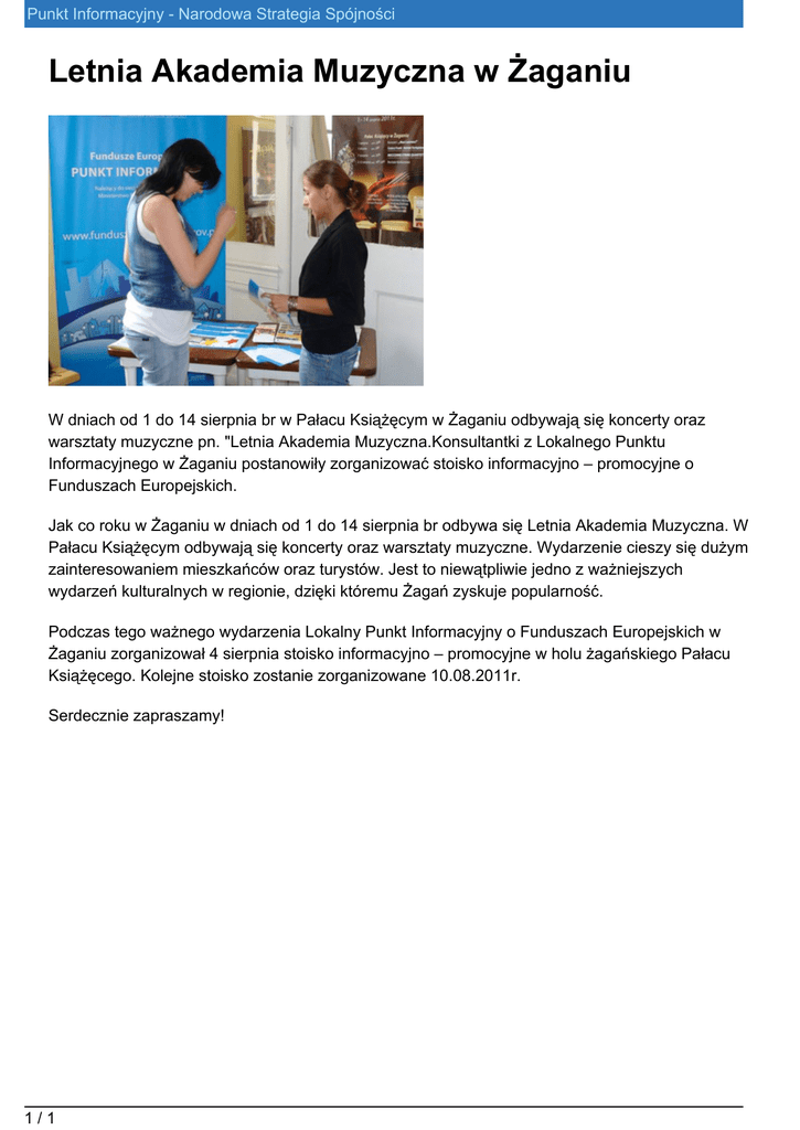Punkt Informacyjny - Narodowa Strategia Spójności Letnia Akademia Muzyczna w Żaganiu W dniach od 1 do 14 sierpnia br w Pałacu Książęcym w Żaganiu odbywają się koncerty oraz warsztaty muzyczne pn. "Letnia Akademia Muzyczna.Konsultantki z Lokalnego Punktu Informacyjnego w Żaganiu postanowiły zorganizować stoisko informacyjno – promocyjne o Funduszach Europejskich. Jak co roku w Żaganiu w dniach od 1 do 14 sierpnia br odbywa się Letnia Akademia Muzyczna. W Pałacu Książęcym odbywają się koncerty oraz warsztaty muzyczne. Wydarzenie cieszy się dużym zainteresowaniem mieszkańców oraz turystów. Jest to niewątpliwie jedno z ważniejszych wydarzeń kulturalnych w regionie, dzięki któremu Żagań zyskuje popularność. Podczas tego ważnego wydarzenia Lokalny Punkt Informacyjny o Funduszach Europejskich w Żaganiu zorganizował 4 sierpnia stoisko informacyjno – promocyjne w holu żagańskiego Pałacu Książęcego. Kolejne stoisko zostanie zorganizowane 10.08.2011r. Serdecznie zapraszamy! 1/1