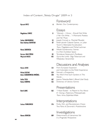 Index of Content „Teksty Drugie” 2009 nr 3 Foreword Ryszard NYCZ 6 Magdalena SIWIEC 11 Stefan ZABIEROWSKI Knut Andreas GRIMSTAD 33 47 Maria ZADENCKA 63 Błoński, Our Contemporary Essays Bartosz MAŁCZYŃSKI Wojciech BAŁ US BAŁUS 85 103 Hanna GOSK 121 Michał KUZIAK Anna CZABANOWSKA CZABANOWSKA-- WRÓBEL 129 140 Feliks TYCH Roma SEND YKA SENDYKA 147 152 Berel LANG 163 Łukasz PA WŁ OWSKI PAWŁ WŁOWSKI 176 Hanna KONICKA 189 “Women – I Know – Should Not Write // Yet I Do Write…” A Romantic Poetess and Her Muse Joseph Conrad vs. Marshall Piłsudski Polish-Jewish Cabaret Games, or, Julian Tuwim’s Attempted Acculturation Trans. Magdalena and Michał Lachman Witold Gombrowicz: Scenes in a Non-Euclidean Space Tymoteusz Karpowicz’s Parallaxes Up to the Limits. Olga Tokarczuk and Władysław Strzemiński Discussions and Analyses From European Expansion and Colonialism to the Polish Experience Norwid, a Prospective You Won’t Find Such Gardens in This World… Joanna Tokarska-Bakir’s Blood Libel Study Dictionary of Literary Genres Presentations “I Have Eluded – to Report to You About It”: Giving a Testimony Philosophically Trans. Anna Ziębińska-Witek Interpretations Purity, Dirt, and Revolutionary Chaos: Two Parts of Żeromski’s Przedwiośnie 4 Investigations Determinants of Literariness Set in a Pragmatic Perspective Commentaries Karolina SZYMANIAK 199 Bożena SHALLCROSS 212 Dorota SAMBORSKA-KUKUĆ 218 Wacław TW ARDZIK TWARDZIK 234 Jan BŁ OŃSKI BŁOŃSKI 245 Marian ZACZYŃSKI 258 Izabela JAROSIŃSKA 262 Małgor zata BÜTHNER -ZA W ADZKA Małgorzata BÜTHNER-ZA -ZAW 269 From Modernisation to Post-Vernacularism. The Most Recent Studies in Modern Yiddish Culture Opinions The Shiver of Delight and History of Literature Abroad Testimonies Remarks to Maryla’s Biography in Light of a Recently Found Document Monographs How to Properly Understand the Last Four Stanzas of Old-Polish Song Maryja, czysta dziewice… (As Opposed to Corrupt Understanding Prevalent till Recently)? Archive Between Rebellion and Runaway. Witold Gombrowicz’s Ferdydurke Jan Błoński’s First Article on Witold Gombrowicz Wanderings My Chatwin. On 20th Anniversary of Bruce Chatwin’s Death The Secret of Miss Domunt Chronicle 278 283 “That Fatal Force Shall Remain of Me…” Authors’ Biographical Notes 5 Marian MACIEJEWSKI