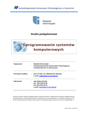 Studia podyplomowe O p ro gr am o wa ni e s y st em ów kom p ute ro wych Organizator : Wydział Informatyki Zachodniopomorski Uniwersytet Technologiczny ul.Żołnierska 49, 71-210 Szczecin Kierownik studiów : prof. dr hab. inż. Włodzimierz Bielecki e-mail: [email protected] Sekretariat : mgr Sylwia Hardej tel.: (91) 449 56 62 fax: (91) 449 55 40 e-mail: [email protected] Zasady realizacji studiów podyplomowych zostały określone w Regulaminie Studiów Podyplomowych prowadzonych w Zachodniopomorskim Uniwersytecie Technologicznym w Szczecinie (Uchwała nr 26 Senatu Zachodniopomorskiego Uniwersytetu Technologicznego w Szczecinie z dnia 23 lutego 2009 r.) Data wydruku: 2011-06-15 Studia podyplomowe: Oprogramowanie systemów komputerowych • KAT EDR A IN Ż YN IERII OPR OGR AMOWAN IA • h tt p: // kio .w i.zu t.e du .pl • SPIS TREŚCI 1. CELE I ZADANIA STUDIÓW 3 2. WARUNKI PRZYJĘCIA 3 3. ORGANIZACJA ZAJĘĆ 3 4. LISTA PRZEDMIOTÓW 4 5. PROGRAMY PRZEDMIOTÓW 5 6. KADRA 9 7. OBSADA ZAJĘĆ 9 8. REGULAMIN STUDIÓW 10 9. KOSZT UCZESTNICTWA 10 2 Studia podyplomowe: Oprogramowanie systemów komputerowych • KAT EDR A IN Ż YN IERII OPR OGR AMOWAN IA • h tt p: // kio .w i.zu t.e du .pl • 1. Cele i zadania studiów Studia podyplomowe Oprogramowanie systemów komputerowych przeznaczone są dla możliwie szerokiego grona absolwentów wyższych uczelni oraz studentów dwóch ostatnich semestrów studiów wyższych zainteresowanych podniesieniem swoich dotychczasowych umiejętności bądź zdobyciem nowych kwalifikacji zawodowych w obszarze oprogramowania komputerowego, stanowiącego od wielu lat atrakcyjny i perspektywiczny rynek pracy. Celem studiów jest przekazanie słuchaczom możliwie szerokiej i praktycznej wiedzy na temat tworzenia i funkcjonowania oprogramowania we współczesnych systemach komputerowych. Zadaniem studiów jest przygotowanie uczestników do: • podjęcia pracy na stanowisku wymagającym wiedzy z dziedziny oprogramowania i dalszego wyprofilowania swojej praktyki zawodowej pod kątem konkretnych zadań realizowanych na danym stanowisku, • wyboru dalszego wąsko-wyspecjalizowanego kierunku kształcenia, przy jednoczesnym zachowaniu szerokiego, racjonalnego spojrzenia na problematykę tworzenia i funkcjonowania oprogramowania. 2. Warunki przyjęcia Uczestnikiem studiów może zostać: absolwent dowolnej wyższej uczelni (pierwszego, drugiego stopnia kształcenia lub jednolitych studiów magisterskich), • studenci dwóch ostatnich semestrów studiów wyższych na zasadach uczestnictwa w kursie. Kandydaci winni złożyć następujące dokumenty: • podanie o przyjęcie na studia, • kwestionariusz osobowy, • 2 zdjęcia dowodowe, • dyplom ukończenia studiów wyższych, względnie odpis dyplomu wydany przez uczelnię, lub zaświadczenie o stanie odbytych studiów (dotyczy studentów dwóch ostatnich semestrów studiów wyższych), oraz podpisać umowę na świadczoną usługę edukacyjną. • Rekrutacja odbywa się bez egzaminów wstępnych w terminie od 15 kwietnia 2011 r. do 12 września 2011 r. O przyjęciu decyduje kolejność zgłoszeń. 3. Organizacja zajęć • • Studia obejmują dwa semestry nauki po 9 zjazdów: semestr I – trwa od 24 września 2011 r. do 29 lutego 2012 r., semestr II – trwa od 1 marca 2012 r. do 29 czerwca 2012 r. 3 Studia podyplomowe: Oprogramowanie systemów komputerowych • KAT EDR A IN Ż YN IERII OPR OGR AMOWAN IA • h tt p: // kio .w i.zu t.e du .pl • Zjazdy odbywają się w 2 dni w tygodniu (sobota i niedziela) w Szczecinie: Dzień tygodnia Sobota Niedziela Typ Zajęcia I Zajęcia II Przerwa Zajęcia III Zajęcia IV Zajęcia V Zajęcia VI Godzina rozpoczęcia 9:00 11:00 12:30 13:30 15:30 10:00 12:00 Godzina zakończenia 10:30 12:30 13:30 15:00 17:00 11:30 13:30 Zajęcia obejmują łącznie 216 godzin (lekcyjnych) nauki w formie wykładów (102 godziny), laboratoriów (102 godziny) oraz sesji seminaryjnych (12 godzin). Zajęcia prowadzone są w nowoczesnych, multimedialnych salach wykładowych … … i laboratoryjnych Wydziału Informatyki Zachodniopomorskiego Uniwersytetu Technologicznego w Szczecinie. Studia kończy obrona pracy dyplomowej. Po ukończeniu studiów podyplomowych słuchacz otrzymuje świadectwo. 4. Lista przedmiotów Lp. Wymiar godzin Nazwa przedmiotu Semestr I 1. Systemy operacyjne 2. Struktury danych 3. Inżynieria oprogramowania 4. Podstawy programowania 5. Projektowanie stron internetowych Semestr II 6. Bazy danych 7. Programowanie obiektowe ( C++, C#, Java ) 8. Aplikacje internetowe 9. Biurowe pakiety oprogramowania 10. Praca końcowa Łącznie : Wykład Laboratorium 108 54 54 Seminarium 0 16 8 8 16 8 8 20 10 10 40 20 20 16 8 8 108 48 48 12 16 8 8 52 26 26 16 8 8 12 6 6 12 12 216 102 102 12 4 Studia podyplomowe: Oprogramowanie systemów komputerowych • KAT EDR A IN Ż YN IERII OPR OGR AMOWAN IA • h tt p: // kio .w i.zu t.e du .pl • 5. Programy przedmiotów • S Y ST EM Y O P ERA C YJ N E Forma zajęć Wykład Zagadnienia Wprowadzenie do systemów operacyjnych (zadania, funkcje, architektura, klasyfikacja). Zarządzanie procesami w systemie operacyjnym (zarządzanie procesami, mechanizmy komunikacji, synchronizacja, blokady). Zarządzanie pamięcią w systemie operacyjnym (stronicowanie pamięci, segmentacja pamięci, pamięć wirtualna, ochrona pamięci). System plików (systemy listowe, systemy indeksowe, ochrona, interfejsy). Laboratorium Podstawowe komponenty systemu operacyjnego (architektura systemu na podstawie Windows). Zarządzanie pamięcią (mechanizmy zarządzania pamięcią na przykładzie Windows i Linux). Zarządzanie procesami (mechanizmy zarządzania procesami na przykładzie Windows i Linux). Zarządzanie systemami plików (mechanizmy zarządzania systemami plików FAT32, NTFS i EXT, ochrona, dostęp zdalny). • S T RU KT U RY D A N YC H Forma zajęć Wykład Zagadnienia Pojęcia podstawowe: typy danych, operatory. Złożone struktury danych: tablica, rekord, zbiór, 