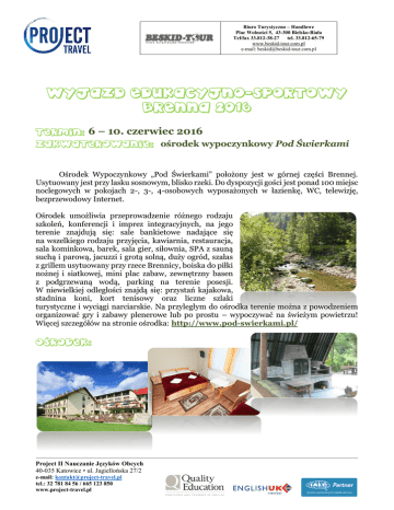 Biuro Turystyczno – Handlowe Plac Wolności 5, 43-300 Bielsko-Biała Tel/fax 33.812-38-27 tel. 33.812-65-79 www.beskid-tour.com.pl e-mail: [email protected] WYJAZD EDUKACYJNO-SPORTOWY BRENNA 2016 TERMIN: 6 – 10. czerwiec 2016 ZAKWATEROWANIE: ośrodek wypoczynkowy Pod Świerkami Ośrodek Wypoczynkowy „Pod Świerkami” położony jest w górnej części Brennej. Usytuowany jest przy lasku sosnowym, blisko rzeki. Do dyspozycji gości jest ponad 100 miejsc noclegowych w pokojach 2-, 3-, 4-osobowych wyposażonych w łazienkę, WC, telewizję, bezprzewodowy Internet. Ośrodek umożliwia przeprowadzenie różnego rodzaju szkoleń, konferencji i imprez integracyjnych, na jego terenie znajdują się: sale bankietowe nadające się na wszelkiego rodzaju przyjęcia, kawiarnia, restauracja, sala kominkowa, barek, sala gier, siłownia, SPA z sauną suchą i parową, jacuzzi i grotą solną, duży ogród, szałas z grillem usytuowany przy rzece Brennicy, boiska do piłki nożnej i siatkowej, mini plac zabaw, zewnętrzny basen z podgrzewaną wodą, parking na terenie posesji. W niewielkiej odległości znajdą się: przystań kajakowa, stadnina koni, kort tenisowy oraz liczne szlaki turystyczne i wyciągi narciarskie. Na przyległym do ośrodka terenie można z powodzeniem organizować gry i zabawy plenerowe lub po prostu – wypoczywać na świeżym powietrzu! Więcej szczegółów na stronie ośrodka: http://www.pod-swierkami.pl/ OŚRODEK: Project II Nauczanie Języków Obcych 40-035 Katowice • ul. Jagiellońska 27/2 e-mail: [email protected] tel.: 32 781 84 56 / 665 123 850 www.project-travel.pl Biuro Turystyczno – Handlowe Plac Wolności 5, 43-300 Bielsko-Biała Tel/fax 33.812-38-27 tel. 33.812-65-79 www.beskid-tour.com.pl e-mail: [email protected] PROGRAM SPORTOWY: Szkółka tenisa - zajęcia z nauki gry w tenisa na poziomie rekreacyjnym. Kurs prowadzony jest przez licencjonowanych i doświadczonych instruktorów sportu. Przez cały wyjazd przebywają na miejscu i są do dyspozycji dzieci jak i ich opiekunów. Program przewidziany jest na 4 dni pobytu w godzinach porannych. Program obejmuje: Naukę gry w tenisa z wykwalifikowanymi instruktorami codziennie (przed południem) od poniedziałku do czwartku, 2 instruktorów / 16 uczniów. Gry i zabawy z animatorem od poniedziałku do środy, prowadzone również równolegle do zajęć sportowych dla pozostałej grupy dzieci, w tym: - językowe harce, czyli zabawa z językiem angielskim, - Waterpolo - zespołowa gra w piłkę wodną, - chusta animacyjna - kolorowy i lekki spadochron pozwalający na przeprowadzenie wielu zajęć integrujących grupę, - Olympic games dla maluszków, - wycieczki po okolicy, spacery trasą wzdłuż Brennicy, - zabawa wodnymi balonami. Dzień Piracki (czwartkowe popołudnie i wieczór) – pierwsza część to przygotowania do bycia prawdziwym rozbójnikiem morskim, a więc stroje, malowanie i tworzenie atrybutów pirackich. Następnie ucharakteryzowane dzieci wyruszają po przygodę w poszukiwaniu skarbów! Na zakończenie dnia, jak to każdy porządny pirat ma w zwyczaju - świętowanie, czyli dyskoteka tematyczna „Piraci z Karaibów”. Piątkowe wycieczki: - klasy 1. - wycieczka do Chlebowej Chaty w Górkach Wielkich (wizyta trwa ok. 3 godziny) – własnoręczne wypiekanie i degustacja podpłomyków, omawianie procesu powstawanie masła, mielenie zboża na żarnach, próby młócenia cepami i przybliżenie życia przodków, - klasy 2. – Studio Filmów Rysunkowych w Bielsku – Białej. Project II Nauczanie Języków Obcych 40-035 Katowice • ul. Jagiellońska 27/2 e-mail: [email protected] tel.: 32 781 84 56 / 665 123 850 www.project-travel.pl Biuro Turystyczno – Handlowe Plac Wolności 5, 43-300 Bielsko-Biała Tel/fax 33.812-38-27 tel. 33.812-65-79 www.beskid-tour.com.pl e-mail: [email protected] CENA: 645 PLN CO W CENIE? Zakwaterowanie z pełnym wyżywieniem Szkolenie z doświadczonym instruktorem sportu Pełny program rekreacyjny Kadra prowadząca zajęcia: - instruktorzy gry w tenisa - lektor języka angielskiego - animatorzy czasu wolnego Korzystanie z basenu i sali gier Bezpłatne miejsca dla 1. wychowawcy na klasę Transport na trasie Katowice – Brenna – Katowice Program może ulec modyfikacji na życzenie grupy Dodatkowe informacje oraz pytania prosimy kierować pod numer tel : 32 781 84 56 lub email: [email protected] Project to firma działająca od 18. lat na rynku, Beskid Tour to biuro turystyczne z ponad 20-letnim doświadczeniem. Wspólnie, stała kadra pracowników organizuje rok w rok projekty wyjazdów zimowych dla szkół. Zapraszamy ! Beskid Tour oraz Project Travel www.beskid-tour.com.pl, www.project-travel.pl NOWOŚĆ! Dla wszystkich uczestników naszego obozu tenisowego, rabat na wakacyjny obóz językowo-sportowy do szkoły tenisowej Rafaela Nadal’a na Majorce! Więcej informacji: [email protected] Project II Nauczanie Języków Obcych 40-035 Katowice • ul. Jagiellońska 27/2 e-mail: [email protected] tel.: 32 781 84 56 / 665 123 850 www.project-travel.pl