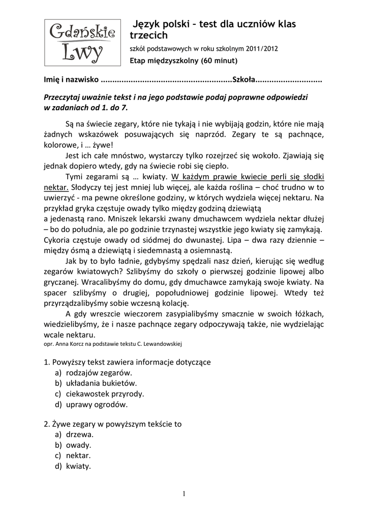 Język polski – test dla uczniów klas trzecich szkół podstawowych w roku szkolnym 2011/2012 Etap międzyszkolny (60 minut) Imię i nazwisko .........................................................Szkoła............................. Przeczytaj uważnie tekst i na jego podstawie podaj poprawne odpowiedzi w zadaniach od 1. do 7. Są na świecie zegary, które nie tykają i nie wybijają godzin, które nie mają żadnych wskazówek posuwających się naprzód. Zegary te są pachnące, kolorowe, i … żywe! Jest ich całe mnóstwo, wystarczy tylko rozejrzeć się wokoło. Zjawiają się jednak dopiero wtedy, gdy na świecie robi się ciepło. Tymi zegarami są … kwiaty. W każdym prawie kwiecie perli się słodki nektar. Słodyczy tej jest mniej lub więcej, ale każda roślina – choć trudno w to uwierzyć - ma pewne określone godziny, w których wydziela więcej nektaru. Na przykład gryka częstuje owady tylko między godziną dziewiątą a jedenastą rano. Mniszek lekarski zwany dmuchawcem wydziela nektar dłużej – bo do południa, ale po godzinie trzynastej wszystkie jego kwiaty się zamykają. Cykoria częstuje owady od siódmej do dwunastej. Lipa – dwa razy dziennie – między ósmą a dziewiątą i siedemnastą a osiemnastą. Jak by to było ładnie, gdybyśmy spędzali nasz dzień, kierując się według zegarów kwiatowych? Szlibyśmy do szkoły o pierwszej godzinie lipowej albo gryczanej. Wracalibyśmy do domu, gdy dmuchawce zamykają swoje kwiaty. Na spacer szlibyśmy o drugiej, popołudniowej godzinie lipowej. Wtedy też przyrządzalibyśmy sobie wczesną kolację. A gdy wreszcie wieczorem zasypialibyśmy smacznie w swoich łóżkach, wiedzielibyśmy, że i nasze pachnące zegary odpoczywają także, nie wydzielając wcale nektaru. opr. Anna Korcz na podstawie tekstu C. Lewandowskiej 1. Powyższy tekst zawiera informacje dotyczące a) rodzajów zegarów. b) układania bukietów. c) ciekawostek przyrody. d) uprawy ogrodów. 2. Żywe zegary w powyższym tekście to a) drzewa. b) owady. c) nektar. d) kwiaty. 1 3. Rozważania na temat odmierzania przez ludzi czasu według zegarów kwiatowych znajdują się w akapicie a) drugim. b) trzecim. c) czwartym. d) piątym. 4. Tytułem najtrafniej oddającym treść tekstu byłyby a) Pachnące zegary. b) Kwiaty w ogrodzie. c) Zapachy kwiatów. d) Rodzaje zegarów. 5. Od najwcześniejszych godzin porannych najwięcej nektaru ofiarowuje owadom a) dmuchawiec. b) cykoria. c) lipa. d) gryka. 6. Gdybyśmy spędzali dzień kierując się zegarem kwiatowym kolację jedlibyśmy o godzinie a) lipowej. b) cykoriowej. c) dmuchawcowej. d) gryczanej. 7. W podkreślonym zdaniu tekstu wyraz perli się znaczy a) ozdabia kwiat. b) spływa po łodyżce. c) pojawia się w postaci kropel. d) znajduje się wewnątrz kwiatu. W zadaniach od 8. do 12. zakreśl poprawne odpowiedzi. 8. Część zegara oraz pouczenie to dwa znaczenia wyrazu a) tarcza. b) wahadło. c) cyferblat. d) wskazówka. 9. Do rodziny wyrazów kwiat zaliczysz wyraz a) róża. b) kwietnik. c) roślina. d) bukiet. 2 10. Równoważnikiem zdania jest a) Kwiaty przypominają zegary. b) Te zegary kwiatowe są punktualne. c) Te zegary to kwiaty. d) Tymi zegarami są kwiaty. 11. Wskaż szereg nazw kwiatów zawierających więcej liter niż głosek. a) Dmuchawiec, chaber. b) Stokrotka, tulipan. c) Lipa, gryka. d) Niezapominajka, krokus. 12. Zdanie „Gryka częstuje owady nektarem tylko między godziną dziewiątą a jedenastą” a) nie zawiera liczebników. b) zawiera cztery rzeczowniki. c) posiada czasownik w 2 osobie liczby pojedynczej. d) jest zdaniem rozkazującym. Przeczytaj uważnie tekst i na jego podstawie podaj poprawne odpowiedzi w zadaniach od 13. do 17. Anna Kamieńska Zegarmistrz W pracowni zegarmistrza Stoją, wiszą zegary, Tu zegar elektryczny, Tu tyka zegar stary. Brzęczą wagi, wahadła, Chroboczą kółka, tryby. Na zegarze gołąbki Całują się na niby. Lecz zegary te same Odmierzają godziny, Szczęście ludzkie i smutek, I śmierć, i narodziny. Zegarmistrz, czasu doktor, Sam nigdy nie ma czasu. Chciałby kiedyś wyjechać Latem na wieś, do lasu. (…) 3 13. Wyrażenie z wiersza „Zegarmistrz”, czasu doktor oznacza, że a) zegarmistrz naprawia zegary lekarzom. b) lekarze zalecają dużo ruchu na świeżym powietrzu. c) zegarmistrz chciałby wyjechać za miasto. d) zegarmistrz naprawia uszkodzone zegary. 14. Wśród wymienionych w wierszu części zegara brakuje: a) wahadła. b) wag. c) wskazówek. d) trybów. 15. W wierszu nie ma mowy o zegarze a) wiszącym. b) stojącym. c) elektrycznym. d) słonecznym. 16. Z treści wiersza wynika, że zegarmistrz a) jest bardzo zapracowany. b) musi udać się do lekarza. c) bardzo lubi swoją pracę. d) posiada tylko zepsute zegary. 17. Zdanie Na zegarze gołąbki całują się na niby jest rozwinięciem zdania a) Gołąbki nie całują się na niby b) Gołąbki całują się. c) Gołąbki całują. d) Gołąbki znajdują się na zegarze. W zadaniach od 18. do 22. zakreśl poprawne odpowiedzi. 18. Cechy charakterystyczne w zawodzie zegarmistrza to: a) pracowitość i uczciwość. b) dokładność i precyzja. c) wytrzymałość i uczynność. d) stanowczość i uprzejmość. 19. Zegar i czasomierz to wyrazy: a) wieloznaczne. b) zdrobniałe. c) z tej samej rodziny wyrazów. d) o podobnym znaczeniu. 4 20. Przymiotniki, które podlegają stopniowaniu to: a) zegarowy, kwiatowe. b) słodki, ciepły. c) słoneczny, ratuszowy. d) kuchenny, szkolny. 21. Wskaż szereg z wyrazami należącymi do tej samej rodziny wyrazów. a) Zegar, zegarem, zegarowi. b) Budzik, stoper, czasomierz. c) Zegarynka, zegarmistrz, zegar. d) Wskazówka, wahadło, zegar. 22. Tę samą zasadę ortograficzną stosujemy do wyrazów a) częstuje, popołudnie, punktualnie. b) pachnące, cicho, piechota. c) żadne, dłużej, żar. d) wierzyć, przykład, spacerze. 23. W poniższych zdaniach podkreśl błędnie użyte wyrazy. Popraw je, zapisując poprawnie wyrazy 
