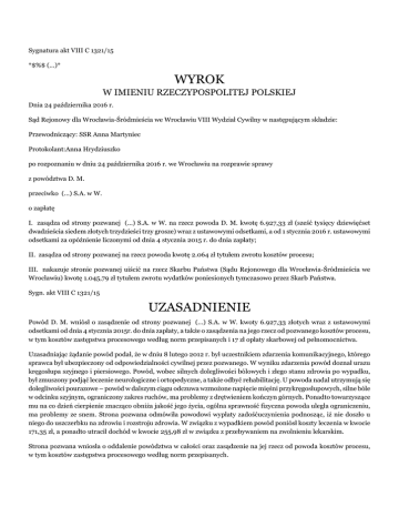 Sygnatura akt VIII C 1321/15 *$%$ (...)* WYROK W IMIENIU RZECZYPOSPOLITEJ POLSKIEJ Dnia 24 października 2016 r. Sąd Rejonowy dla Wrocławia-Śródmieścia we Wrocławiu VIII Wydział Cywilny w następującym składzie: Przewodniczący: SSR Anna Martyniec Protokolant:Anna Hrydziuszko po rozpoznaniu w dniu 24 października 2016 r. we Wrocławiu na rozprawie sprawy z powództwa D. M. przeciwko (...) S.A. w W. o zapłatę I. zasądza od strony pozwanej (...) S.A. w W. na rzecz powoda D. M. kwotę 6.927,33 zł (sześć tysięcy dziewięćset dwadzieścia siedem złotych trzydzieści trzy grosze) wraz z ustawowymi odsetkami, a od 1 stycznia 2016 r. ustawowymi odsetkami za opóźnienie liczonymi od dnia 4 stycznia 2015 r. do dnia zapłaty; II. zasądza od strony pozwanej na rzecz powoda kwotę 2.064 zł tytułem zwrotu kosztów procesu; III. nakazuje stronie pozwanej uiścić na rzecz Skarbu Państwa (Sądu Rejonowego dla Wrocławia-Śródmieścia we Wrocławiu) kwotę 1.045,79 zł tytułem zwrotu wydatków poniesionych tymczasowo przez Skarb Państwa. Sygn. akt VIII C 1321/15 UZASADNIENIE Powód D. M. wniósł o zasądzenie od strony pozwanej (...) S.A. w W. kwoty 6.927,33 złotych wraz z ustawowymi odsetkami od dnia 4 stycznia 2015r. do dnia zapłaty, a także o zasądzenia na jego rzecz od pozwanego kosztów procesu, w tym kosztów zastępstwa procesowego według norm przepisanych i 17 zł opłaty skarbowej od pełnomocnictwa. Uzasadniając żądanie powód podał, że w dniu 8 lutego 2012 r. był uczestnikiem zdarzenia komunikacyjnego, którego sprawca był ubezpieczony od odpowiedzialności cywilnej przez pozwanego. W wyniku zdarzenia powód doznał urazu kręgosłupa szyjnego i piersiowego. Powód, wobec silnych dolegliwości bólowych i złego stanu zdrowia po wypadku, był zmuszony podjąć leczenie neurologiczne i ortopedyczne, a także odbyć rehabilitację. U powoda nadal utrzymują się dolegliwości pourazowe – powód w dalszym ciągu odczuwa wzmożone napięcie mięśni przykręgosłupowych, silne bóle w odcinku szyjnym, ograniczony zakres ruchów, ma problemy z drętwieniem kończyn górnych. Ponadto towarzyszące mu na co dzień cierpienie znacząco obniża jakość jego życia, ogólna sprawność fizyczna powoda uległa ograniczeniu, ma problemy ze snem. Strona pozwana odmówiła powodowi wypłaty zadośćuczynienia podnosząc, iż nie doszło u niego do uszczerbku na zdrowiu i rozstroju zdrowia. W związku z wypadkiem powód poniósł koszty leczenia w kwocie 171,35 zł, a ponadto utracił dochód w kwocie 255,98 zł w związku z przebywaniem na zwolnieniu lekarskim. Strona pozwana wniosła o oddalenie powództwa w całości oraz zasądzenie na jej rzecz od powoda kosztów procesu, w tym kosztów zastępstwa procesowego według norm przepisanych. W uzasadnieniu podniosła, że przeprowadzone postępowanie likwidacyjne nie wykazało istnienia adekwatnego związku przyczynowego pomiędzy zgłoszonymi obrażeniami ciała powoda a przebiegiem kolizji, ponieważ uderzenie pojazdu sprawcy w pojazd powoda nie było na tyle duże, aby jego dolegliwości miały tak rozległy charakter i intensywny przebieg oraz mogły utrzymywać się tak długo. Analizując zakres uszkodzeń pojazdu, którym poruszał się powód strona pozwana stwierdziła, że w wyniku kolizji doszło do niewielkiego uszkodzenia tyłu pojazdu, co świadczy o tym, iż nie mogło dojść do wygenerowania sił bezwładnościowych zdolnych do istotnego przemieszczenia się ciała powoda, a w konsekwencji do jego uszkodzenia. Ponadto analiza wyników badań RTG i MR kręgosłupa powoda nie wykazała zmian pourazowych, a jedynie zmiany zwyrodnieniowe. Sąd ustalił następujący stan faktyczny: W dniu 8 lutego 2012 r. o godz. 7.00 na ul. (...) we W. powód E. Ł. był uczestnikiem kolizji drogowej, w której jadący za nim samochód uderzył w pojazd kierowany przez powoda. Sprawca kolizji był ubezpieczony w zakresie obowiązkowego ubezpieczenia posiadaczy pojazdów mechanicznych stronę pozwaną. okoliczności bezsporne W czasie spisywania oświadczenia przez sprawcę szkody powód zaczął odczuwać ból kręgosłupa szyjnego. Udał się do szpitala, gdzie zdiagnozowano u niego skręcenie i naderwanie odcinka szyjnego kręgosłupa i skręcenie i naderwanie innych i nieokreślonych części klatki piersiowej. Pacjentowi zalecono noszenie kołnierza ortopedycznego oraz dalszą kontrolę w poradni. dowód: - karta informacyjna, k. 13; - wynik badania RTG, k. 13 verte; - przesłuchanie powoda, protokół elektroniczny rozprawy z dnia 7 października 2015 roku, protokół skrócony k. 52. Powód nosił kołnierz usztywniający rzez miesiąc czasu. Czuł się źle, miał bóle kręgosłupa, czuł mrowienie w opuszkach palców prawej ręki. Zażywał leki przeciwbólowe. Na zwolnieniu lekarskim powód pozostawał do 29 lutego 2012 r. Korzystał z pomocy osób trzecich. dowód: - przesłuchanie powoda, protokół elektroniczny rozprawy z dnia 7 października 2015 roku, protokół skrócony k. 52. Powód pozostawał pod opieką poradni chirurgii ogólnej, był konsultowany również przez neurologa. W kwietniu i październiku 2012 r. odbył rehabilitację, a następnie jesienią 2013 r. Miał wykonane badania MR kręgosłupa, które wykazało: centralna przepuklina jądra miażdżycowego C5/C6 wpukla się do kanału kręgowego i wraz z osteofitami na tylno-bocznych krawędziach trzonów uciska na worek oponowy; małe pośrodkowe wypukliny tarcz m-k C3/C4 i C5/ C5 nieco uciskają worek oponowy; obniżenie wysokości tych tarcz m-k z niższym sygnałem w obrazach T2 zależnych odpowiada zmianom degeneracyjnym; drobne zmiany zwyrodnieniowe w trzonach kręgów szyjnych; rdzeń kręgowy szyjny bez zmian. dowód: - historia choroby, k. 14; - historia zdrowia i choroby, k. 15; - wynik badania RTG, k. 16; - informacja dla lekarza kierującego, k. 16 verte, 17; - zaświadczenia lekarskie, k. 18-18 verte; - zaświadczenia, k. 19, 1