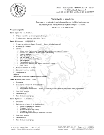 Walentynki w Londynie Zapraszamy młodzież do wzięcia udziału w wyjeździe krajoznawczo edukacyjnym do stolicy Wielkie Brytanii i Anglii – Londynu. Termin: 13 – 18 luty 2016r. Program wyjazdu: Dzień 1 (Sobota - 13.02.2016r.) Wyjazd z Łodzi w godzinach popołudniowych. Przejazd przez Niemcy w kierunku Francji Dzień 2 (Niedziela - 14.02.2016r.) Przeprawa promowa Calais (Francja) – Dover (Wielka Brytania) Przejazd do Londynu Londyn Spacer obok Parlamentu, Opactwa Westminster, Wes rezydencji Premiera Spacer ulicą Whitehall do Koszar Gwardii Konnej, Park Św Jakuba, Pałac Buckingham Plac Piccadilly Circus Czas wolny na Leicester Square Plac Trafalgar. Przejazd do dzielnicy City Spacer obok Katedry Św. Pawła w kierunku Tower Most Tower Przejazd metrem do hostelu Zakwaterowanie w hostelu Obiadokolacja Uwaga!! W tym dniu poruszamy się komunikacją miejską. Dzień 3 (Poniedziałek - 15.02.2016r.) Śniadanie Zwiedzanie wybranych ranych atrakcji Londynu Muzeum Brytyjskie Przejazd do Warner Bros – studio, w którym powstały filmy o przygodach Harry’ego Pottera Powrót do hostelu Obiadokolacja Czas do dyspozycji grupy Dzień 4 (Wtorek - 16.02.2016r.) Śniadanie Zwiedzanie wybranych atrakcji Londynu Spacer po Kesington Gardens Muzeum Techniki Muzeum Historii Naturalnej Zakupy na Oxford St. Muzeum Figur Woskowych Madame Tussaud’s Powrót do hostelu Obiadokolacja Czas do dyspozycji grupy Dzień 5 (Środa - 17.02.2016r.) Śniadanie Wykwaterowanie z hostelu Zwiedzanie wybranych atrakcji Londynu Przejazd nad Tamizę - London Eye Rejs statkiem do Greenwich Muzeum Morskie Spacer w kierunku Obserwatorium - Południk Zero. Wyjazd do Polski. Przejazd do Dover Przeprawa promowa Dover (Wielka (Wi Brytania) - Calais (Francja) Nocny przejazd przez Francję Uwaga!! W tym dniu poruszamy się komunikacją miejską. Dzień 6 (Czwartek - 18.02.2016r.) Przejazd przez Niemcy Przerwa w podróży. Czas na toaletę po całonocnej podróży. Śniadanie – we własnym zakresie. za Powrót do Łodzi w godzinach popołudniowych. Zakwaterowanie: Noclegi w hostelu „Rest Up” Pokoje 4-6 osobowe – łazienki i toalety na korytarzu. Hostel położony w odległości 15 minut od ścisłego centrum Londynu. Wyżywienie: Śniadania i obiadokolacje w hostelu ostelu Na czas zwiedzania każdego dnia wycieczki pakiety p żywieniowe – lunch packet Uwaga! W cenie nie jest zawarte wyżywienie w czasie podróży – radzimy zabrać suchy prowiant na przejazd tam oraz pieniądze na posiłki w podróży powrotnej. Pierwsze świadczenie świadczenie żywieniowe to obiadokolacja w dniu 14.02 (niedziela), a ostatnie śniadanie oraz lunch packet w dniu 17.02 (środa). Uwagi: Program wyjazdu realizowany jest w języku polskim pod przewodnictwem pilota. Poszczególne punkty programu mogą ulec przesunięciu lub zmianie z przyczyn niezależnych od organizatora. Dokumentem uprawniającym do przekroczenia granicy jest ważny!! paszport lub dowód osobisty. Dostęp do bagażu głównego w lukach autokarowych uczestnicy będą mieli dopiero podczas przybycia do hostelu ostelu drugiego dnia. Prosimy o zaopatrzenie bagażu podręcznego w najpotrzebniejsze rzeczy na czas podróży i zwiedzania wybranych atrakcji Londynu. Podróż promem na trasie Calais – Dover – Calais trwa ok 1,5h. Istnieje tam możliwość wykonania porannej toalety po całonocnej podróży autokarem. Na promie można także skorzystać z licznych sklepów, restauracji, kantoru, automatów do gier, sali telewizyjnej. Trasa przejazdu zajmie ok 24 h – Zwiedzanie Londynu rozpocznie się ok. godz. 11.00 czasu lokalnego. Sugerujemy, aby na czas podróży uczestnicy zabrali ok 5 EUR w monetach na toalety w Niemczech. Świadczenia zawarte w cenie: Przejazd komfortowym autokarem Przeprawa promowa Calais –Dover Dover – Calais Zakwaterowanie w hostelu ostelu „Rest Up” w centrum Londynu – 3 noclegi. Wyżywienie - 3 śniadania, 3 lunch packet, 3 obiadokolacje. Opieka pilota / przewodnika na trasie wycieczki. Ubezpieczenie NNW i KL – pakiet ubezpieczeń realizuje Signal Iduna PTU S.A. Koszty wstępów i realizacji acji programu (płatne na miejscu w Londynie) – 85 GBP/osoba Koszt wycieczki: 960 zł /osoba +koszt transportu (w zależności od liczby uczestników wyjazdu) do 44 osób – 375 zł/osoba od 45 osób – 325 zł/osoba Warunki uczestnictwa w wycieczce: Wpłata zaliczki w wysokości 300zł do 31.10.2015r. Wpłata pozostałej kwoty do 15.01.2016r. Dostarczenie karty uczestnika pobranej ze strony biura w nieprzekraczalnym nieprzekraczalnym terminie 20.12.2015r. 20.12.2 Dodatkowe informacje: Istnieje możliwość wpłat ratalnych po telefonicznym kontakcie z biurem. Prosimy o zapoznanie się z regulaminem organizowanych przez Biuro Turystyczne „Dromader Travel” wyjazdów turystycznych, dostępnym na stronie internetowej www.dromader-travel.pl travel.pl Zachęcamy do skorzystania z ubezpieczenia od kosztów rezygnacji. W tym celu prosimy o kontakt z biurem pod numerem telefonu 604 209 215 Po pełnej płatności na życzenie uczestnika bądź płatnika za wyjazd uczestnika wystawiamy faktury VAT. W tym celu prosimy o podanie danych niezbędnych do wystawienia wystawienia w/w dokumentu na email: [email protected] travel.pl Wszelkich niezbędnych informacji udzielimy Państwu pod numerem tel. 604 209 215; 42 659 75 77, lub pod adresem email: [email protected] biuro@dromader Ogólne warunki waru uczestnictwa na stronie: www.dromader-travel.pl travel.pl Dziękujemy za zainteresowanie ofertą Biura Turystycznego „DROMADER travel” adres