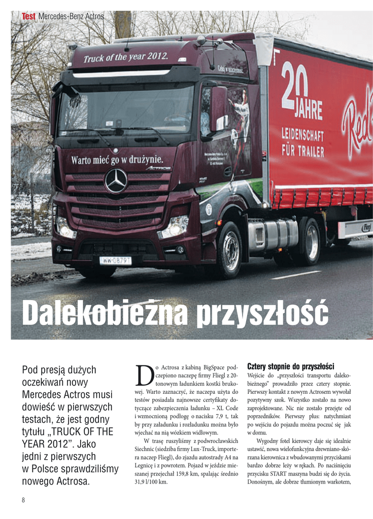 Test Mercedes-Benz Actros Dalekobieżna przyszłość Pod presją dużych oczekiwań nowy Mercedes Actros musi dowieść w pierwszych testach, że jest godny tytułu „TRUCK OF THE YEAR 2012”. Jako jedni z pierwszych w Polsce sprawdziliśmy nowego Actrosa. D o Actrosa z kabiną BigSpace podczepiono naczepę firmy Fliegl z 20tonowym ładunkiem kostki brukowej. Warto zaznaczyć, że naczepa użyta do testów posiadała najnowsze certyfikaty dotyczące zabezpieczenia ładunku – XL Code i wzmocnioną podłogę o nacisku 7,9 t, tak by przy załadunku i rozładunku można było wjechać na nią wózkiem widłowym. W trasę ruszyliśmy z podwrocławskich Siechnic (siedziba firmy Lux-Truck, importera naczep Fliegl), do zjazdu autostrady A4 na Legnicę i z powrotem. Pojazd w jeździe mieszanej przejechał 159,8 km, spalając średnio 31,9 l/100 km. Cztery stopnie do przyszłości Wejście do „przyszłości transportu dalekobieżnego” prowadziło przez cztery stopnie. Pierwszy kontakt z nowym Actrosem wywołał pozytywny szok. Wszystko zostało na nowo zaprojektowane. Nic nie zostało przejęte od poprzedników. Pierwszy plus: natychmiast po wejściu do pojazdu można poczuć się jak w domu. Wygodny fotel kierowcy daje się idealnie ustawić, nowa wielofunkcyjna drewniano-skórzana kierownica z wbudowanymi przyciskami bardzo dobrze leży w rękach. Po naciśnięciu przycisku START maszyna budzi się do życia. Donośnym, ale dobrze tłumionym warkotem, nowoczesny sześciocylindrowy rzędowy silnik, spełniający normę Euro 5, obwieszcza swoją gotowość do pracy. „Początek nowej ery jazdy samochodami ciężarowymi” – to przynajmniej od kilku miesięcy obiecuje Mercedes reklamując swój flagowy pojazd. Na nowo zaprojektowanej, czterokątnej desce rozdzielczej, widnieje duży, wielofunkcyjny wyświetlacz. Z początku liczne informacje wydają się nie do odczytania. Od razu w oczy rzuca się kluczowy wskaźnik biegów. Nowa skrzynia Powershift zostaje uruchomiona przez pierścień w dźwigni znajdującej się po prawej stronie kolumny kierownicy. Równolegle mogą nią być obsługiwane także hamulec silnikowy i retarder. Kompaktowy włącznik po prawej stronie to już historia, tak samo jak manualna skrzynia biegów. Pierwsze zaskoczenie To już nie jest ten Mercedes, którego znamy. Szersze podwozie z napędem na tylną oś na nowo definiuje jazdę Actrosa Wygodny fotel kierowcy daje się idealnie ustawić, nowa wielofunkcyjna drewniano-skórzana kierownica z wbudowanymi przyciskami bardzo dobrze leży w rękach Jak tylko dwunastobiegowa skrzynia zostaje ustawiona na „D”, Actros lekko hamuje. Po naciśnięciu na pedał gazu pojazd spontanicznie i niemal bez chwili zastanowienia rusza. Zaczynając mocno pracę na pierwszym biegu 12,8 l silnik napędza maszynę. Fascynująca jest przy tym zmiana biegów: z szybkim klapnięciem natychmiast zostaje wrzucony następny bieg. Tak zwane „myślenie” w przypadku tej przekładni jest minimalne. Szybko prześlizgując się po kolejnych biegach ciężarówka zadziwiająco sprawnie dociera do przelotowego tempa jazdy. Podwozie czaruje Obciążony Actros szybko i pewnie sunie po wyznaczonym torze. Bez potrzeby jakiejkolwiek korekty, nawet podczas pokonywania zakrętów. To już nie jest ten Mercedes, którego znamy. Szersze podwozie z napędem na tylną oś na nowo definiuje jazdę Actrosa. Przy tym komfort jest ogromny: do zawieszonej w czterech punktach kabiny BigSpace docierają teraz tylko krótkie drgania nierówności drogi. Projektanci podwozia wiele zrobili, by „odzwyczaić” Actrosa od drżenia czy bicia kierownicy podczas jazdy na nierównej drodze. Na prostym odcinku autostrady 450-konny silnik zmierza do celu ospale mieszcząc się w niskich zakresach obrotów zielonego pola. Jazda zdaje się monotonna i nudna, ale i niepozbawiona komfortu. O stałe tempo jazdy na autostradzie dba aktywny tempomat z regulacją odstępu od poprzedzającego pojazdu. Nam szczególnie przypadło do gustu sterowanie tempomatem, które odbywa się za naciśnięciem kciuka na zintegrowane przyciski znajdujące się w prawym ramieniu kierownicy – genialne. Zadane na autostradzie tempo to 86 km/h. Podczas jazdy nie ma też mowy o jakimkolwiek zjechaniu na bok, bo asystent pasa informuje o tym fakcie donośnym „buczeniem”. Kierowca zdaje się więc być sprowadzony do funkcji strażnika dla przemieszczającego się wraz z ładunkiem pojazdu. „Strażnik” Actrosa O komfortowym miejscu pracy dla tego „strażnika” Daimler myślał wyjątkowo ciepło. Przygotowano 6 różnych wariantów kabiny, dwa z nich w wąskiej 2,3 m szerokości. Mercedes chce spełnić wszystkie wymagania stawiane ciężkim pojazdom ciężarowym. ClassicSpace, StreamSpace, BigSpace i GigaSpace – to nazwy dla różnych wersji wysokości. Dla wszystkich wspólne jest kompletne wyposażenie: nowy kokpit, nowe fotele, nowe leżanki, nowe schowki i wiele małych dodatków. Podział kabiny na trzy części (obszar do jazdy, pracy i obszar mieszkalny/sypialny) jest podkreślony przez różne kolory materiałów wyposażenia. Liczba półek i schowków, do tego lodówka na stojące butelki w większych wersjach kabiny oferuje przestrzeń dla wszystkiego podczas dalekiej jazdy. Z wyraźnie większą ofertą schowków w obszarze mieszkalnym i obszarze pracy można lepiej żyć. Duży klubowy fotel po stronie pasażera nadaje się w pełni do relaksu. Rozkładany stolik Test Mercedes-Benz Actros Naczepa Fliegl posiada wzmocnione kłonice - na zdjęciu Herbert Gosebrink W dachu naczepy zamontowano okap, uniemożliwiający zalewanie ładunku do pracy i jedzenia, wygodne, duże łóżka i liczne sensowne detale świadczą o praktycznym podejściu dla poprawienia komfortu kierowcy. Seryjny Fleetboard Jako bezpłatny dodatek dla wszystkich nowych modeli Actrosa Mercedes wbudowuje teraz kompletny hardware Fleetboard. Za darmo przez pierwsze 4 miesiące dostępny jest software, p