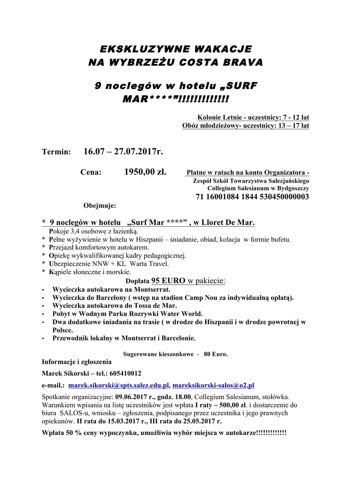 EKSKLUZYWNE WAKACJE NA WYBRZEŻU COSTA BRAVA 9 noclegów w hotelu „SURF MAR****”!!!!!!!!!!!!! Kolonie Letnie - uczestnicy: 7 - 12 lat Obóz młodzieżowy- uczestnicy: 13 – 17 lat Termin: 16.07 – 27.07.2017r. Cena: 1950,00 zł. Płatne w ratach na konto Organizatora Zespół Szkół Towarzystwa Salezjańskiego Collegium Salesianum w Bydgoszczy 71 16001084 1844 530450000003 Obejmuje: * 9 noclegów w hotelu „Surf Mar ****” , w Lloret De Mar. * * * * * • • • • • • Pokoje 3,4 osobowe z łazienką. Pełne wyżywienie w hotelu w Hiszpanii – śniadanie, obiad, kolacja w formie bufetu. Przejazd komfortowym autokarem. Opiekę wykwalifikowanej kadry pedagogicznej. Ubezpieczenie NNW + KL Warta Travel. Kąpiele słoneczne i morskie. Dopłata 95 EURO w pakiecie: Wycieczka autokarowa na Montserrat. Wycieczka do Barcelony ( wstęp na stadion Camp Nou za indywidualną opłatą). Wycieczka autokarowa do Tossa de Mar. Pobyt w Wodnym Parku Rozrywki Water World. Dwa dodatkowe śniadania na trasie ( w drodze do Hiszpanii i w drodze powrotnej w Polsce. Przewodnik lokalny w Montserrat i Barcelonie. Sugerowane kieszonkowe - 80 Euro. Informacje i zgłoszenia Marek Sikorski – tel.: 605410012 e-mail.: [email protected], [email protected] Spotkanie organizacyjne: 09.06.2017 r., godz. 18.00, Collegium Salesianum, stołówka. Warunkiem wpisania na listę uczestników jest wpłata I raty – 500,00 zł. i dostarczenie do biura SALOS-u, wniosku – zgłoszenia, podpisanego przez uczestnika i jego prawnych opiekunów. II rata do 15.03.2017 r., III rata do 25.05.2017 r. Wpłata 50 % ceny wypoczynku, umożliwia wybór miejsca w autokarze!!!!!!!!!!!!!