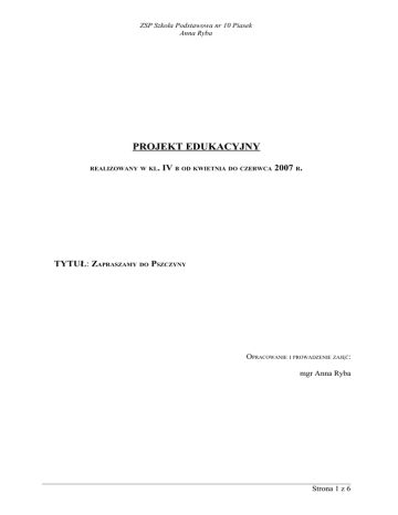 ZSP Szkoła Podstawowa nr 10 Piasek Anna Ryba PROJEKT EDUKACYJNY REALIZOWANY W KL. IV B OD KWIETNIA DO CZERWCA 2007 R. TYTUŁ: ZAPRASZAMY DO PSZCZYNY OPRACOWANIE I PROWADZENIE ZAJĘĆ: mgr Anna Ryba Strona 1 z 6 ZSP Szkoła Podstawowa nr 10 Piasek Anna Ryba TEMAT: Zapraszamy do Pszczyny. CEL GŁÓWNY: wykonanie albumu oraz zawierającego najważniejsze zabytki Pszczyny. CELE SZCZEGÓŁOWE: Uczeń: umie: - wymienić najważniejsze zabytki Pszczyny, - wykonać rysunek lub zredagować opowiadanie, rozumie: - potrzebę poznania zabytków własnego regionu, - potrzebę promowania walorów najbliższej okolicy, - potrzebę kształtowania poczucia piękna i estetyki, potrafi: - opisać wybrany obiekt i określić jego położenie na mapie, - korzystać z różnych źródeł informacji, - korzystać z edytora tekstu, - zaprezentować wybrany zabytek. CZAS REALIZACJI: IV-VI 2007 r. METODY I FORMY PRACY: - metoda projektów, - wycieczka, - konkurs, - projekt zbiorowy, - zamiana ról – uczeń w roli przewodnika. POMOCE DYDAKTYCZNE: - komputery wyposażone w edytor tekstu i grafiki wraz z drukarką, - aparat fotograficzny, - materiały potrzebne do wykonania prac plastycznych i albumu, - mapa Pszczyny, - kartki z pytaniami konkursowymi. OPIS I REALIZACJA PROJEKTU: Projekt jest realizowany na lekcjach wychowawczych, lekcjach informatyki oraz podczas pieszej wycieczki do Pszczyny. Uczniowie poprzez metodę projektów samodzielnie realizują zadania przygotowane i koordynowane przez nauczyciela (wybór i opis zabytku, wykonanie zdjęcia, rysunku, zredagowanie opowiadania). Pewne prace wykonywane są wspólnie (plan wycieczki, album). Ewaluacją projektu opiera się na przeprowadzeniu konkursu w dniu wycieczki: „Znam zabytki Pszczyny” oraz przeprowadzeniu rozmów i ankiety wśród uczniów. Efektem końcowym jest album „Zapraszamy do Pszczyny”. 1. Uczniowie wybierają jeden z zabytków Pszczyny i wyszukują informacji o nim korzystając z różnych źródeł: encyklopedii, albumów, przewodników, Internetu (czas realizacji dwa tygodnie). 2. Korzystając z edytora tekstu sporządzają informację o wybranym zabytku, odpowiednio go formatując (2 lekcje informatyki). Strona 2 z 6 ZSP Szkoła Podstawowa nr 10 Piasek Anna Ryba 3. Uczniowie wraz z nauczycielem przygotowują trasę wycieczki do Pszczyny i sporządzają własną mapę (1 lekcja wychowawcza). 4. Podczas pieszej wycieczki uczniowie pełnią rolę przewodników – opowiadają o wybranym zabytku. Wykonują również zdjęcia, rysunki w plenerze, redagują opowiadanie. Ostatnim punktem wycieczki jest konkurs dotyczący znajomości zabytków oraz ich historii. EFEKTY KOŃCOWE: Efektem końcowym jest wykonanie przy użyciu komputera albumu „Zapraszamy do Pszczyny”, w którym zostaną umieszczone informacje o zabytkach sporządzone przez dzieci, zdjęcia, najciekawsze rysunki i opowiadanie „Dlaczego warto odwiedzić Pszczynę?” OCZEKIWANE REZULTATY: Uczeń po realizacji projektu potrafi: - pogłębić wiedzę o własnym regionie, - poszukać informacji o swojej miejscowości we wszystkich dostępnych źródłach, - wymienić najważniejsze zabytki Pszczyny i ich historię, - uświadomić sobie znaczenie dziedzictwa kulturowego własnego regionu, - przygotować się do publicznych wystąpień, - efektywnie posługiwać się technologia informacyjną. EWALUACJA: Podstawową metodą ewaluacji końcowej będzie konkurs „Znam zabytki Pszczyny”, a także ankieta skierowana do uczniów na temat realizacji projektu i obserwacja zaangażowania uczniów w czasie trwania projektu. Strona 3 z 6 ZSP Szkoła Podstawowa nr 10 Piasek Anna Ryba SCENARIUSZ ZAJĘĆ • Temat: Wycieczka do Pszczyny. • Cel główny: poznanie zabytków Pszczyny. • Cele szczegółowe: Uczeń: umie: - wymienić główne zabytki Pszczyny, - wskazać na mapie dany obiekt, - opowiedzieć historię danego zabytku, - wykonać rysunek lub zredagować opowiadanie, rozumie: - potrzebę poznania zabytków własnego regionu i jego promocji, - potrzebę odpowiedniego zachowania, potrafi: - przygotować się do publicznego wystąpienia, - zaprezentować własną pracę i ocenić prace swoich kolegów, - przestrzegać zasady regulaminu wycieczki. • Czas realizacji: VI 2007 r. • Metody i formy pracy: - wycieczka, - konkurs, - pogadanka, - spontaniczna twórczość: malowanie i pisanie, - zamiana ról – uczeń w roli przewodnika. • Pomoce dydaktyczne: - materiały, które zgromadzili uczniowie, - aparat fotograficzny, - materiały potrzebne do wykonania prac plastycznych i albumu, - mapa Pszczyny, - kartki z pytaniami konkursowymi. • Przebieg: 1. Zbiórka, przypomnienie regulaminu, wyjście wyznaczoną trasą. 2. Prezentacja zabytków na trasie. Każdy uczeń prezentuje dany zabytek – jest przewodnikiem. Uczniowie i nauczyciel wykonują zdjęcia. 3. Rysunek w plenerze. Uczniowie wykonują prace ołówkiem, kredką, węglem: Zamek Pszczyński oraz piszą opowiadanie: Dlaczego warto odwiedzić Pszczynę? 4. Konkurs „Znam zabytki Pszczyny” (załącznik nr 1). • Ewaluacja osiągniętych rezultatów i umiejętności: 1. Ocena i omówienie prac plastycznych i opowiadania. Najciekawsze prace zostaną umieszczone w albumie. - ustalenie kryteriów oceniania prac, - powołanie komisji konkursowej, - przedstawienie wyników prac komisji. 2. Sprawdzenie znajomości zabytków poprzez zorganizowanie konkursu. Ogłoszenie wyników konkursu. Strona 4 z 6 ZSP Szkoła Podstawowa nr 10 Piasek Anna Ryba Załącznik nr 1 Konkurs – Znam zabytki Pszczyny Imię i nazwisko…………………………… 1. W którym wieku Pszczyna otrzymała prawa miejskie? …………………………………………………………. 2. Jaki jest typ Parku Zamkowego? …………………………………………………………. 3. Od czego pochodzi nazwa „Brama Wybrańców”? …………………………………………………………. …………………………………