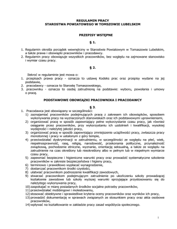 REGULAMIN PRACY STAROSTWA POWIATOWEGO W TOMSZOWIE LUBELSKIM PRZEPISY WSTĘPNE § 1. 1. Regulamin określa porządek wewnętrzny w Starostwie Powiatowym w Tomaszowie Lubelskim, a także prawa i obowiązki pracowników i pracodawcy. 2. Regulamin pracy obowiązuje wszystkich pracowników, bez względu na zajmowane stanowisko i wymiar czasu pracy. § 2. Ilekroć w regulaminie jest mowa o: 1. przepisach prawa pracy - oznacza to ustawę Kodeks prac oraz przepisy wydane na jej podstawie, 2. pracodawcy - oznacza to Starostę Tomaszowskiego, 3. pracowniku - oznacza to osobę zatrudnioną na podstawie: wyboru, powołania i umowy o pracę. PODSTAWOWE OBOWIĄZKI PRACOWNIKA I PRACODAWCY § 3. 1. Pracodawca jest obowiązany w szczególności: 1) zaznajamiać pracowników podejmujących pracę z zakresem ich obowiązków, sposobem wykonywania pracy na wyznaczonych stanowiskach oraz ich podstawowymi uprawnieniami, 2) organizować pracę w sposób zapewniający pełne wykorzystanie czasu pracy, jak również osiąganie przez pracowników, przy wykorzystaniu ich uzdolnień i kwalifikacji, wysokiej wydajności i należytej jakości pracy, 3) organizować pracę w sposób zapewniający zmniejszenie uciążliwości pracy, zwłaszcza pracy monotonnej i pracy w ustalonym z góry tempie, 4) przeciwdziałać dyskryminacji w zatrudnieniu, w szczególności ze względu na płeć, wiek, niepełnosprawność, rasę, religię, narodowość, przekonania polityczne, przynależność związkową, pochodzenie etniczne, wyznanie, orientację seksualną, a także ze względu na zatrudnienie na czas określony lub nieokreślony albo w pełnym lub w niepełnym wymiarze czasu pracy, 5) zapewniać bezpieczne i higieniczne warunki pracy oraz prowadzić systematyczne szkolenie pracowników w zakresie bezpieczeństwa i higieny pracy, 6) terminowo i prawidłowo wypłacać wynagrodzenie, 7) dostarczać pracownikom środki czystości, 8) ułatwiać pracownikom podnoszenie kwalifikacji zawodowych, 9) stwarzać pracownikom podejmującym zatrudnienie po ukończeniu szkoły prowadzącej kształcenie zawodowe lub szkoły wyższej warunki sprzyjające przystosowaniu się do należytego wykonywania pracy, 10) zaspokajać w miarę posiadanych środków socjalne potrzeby pracowników, 11) przeciwdziałać mobbingowi i molestowaniu, 12) stosować obiektywne i sprawiedliwe kryteria oceny pracowników oraz wyników ich pracy, 13) prowadzić dokumentację w sprawach związanych ze stosunkiem pracy oraz akta osobowe pracowników, 14) wpływać na kształtowanie w zakładzie pracy zasad współżycia społecznego. 1 15) zapoznać pracownika z treścią regulaminu pracy przed rozpoczęciem przez niego pracy oraz każdorazowo na życzenie pracownika. Regulamin pracy znajduje się do wglądu w Wydziale Organizacyjno – Administracyjnym Starostwa Powiatowego w Tomaszowie Lubelskim. 16) udostępnić pracownikom tekst przepisów dotyczących równego traktowania w zatrudnieniu w formie pisemnej lub zapewnić pracownikom dostęp do tych przepisów w inny sposób 17) informować pracowników o możliwości zatrudnienia w pełnym lub w niepełnym wymiarze czasu pracy, a pracowników zatrudnionych na czas określony - o wolnych miejscach pracy. 18) Informować pracownika na piśmie, nie później niż w ciągu 7 dni od dnia zawarcia umowy o pracę, o obowiązującej dobowej i tygodniowej normie czasu pracy, częstotliwości wypłaty wynagrodzenia za pracę, urlopie wypoczynkowym oraz długości okresu wypowiedzenia umowy, a jeżeli pracodawca nie ma obowiązku ustalenia regulaminu pracy - dodatkowo o porze nocnej, miejscu, terminie i czasie wypłaty wynagrodzenia oraz przyjętym sposobie potwierdzania przez pracowników przybycia i obecności w pracy oraz usprawiedliwiania nieobecności w pracy. 19) Równo traktować pracowników zatrudnionych w pełnym i niepełnym wymiarze czasu pracy. 20) Przeciwdziałać zachowaniom, których celem lub skutkiem jest naruszenie godności albo poniżenie lub upokorzenie pracownika (molestowanie). §4 1. Pracownik jest obowiązany wykonywać pracę sumiennie i starannie. 2. Pracownik jest obowiązany stosować się do poleceń przełożonych, które dotyczą pracy, a nie są sprzeczne z przepisami prawa lub umową o pracę. 3. Pracownik ma w szczególności obowiązek: 1) przestrzegać ustalonego w zakładzie czasu pracy, 2) przestrzegać ustalonego w zakładzie porządku i regulaminu pracy, 3) przestrzegać przepisy i zasady bhp oraz przeciwpożarowe, 4) przestrzegać w zakładzie pracy zasady współżycia społecznego, okazywać koleżeński stosunek współpracownikom, 5) dbać o dobro zakładu pracy, chronić jego mienie i użytkować je zgodnie z przeznaczeniem, 6) zachowywać porządek na swoim stanowisku pracy, 7) zachowywać porządek i czystość we wszystkich pomieszczeniach, 8) przestrzegać tajemnicy określonej w odrębnych przepisach, 9) zachowywać w tajemnicy informacje, których ujawnienie mogłoby narazić pracodawcę na szkodę, a w szczególności: przechowywać dokumenty (narzędzie i materiały) w miejscu do tego przeznaczonym, po zakończeniu pracy odpowiednio zabezpieczyć dokumenty, narzędzia i materiały. 4. Pracownik nie może w zakresie ustalonym odrębną umową prowadzić działalności konkurencyjnej wobec pracodawcy, a zwłaszcza: prowadzić działalności gospodarczej konkurencyjnej wobec pracodawcy, świadczyć pracy w ramach stosunku pracy lub na innej podstawie na rzecz podmiotu prowadzącego działalność konkurencyjną wobec pracodawcy. 5. Pracownik jest obowiązany złożyć oświadczenie o prowadzeniu działalności gospodarczej wraz z określeniem jej charakteru. CZAS PRACY §5 1. Czasem pracy jest czas, w którym pracownik pozostaje do dyspozycji pracodawcy w siedzibie zakładu lub w innym miejscu wyznaczonym przez pracodawcę do wykonywania pracy. 2. Czas pracy pracowników wynosi 8 godzin na dobę i przeciętnie 40 godzin w przeciętnie pięciodniowym tygodniu pracy w przyję