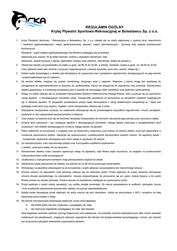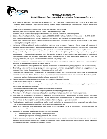 REGULAMIN OGÓLNY Krytej Pływalni Sportowo-Rekreacyjnej w Bolesławcu Sp. z o.o. 1. Kryta Pływalnia Sportowo - Rekreacyjna w Bolesławcu Sp. z o.o. składa się ze strefy wejściowej z szatnią okryć wierzchnich i toaletami ogólnodostępnymi, części gastronomicznej, pływalni, części administracyjno - biurowej oraz zespołu pomieszczeń technicznych. Pływalnia - część obiektu ogólnodostępnego dla klientów znajdująca się za bramką wejściową przy kasach. W jej skład wchodzi: szatnia z zespołem sanitarnym, hala basenowa, zespół saunowy z tężnią i gabinetem masażu oraz solarium, sala fitness, klatka do squash,a. 2. Obiekt jest otwarty od poniedziałku do piątku w godz. od 06.30 do 22.00, w soboty, niedziele i święta w godz. od 08.00 do 22.00. Czas otwarcia może ulec zmianie z przyczyn organizacyjnych ( zawody sportowe, pora roku, awaria, święta itp.) 3. Każda osoba korzystająca z obiektu jest obowiązana do zapoznania się z przepisami regulaminów, obowiązujących na jego terenie i podporządkowania się ich zapisom. 4. Na terenie obiektu znajduje się system monitoringu wizyjnego wraz z zapisem. Nagrania z kamer mogą być podstawą do pociągnięcia do odpowiedzialności w stosunku do użytkowników, którzy nie stosują się do regulaminu oraz instrukcji. Kierownictwo obiektu gwarantuje, iż monitoring prowadzony jest w sposób nie naruszający dóbr osobistych oraz godności użytkowników. 5. Wstęp na obiekt odbywa się na podstawie transpondera Systemu Elektronicznej Obsługi Klienta, który uzyskuje się po wykupieniu usługi zgodnie z obowiązującym cennikiem usług. Transponder upoważnia do korzystania ze wszystkich urządzeń znajdujących się w obiekcie pływalni. W przypadku przedłużenia pobytu bądź skorzystania z usług dodatkowych zarejestruje je i będą one podlegały rozliczeniu przy wyjściu. Zapłata i zwrot transpondera odbywa się w kasie. 6. Wykupienie transpondera oznacza, że użytkownik zobowiązuje się do przestrzegania wszystkich regulaminów i innych zarządzeń, wydanych w celu zapewnienia bezpieczeństwa w obiekcie. 7. Czas pobytu na basenie liczy się od momentu aktywacji transpondera do momentu odczytania jego pamięci przy uiszczeniu opłaty. 8. Zmiana taryf czasowych i cen następuje zgodnie z obowiązującym cennikiem. Usługa będzie rozliczana z uwzględnieniem taryf czasowych i cen biletów obowiązujących w trakcie całego pobytu na pływalni. 9. Pełna należność za korzystanie z urządzeń oraz za ewentualny wydłużony czas pobytu na terenie obiektu musi być regulowana w momencie opuszczenia obiektu. Zakazuje się wypożyczania i przekazywania transpondera osobom trzecim. Za zgubiony pasek - transponder użytkownik obowiązany jest uiścić opłatę w wysokości 50 złotych. 10. Za niewykorzystany czas wykupionego pobytu oraz w przypadku wydalenia użytkownika z obiektu, uiszczone opłaty nie są zwracane. 11. Kierownictwo obiektu może czasowo ograniczyć wstęp na pływalnię, salę fitness bądź saunarium, ze względu na przekroczenie maksymalnej ilości osób korzystających. 12. Użytkownicy z wykupionymi karnetami mają pierwszeństwo wejścia na obiekt. 13. Użytkownicy będą wpuszczani do obiektu nie później niż na 60 minut przed jego zamknięciem. 14. Wchodzący na pływalnię zobowiązani są do korzystania z szatni głównej i pozostawiania tam wierzchniego okrycia . 15. Zmiana ubrania na odpowiedni strój sportowy odbywa się we właściwej szatni. Przed wejściem do szatni basenów obowiązuje zmiana obuwia zewnętrznego na odpowiednie obuwie antypoślizgowe do poruszania się po części mokrej basenu a do szatni fitness zmiana na obuwie sportowe. Zmiana obuwia na zewnętrzne następuje po opuszczeniu szatni. 16. Przed wyjściem z szatni należy sprawdzić, czy szafka została zamknięta. Za rzeczy pozostawione w szafkach: pieniądze, klucze i inne przedmioty wartościowe kierownictwo obiektu nie ponosi odpowiedzialności. 17. Każdą osobę obowiązuje przed wejściem do wody umycie się pod natryskiem, (także po skorzystaniu z WC) i przejście na halę basenową przez brodzik z wodą. 18. Na terenie hali basenowej obowiązuje wyłącznie czysty strój kąpielowy: a. dla kobiet jedno lub dwu częściowy, przylegający do ciała, b. dla mężczyzn kąpielówki przylegające do ciała, bez kieszeni. Strój kąpielowy powinien spełniać wymogi higieniczne oraz estetyczne, nie posiadać zamków błyskawicznych albo innych wstawek metalowych lub plastikowych, mogących stanowić zagrożenie dla zdrowia lub bezpieczeństwa korzystającego i innych, jak również być przyczyną uszkodzeń elementów wyposażenia pływalni. 19. Dzieci do lat 12 mogą przebywać w obiekcie oraz kąpać się wyłącznie pod opieką osób pełnoletnich. Osoby te ponoszą pełną odpowiedzialność za powierzone ich opiece dzieci i odpowiadają za wszelkie szkody przez nie wyrządzone. Opiekun płaci za pobyt na pływalni według obowiązującego cennika. 20. Dzieci do lat 12 mogą przebywać na terenie Obiektu jedynie pod opieką osób dorosłych. 21. Zabrania się pozostawiania na hali basenowej bez nadzoru dzieci nie umiejących pływać. 22. Dzieci do lat 3 korzystające z basenu muszą posiadać na sobie jednorazowe wodoodporne pielucho-majtki do kąpieli. 23. Na teren obiektu zakazany jest wstęp osobom, których stan wskazuje na spożycie alkoholu, z przeciwwskazaniami lekarskimi, chorym na choroby, które mogą być niebezpieczne dla innych użytkowników, chorym z upławami, z otwartymi ranami i stanami zapalnymi skóry, plastrami i bandażami na ciele oraz osobom których stan higieny odbiega od ogólnie przyjętych norm. 24. W celu uzyskania pomocy osoby niepełnosprawne lub ich opiekunowie proszeni są o zgłoszenie się w recepcji. 25. Osoby niepełnosprawne korzystające z pływalni i poruszające się na wózkach, obowiązane są przesiąść się na wózek basenowy w przygotowanych dla nich
