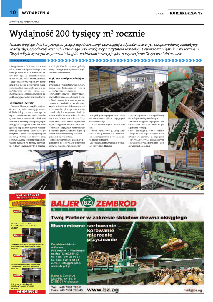 10 WYDARZENIA 1 / 2011 Inwestycje w tartaku Olczyk Wydajność 200 tysięcy m3 rocznie Podczas drugiego dnia konferencji dotyczącej zagadnień energii powstającej z odpadów drzewnych przeprowadzonej z inicjatywy Polskiej Izby Gospodarczej Przemysłu Drzewnego przy współpracy z Instytutem Technologii Drewna oraz między innymi Tartakiem Olczyk odbyła się wizyta w tymże tartaku, gdzie podziwiano inwestycje, jakie poczyniła firma Olczyk w ostatnim czasie. Alicja Bagnucka-Rief - Przygotowania do inwestycji w tartaku Olczyk trwały dość długo – informuje Jacek Kubiak, właściciel firmy PFZ, będącej przedstawicielem firmy HOLTEC oraz Baljer&Zembrod. – Jej początkowym etapem był zakup linii EWD, potem poprawienie manipulacji na linii kopalniaka poprzez zainstalowania dźwigu portalowego Baljer&Zembrod (2007) aż wreszcie zapadła decyzja o modernizacji sortowni. Rozeznania i wizyty - Panowie Olczyk jak zwykle podjęcie decyzji o sposobie inwestycji poprzedzili dokładnym rozeznaniem rynkowym i odwiedzeniem wielu instalacji w Europie – mówi Jacek Kubiak. - Po obejrzeniu znacznej liczby pracujących linii, gdzie szczególnie dokładnie przyglądano się śladom zużycia widocznym po wieloletniej eksploatacji, po wizytach u producentów, wybór padł na firmę HOLTEC jako dostawcę całej sortowni. Wtedy rozpoczęły się długotrwałe dyskusje na tematy techniczne. Jednym z warunków było obrabia- nie długiej i bardzo krzywej „polskiej sosny” i osiągnięcia wydajności rzędu 200 tysięcy m3 rocznie. Wybrano najodpowiedniejsze opcje Ostatecznie by sprostać wymaganiom, jakie posiada tartak, zdecydowano się na następujące rozwiązania: - Dwa stoły podawcze – osobny dla surowca kłodowanego, osobny dla dłużyc. - Dźwig obsługujący główny stół podawczy z chwytakiem zaopatrzonym w piłę łańcuchową, (jednocześnie jest to stanowisko, gdzie operator wpisuje dane każdej dostawy – samochód, kierowca, nadleśnictwo). Piła łańcuchowa służy do rozcinania bardzo krzywych kłód, dzięki czemu uzyskiwane są „bardziej proste” odcinki materiału. - Reduktor napływów korzeniowych z ruchomą głowicą (głowica kręci się wokół unieruchomionej dłużycy) – produkt Baljer&Zembrod. - Piła zainstalowana na podajniku poprzecznym po korowaniu dokonująca pierwszego cięcia „higienicznego”. - Podajnik główny po pomiarze z dwoma tarczowymi piłami kapującymi (układ lustrzany). - Zainstalowanie wyszukiwacza metalu. - System pomiarowy 3D Joerg Elektronik o dużej dokładności i możliwościach zintegrowania z systemem zarządzania tartakiem. - Osobna linia sortownicza dla produktów niewielkiej długości. - System odprowadzania odpadów cięcia podajnikami zgarniakowymi. Aktualnie osiągana wydajność linii dochodzi do 1000 m3 dziennie na jedną zmianę roboczą. Całość obsługuje 5 osób – operator dźwigu na stołach podawczych, 2 operatorów linii pomiaru - pił kapujących - sortowni, pracownik obsługujący ładowarkę, pracownik techniczny – konserwacje i obsługa linii. Fot. KD MEDIA Fabryki Mebli Forte S.A Oddział w Hajnówce 158 000 PLN Pilarka krzywoliniowa CNC Veneta Macchine, model: Atlantis rok: 2007 79 000 PLN Pilarka krzywoliniowa (wymagany szablon) Veneta Macchine, model: Imperial Eagle rok: 2005 106 000 PLN Automatyczna czopiarka 2-głowicowa z podajnikiem, Balestrini, model: Pro 15 rok: 2005 300 000 PLN Linia suszarnicza do krzeseł FMIMPIANTI, model: ST6-1030 rok: 2006 tel. 607496013 WYDARZENIA 1 / 2011 Zdjęcia z etapów: przygotowania i realizacji inwestycji. Fot. Jacek Kubiak Fot. KD MEDIA Ciąg technologiczny w tartaku Olczyk po przeprowadzonych inwestycjach: - 2 stoły podawcze – oddzielny dla dłużycy, oddzielny dla surowca kłodowanego, z których materiał (poprzez podajniki rozdzielające materiał na pojedyncze sztuki) trafia na podajnik prowadzący do korowarki VK. Oba stoły obsługuje dźwig stacjonarny (wykorzystany ze starej linii sortującej). Na stole dłużyc zainstalowana hydrauliczna płyta ustawiająca, której zadaniem jest odpowiednie ustawienie dłużycy przed ogławianiem (redukcja napływów korzeniowych – producent Baljer & Zembrod). - Za korowarką materiał trafia na zespół podajników poprzecznych, gdzie odcinany jest fragment odziomkowy (piła tarczowa) i potem pojedynczo, podajnikiem wzdłużnym przechodzi przez pomiar laserowy Joerg Elektronik GmbH (wieloletni sprawdzony partner firmy HOLTEC w zakresie pomiaru, optymalizacji podziału i zarządzania linią sortowniczą). System poprzez łącza internetowe może być nadzorowany bezpośrednio z niemieckiej siedziby producenta. W wielu krajach Europy Zachodniej pomiar Joerg posiada państwową certyfikację oznaczającą legalizację tak dokonanego pomiaru i stosowanie jej do faktycznych rozliczeń z dostawcą drewna. - Dane z pomiaru pokazują się na monitorach obsługi pił z propozycją podziału kłody wg wprowadzonych do systemu zamówień. (Kłoda z centralnego podajnika podawana jest na jedną lub drugą stronę – zależnie od obłożenia – do którejś tarczowej piły kapującej). Operator może zaakceptować propozycję lub może zmienić podział (stwierdzając np. złą jakość w którymś z fragmentów materiału). Po ustaleniu podziału piła kapująca współpracująca z wagonikiem ustalania wymiaru docina drewno, które wraca na ciąg sortowniczy i po przejściu przez detektor metalu trafia do odpowiedniego boksu. Stamtąd zabierana jest przez ładowarkę na linię przetarcia lub inne linie produkcyjne Tartaku Olczyk. Na oddzielnych krótkich podajnikach taśmowych przenoszone są krótkie odcinki materiału i trafiają one do wydzielonych boksów z systemem zrzucającym dostosowanych właśnie do krótkiego materiału. - Kabiny operatorów znajdują się nad pomieszczeniem technicznym, gdzie umieszczone są wszystkie szafy sterujące elektryczne, agregaty hydrauliczne, systemy smarowania i inne media techn