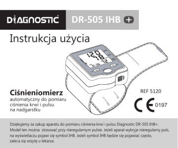 DR-505 IHB Instrukcja użycia Ciśnieniomierz automatyczny do pomiaru ciśnienia krwi i pulsu na nadgarstku REF 5120 0197 Dziękujemy za zakup aparatu do pomiaru ciśnienia krwi i pulsu Diagnostic DR-505 IHB+. Model ten można stosować przy nieregularnym pulsie. Jeżeli aparat wykryje nieregularny puls, na wyświetlaczu pojawi się symbol IHB. Jeżeli symbol IHB będzie się pojawiać często, zaleca się wizytę u lekarza. Spis treści Wstęp. . . . . . . . . . . . . . . . . . . . . . . . . . . . . . . . . . . . . . . . . . . . . . . . . . . . . . . . . . . . . . . . . 2 Ważne uwagi dotyczące bezpieczeństwa . . . . . . . . . . . . . . . . . . . . . . . . . . . . . . 3 Budowa ciśnieniomierza. . . . . . . . . . . . . . . . . . . . . . . . . . . . . . . . . . . . . . . . . . . . . . . 4 Instalowanie/wymiana baterii . . . . . . . . . . . . . . . . . . . . . . . . . . . . . . . . . . . . . . . . . 5 Ustawienia wstępne . . . . . . . . . . . . . . . . . . . . . . . . . . . . . . . . . . . . . . . . . . . . . . . . . . . 7 Poprawny sposób zakładania mankietu . . . . . . . . . . . . . . . . . . . . . . . . . . . . . . 11 Poprawny sposób przeprowadzenia pomiaru. . . . . . . . . . . . . . . . . . . . . . . . . 12 Wykonywanie pomiaru . . . . . . . . . . . . . . . . . . . . . . . . . . . . . . . . . . . . . . . . . . . . . . 15 Funkcja pamięci. . . . . . . . . . . . . . . . . . . . . . . . . . . . . . . . . . . . . . . . . . . . . . . . . . . . . . 17 O ciśnieniu krwi. . . . . . . . . . . . . . . . . . . . . . . . . . . . . . . . . . . . . . . . . . . . . . . . . . . . . . 19 Rozwiązywanie problemów . . . . . . . . . . . . . . . . . . . . . . . . . . . . . . . . . . . . . . . . . . 21 Prawidłowe użytkowanie i konserwacja. . . . . . . . . . . . . . . . . . . . . . . . . . . . . . . 23 Dane techniczne . . . . . . . . . . . . . . . . . . . . . . . . . . . . . . . . . . . . . . . . . . . . . . . . . . . . . 25 Oświadczenie . . . . . . . . . . . . . . . . . . . . . . . . . . . . . . . . . . . . . . . . . . . . . . . . . . . . . . . . 27 Informacje dotyczące urządzenia. . . . . . . . . . . . . . . . . . . . . . . . . . . . . . . . . . . . . 28 Wyjaśnienie użytych symboli . . . . . . . . . . . . . . . . . . . . . . . . . . . . . . . . . . . . . . . . . 29 1 Wstęp Proszę uważnie przeczytać niniejszą instrukcję użycia przed pierwszym zastosowaniem urządzenia. Proszę zachować instrukcję użycia. Informacje w niej zawarte mogą być potrzebne w przyszłości. Urządzenie wykorzystuje oscylometryczną metodę mierzenia ciśnienia krwi. Oznacza to, że urządzenie wykrywa ruch krwi w Państwa tętnicy i przekształca ciśnienie krwi w odczyt cyfrowy. Urządzenie jest proste w obsłudze, ponieważ do przeprowadzenia pomiaru nie jest potrzebny stetoskop. Urządzenie przechowuje automatycznie 90 wyników pomiarów z datą i godziną, które można łatwo odczytać wciskając przyciski pamięci. Część aplikacyjna typu B Uwaga! Przed użyciem zapoznaj się z instrukcją użycia. Symbol do oznaczania urządzeń elektrycznych i elektronicznych zgodnie z Dyrektywą 2002/96/EC. Urządzenie, akcesoria i opakowanie należy na koniec użytkowania odpowiednio utylizować. Informacje dotyczące usuwania tego typu odpadów znajdują się w lokalnych rozporządzeniach lub regulacjach. 2 Ważne uwagi dotyczące bezpieczeństwa Aby poprawnie używać urządzenie, należy zachować podstawowe środki ostrożności oraz stosować się do wskazówek podanych poniżej: Przed pierwszym zastosowaniem urządzenia należy przeczytać instrukcję użycia. Szczegółowych informacji dotyczących ciśnienia krwi należy zasięgnąć u swojego lekarza. Należy stosować się do zaleceń lekarza. Urządzenie należy używać wyłącznie zgodnie z jego przeznaczeniem. Aparatu nie wolno używać do innych celów. Urządzenie jest przeznaczone do mierzenia ciśnienia krwi i tętna u osób dorosłych, nie należy stosować go u noworodków. Nie należy używać telefonu komórkowego w pobliżu urządzenia, może to spowodować błędne działanie urządzenia. Należy unikać używania aparatu w otoczeniu o wysokim promieniowaniu, aby wyniki pomiarów były poprawne. Nie należy rozmontowywać ani podejmować samodzielnych prób naprawy urządzenia lub jego elementów. Nie należy korzystać z urządzenia w obecności łatwopalnego gazu (takiego jak gaz anestetyczny, tlen lub wodór) lub łatwopalnej cieczy (takiej jak alkohol). 3 Budowa ciśnieniomierza ciśnieniomierz z mankietem Wyświetlacz Przycisk Set (Ustawienia) Komora baterii Przycisk Start/Stop Przyciski pamięci Mankiet nadgarstkowy wyświetlacz baterie 2 baterie alkaliczne typu AAA Symbol pamięci numeru pomiaru Ciśnienie skurczowe Symbol wartości średniej Symbol klasyfikacji ciśnienia wg WHO lub pompowanie/wypompowywanie Ciśnienie rozkurczowe Symbol jednostki pomiaru Symbol nieregularnego pulsu Puls Symbol wykrytego tętna Wyświetlacz daty i czasu Wskaźnik rozładowania baterii 4 Uwaga: Nie używać baterii wielokrotnego ładowania Instalowanie / wymiana baterii Jak włożyć baterie 1 Zdjąć pokrywę baterii z komory baterii. 2 Włożyć do komory dwie naładowane baterie typu AAA uważając, by zachować ich prawidłową biegunowość. 5 Instalowanie / wymiana baterii 3 Nałożyć pokrywę baterii. Należy zastosować dwie identyczne UWAGA baterie alkaliczne 1,5V typu AAA LR03 Należy wymienić wszystkie baterie, jeśli na wyświetlaczu pojawi się wskaźnik rozładowania baterii. Nigdy nie należy pozostawiać rozładowanych baterii w komorze baterii, ponieważ może dojść do przecieku i uszkodzenia urządzenia. 6 Ustawienia wstępne Przed wykonaniem pierwszego pomiaru należy dokonać ustawień wstępnych. Urządzenie przechowuje automatycznie 90 wartości pomiarów z datą i godziną. Jeśli aktualna data i godzina nie zostaną ustawione, będą wyświetlane niewłaściwe dane. Ustawienie roku Po włożeniu baterii po raz pierwszy na wy