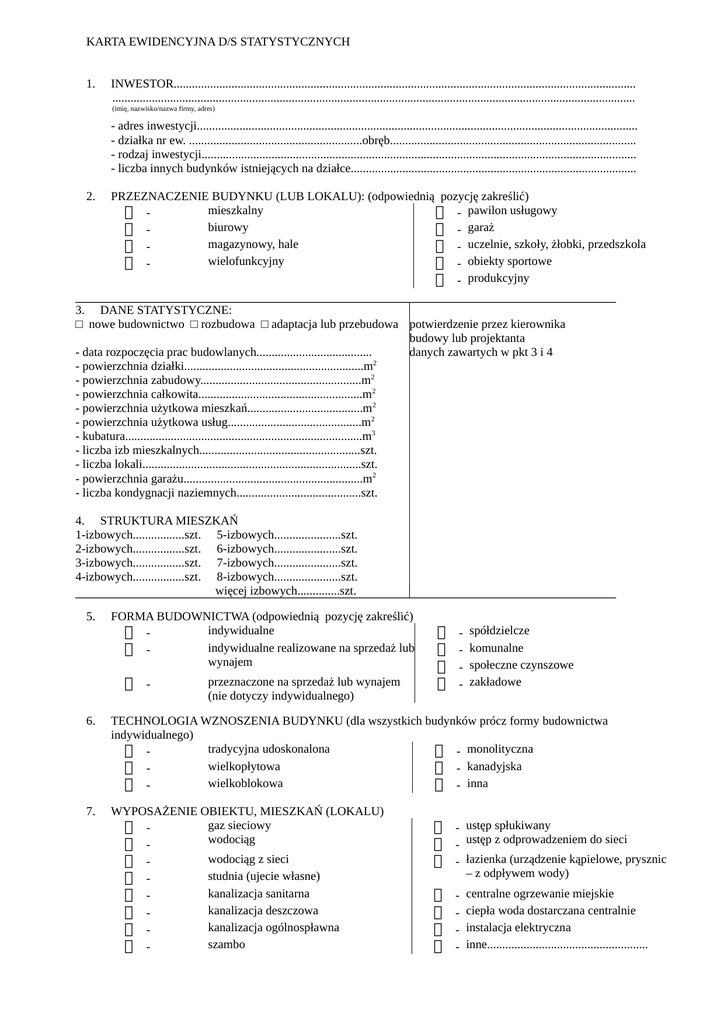 KARTA EWIDENCYJNA D/S STATYSTYCZNYCH 1. INWESTOR........................................................................................................................................................ ............................................................................................................................................................................ (imię, nazwisko/nazwa firmy, adres) - adres inwestycji................................................................................................................................................. - działka nr ew. .........................................................obręb................................................................................. - rodzaj inwestycji............................................................................................................................................... - liczba innych budynków istniejących na działce.............................................................................................. 2. PRZEZNACZENIE BUDYNKU (LUB LOKALU): (odpowiednią pozycję zakreślić) mieszkalny - pawilon usługowy biurowy - garaż magazynowy, hale - uczelnie, szkoły, żłobki, przedszkola wielofunkcyjny - obiekty sportowe - produkcyjny 3. DANE STATYSTYCZNE: □ nowe budownictwo □ rozbudowa □ adaptacja lub przebudowa potwierdzenie przez kierownika budowy lub projektanta - data rozpoczęcia prac budowlanych...................................... danych zawartych w pkt 3 i 4 - powierzchnia działki...........................................................m2 - powierzchnia zabudowy.....................................................m2 - powierzchnia całkowita......................................................m2 - powierzchnia użytkowa mieszkań......................................m2 - powierzchnia użytkowa usług............................................m2 - kubatura..............................................................................m3 - liczba izb mieszkalnych.....................................................szt. - liczba lokali........................................................................szt. - powierzchnia garażu...........................................................m2 - liczba kondygnacji naziemnych.........................................szt. 4. STRUKTURA MIESZKAŃ 1-izbowych.................szt. 5-izbowych......................szt. 2-izbowych.................szt. 6-izbowych......................szt. 3-izbowych.................szt. 7-izbowych......................szt. 4-izbowych.................szt. 8-izbowych......................szt. więcej izbowych..............szt. 5. FORMA BUDOWNICTWA (odpowiednią pozycję zakreślić) indywidualne indywidualne realizowane na sprzedaż lub wynajem - przeznaczone na sprzedaż lub wynajem (nie dotyczy indywidualnego) - spółdzielcze komunalne społeczne czynszowe zakładowe 6. TECHNOLOGIA WZNOSZENIA BUDYNKU (dla wszystkich budynków prócz formy budownictwa indywidualnego) tradycyjna udoskonalona - monolityczna wielkopłytowa - kanadyjska wielkoblokowa - inna 7. WYPOSAŻENIE OBIEKTU, MIESZKAŃ (LOKALU) gaz sieciowy wodociąg wodociąg z sieci studnia (ujecie własne) kanalizacja sanitarna kanalizacja deszczowa kanalizacja ogólnospławna szambo - - ustęp spłukiwany - ustęp z odprowadzeniem do sieci - łazienka (urządzenie kąpielowe, prysznic – z odpływem wody) - centralne ogrzewanie miejskie ciepła woda dostarczana centralnie instalacja elektryczna inne..................................................... 8. CHARAKTERYSTYKA ENERGETYCZNA BUDYNKU Wskaźnik Współczynnik przenikania ciepła U w W/(m²·K)f) EP w kWh ścian Dachu/stropodachu/stropu Podłogi na (m²rok) zewnętrznych pod nieogrzewanymi gruncie w przy ti ≥16oC poddaszami lub nad pomieszczeniu przejazdami przy ti ≥16oC ogrzewanym przy ti ≥16oC okien (z Drzwi w wyjątkiem okien przegrodach połaciowych), zewnętrznych lub drzwi w przegrodach balkonowych między przy ti ≥16oC pomieszczeniami ogrzewanymi i nieogrzewanymi f) W przypadku wystąpienia dla danego rodzaju przegrody więcej niż jednego współczynnika przenikania ciepła U w W(m2·K) np. kilka współczynników przenikania ciepła dla ścian zewnętrznych, należy podać wartość najbardziej niekorzystną pod względem izolacyjności cieplnej (najwiekszą). Oświadczam, że wszystkie powyższe dane są zgodne ze stanem faktycznym. Warszawa, dn...............................r. Podpis inwestora.................................................... W przypadku zgłoszenia więcej niż jednego budynku, kartę ewidencyjną należy wypełniać dla każdego z nich osobno
