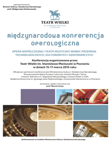 OPERA WSPÓŁCZESNA I TEATR MUZYCZNY WOBEC PRZEMIAN TECHNOLOGICZNYCH, KULTUROWYCH I GOSPODARCZYCH Konferencja organizowana przez Teatr Wielki im. Stanisława Moniuszki w Poznaniu w dniach 15-17 marca 2015 roku Oficjalnym partnerem konferencji jest Ministerstwo Kultury i Dziedzictwa Narodowego, Stowarzyszenie Opera Europa, Culture.pl, Instytut Muzyki i Tańca, Instytut Teatralny im. Zbigniewa Raszewskiego, Instytut Polski w Sofii, Akademia Muzyczna im. Ignacego Jana Paderewskiego, Uniwersytet Ekonomiczny w Poznaniu koncepcja i opieka merytoryczna prof. Marcin Gmys Dofinansowano ze środków Ministerstwa Kultury i Dziedzictwa Narodowego. sobota, 14 marca 2015 19.00 światowa prapremiera Space Opera Aleksander Nowak libretto Georgi Gospodinov kierownictwo muzyczne reżyseria i dekoracje kostiumy reżyseria świateł kierownictwo chóru Marek Moś Ewelina Pietrowiak Katarzyna Nesteruk Marek Rydian Mariusz Otto niedziela, 15 marca 2015 KIERUNKI ROZWOJU WSPÓŁCZESNEJ TWÓRCZOŚCI OPEROWEJ prowadzący: prof. Marcin Gmys 9.00-10.00 rejestracja gości / odbiór materiałów konferencyjnych – hol kasowy 10.00-10.30 oficjalne rozpoczęcie konferencji i powitanie gości dr Zenon Butkiewicz, Dyrektor Departamentu Narodowych Instytucji Kultury MKiDN Siły i środki naszej sceny - dziś. 10.30-11.00 dr Achim Heidenreich Współczesny teatr operowy Niemiec. 11.00-12.00 I panel dyskusyjny Czy opera współczesna jest nowym gatunkiem opery, teatralnym czy muzycznym? dyskutanci: dr Achim Heidenreich, dr Georgi Gospodinov, Peter Plamenow, Marek Moś, dr Hieronim Grala 12.00-12.30 przerwa kawowa 12.30-13.00 dr Lewon Akopjan Nowa opera rosyjska w kraju i za granicą. 13.00-14.00 II panel dyskusyjny Jak przestrzeń spektaklu wyznacza tradycja i jak można ją złamać? dyskutanci: dr Lewon Akopjan, Jon Skulberg, Karyl Charna Lynn, prof. Dobrochna Ratajczakowa 14.00-16.00 przerwa - lunch 16.00-16.30 prof. Michał Bristiger Opery Mieczysława Wajnberga. 18.00 Space Opera Aleksander Nowak poniedziałek, 16 marca 2015 REALIZACJA OPERY WSPÓŁCZESNEJ I JEJ MIEJSCE W REPERTUARZE OPEROWYM prowadzący: dr Piotr Deptuch 9.00-10.00 rejestracja gości / odbiór materiałów konferencyjnych – hol kasowy 10.00-10.30 dr Achim Heidenreich Twórczość operowa Wolfganga Rihma. 10.30-11.30 I panel dyskusyjny Czy opera jest sztuką popularną czy sztuką wysoką, czy może…? dyskutanci: dr Achim Heidenreich, Andrzej Kosowski, Aleksander Nowak, Aleksander Laskowski, Paweł Potoroczyn, dr Hieronim Grala 11.30-12.00 przerwa kawowa 12.00-12.30 dr hab. Stefan Keym Strategie zakończeń we współczesnym teatrze muzycznym – od Luigiego Nono do Wolfganga Rihma. 12.30-13.30 II panel dyskusyjny Dlaczego reżyser jest potrzebny operze i co ma do tego interpretacja? dyskutanci: dr hab. Stefan Keym, Ran Arthur Braun, Krzysztof Cicheński, Łukasz Grabuś 13.30-15.30 przerwa - lunch 15.30-16.00 mgr Aneta Derkowska Zjawisko hybrydyczności w polskiej operze współczesnej. 16.00-17.00 III panel dyskusyjny Kompozytor – bóg czy rzemieślnik? Jaka jest rola librecisty, scenografa, reżysera? dyskutanci: Aneta Derkowska, Eugeniusz Knapik, Daniel Knapp, Nicholas Payne, Ewelina Pietrowiak, Gabriel Chmura, Aleksander Nowak 17.00-17.30 dr Agnieszka Draus Pytanie o operowość Dienstag aus Licht Karlheinza Stockhausena, egzotyczno-futurystycznej części wielkiego teatru świata Licht. 17.30-18.00 przerwa kawowa 18.00-18.30 prof. Marcin Gmys W kleszczach konwencji? O operach Thomasa Adèsa. 18.30-19.30 IV panel dyskusyjny Jak ewoluuje konwencja operowa i jej estetyka? dyskutanci: prof. Marcin Gmys, András Almási-Tóth, Nicholas Payne, Aleksander Nowak, dr Agnieszka Draus wtorek, 17 marca 2015 OPERA WSPÓŁCZESNA A ZARZĄDZANIE INSTYTUCJĄ KULTURY prowadzący: Aleksander Laskowski 9.00-10.00 rejestracja gości / odbiór materiałów konferencyjnych – hol kasowy 10.00-10.30 prof. Henryk Mruk Rola marki i narzędzia jej kreowania. 10.30-11.30 I panel dyskusyjny Opera potrzebuje marki – jak ją stworzyć? dyskutanci: prof. Henryk Mruk, Daniel Knapp, Nicholas Payne 11.30-12.00 przerwa kawowa 12.00-12.30 Luke O’Shaughnessy Prezentacja Opera Europa Digital Project. 12.30-13.30 II panel dyskusyjny Opera jako nowoczesna instytucja kultury – co to znaczy? dyskutanci: prof. Henryk Mruk, Karyl Charna Lynn, Dorota Buchwald, prof. Krzysztof Pleśniarowicz 13.30-15.20 przerwa - lunch 15.20-15.30 Peter de Caluwe, dyrektor La Monnaie prezentacja 15.30-16.30 III panel dyskusyjny Jak wpisać operę współczesną do repertuaru? dyskutanci: Gabriel Chmura, Daniel Knapp, Bruno Coli, dr Ewa Schreiber 19.30 spektakl Anioł dziwnych przypadków Bruno Coli libretto kompozytora na podstawie opowiadania Edgara Allana Poego kierownictwo muzyczne reżyseria dekoracje kostiumy reżyseria świateł 20.30 bankiet kończący konferencję Grzegorz Wierus Krzysztof Cicheński Magda Flisowska Laura Skowron Marek Rydian Aleksander Nowak SPACE OPERA Będą tacy, którym tytuł skojarzy się z arcydziełem Stanleya Kubricka. Będą i tacy, którym przywiedzie na myśl operę mydlaną, tyle że rozgrywającą się w przestrzeni kosmicznej. I jedni, i drudzy się nie pomylą. Aleksander Nowak we współpracy z librecistą Georgim Gospodinowem – bułgarskim pisarzem średniego pokolenia, którego zwą czasem „ironistą rozpaczy” – opowiedzą o pierwszej załogowej wyprawie na Marsa. Głosami małżeńskiej pary astronautów w średnim wieku, podróżującej na gapę muchy, kierownika lotu – mężczyzny o niezbyt czystych intencjach – oraz chóru reprezentującego już to muszki owocowe, już to resztę ludzkości. Przyjdzie pora na refleksję, czy byliśmy gotowi na ten Kosmos i czy przypadkiem trochę się nie pośpieszyliśmy. Bruno Coli ANIOŁ DZIWNYCH PRZYPADKÓW To jedno z mniej znanych opowiadań Edgara Allana Poego. Los sceptycznego młodzieńca, który odrobinę zbyt często zagląda do kieliszka, zmienia się diametralnie, kiedy na jego drodze staje