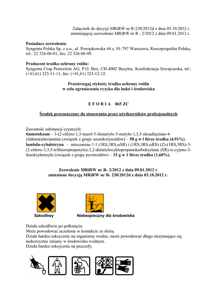 Załącznik do decyzji MRiRW nr R-238/2012d z dnia 03.10.2012 r. zmieniającej zezwolenie MRiRW nr R - 2/2012 z dnia 09.01.2012 r. Posiadacz zezwolenia: Syngenta Polska Sp. z o.o., ul. Powązkowska 44 c, 01-797 Warszawa, Rzeczpospolita Polska, tel.: 22 326-06-01, fax: 22 326-06-99. Producent środka ochrony roślin: Syngenta Crop Protection AG, P.O. Box, CH-4002 Bazylea, Konfederacja Szwajcarska, tel.: (+41,61) 323-11-11, fax: (+41,61) 323-12-12. Przestrzegaj etykiety środka ochrony roślin w celu ograniczenia ryzyka dla ludzi i środowiska E F O R I A 065 ZC Środek przeznaczony do stosowania przez użytkowników profesjonalnych Zawartość substancji czynnych: tiametoksam – 3-(2-chloro-1,3-tiazol-5-ilometylo-5-metylo-1,3,5-oksadiazinan-4ylideno(nitro)amina (związek z grupy neonikotynoidów) – 50 g w l litrze środka (4,91%). lambda-cyhalotryna – mieszanina 1:1 (1RS,3RS,αSR) i (1RS,3RS,αRS) (Z)-(1RS,3RS)-3(2-chloro-3,3,3-trifluoropropenylo)-2,2-dimetylocyklopropanokarboksylanu (SR)-α-cyjano-3fenoksybenzylu (związek z grupy pyretroidów) – 15 g w 1 litrze środka (1,60%). Zezwolenie MRiRW nr R- 2/2012 z dnia 09.01.2012 r. zmienione decyzją MRiRW nr R- 238/2012d z dnia 03.10.2012 r. Szkodliwy Niebezpieczny dla środowiska Działa szkodliwie po połknięciu Może powodować uczulenie w kontakcie ze skórą Działa bardzo toksycznie na organizmy wodne; może powodować długo utrzymujące się, niekorzystne zmiany w środowisku wodnym. Działa bardzo toksycznie na pszczoły. I OPIS DZIAŁANIA EFORIA 065 ZC jest środkiem owadobójczym w formie zawiesiny kapsuł w koncentracie stężonej zawiesiny do rozcieńczania wodą, o działaniu kontaktowym i żołądkowym, przeznaczony do zwalczania szkodników ssących i gryzących w pszenicy ozimej i jęczmieniu jarym. Na roślinie działa powierzchniowo, wgłębnie i systemicznie. Środek Eforia 065 ZC stosuje się używając opryskiwaczy polowych. II ZASTOSOWANIE ŚRODKA 1. Pszenica ozima, jęczmień jary. Mszyce, skrzypionki. Maksymalna dawka dla jednorazowego zastosowania: 0,3 l/ha. Zalecana dawka do jednorazowego stosowania: 0,3 l/ha. Maksymalna liczba zabiegów w sezonie wiosennym: 1. Zalecana ilość wody: 200 - 400 l/ha. Zalecane opryskiwanie: średniokropliste. Środek stosować od początku fazy krzewienia do końca fazy kwitnienia. Środek wykazuje długotrwałe działanie na mszyce. UWAGI: 1. Środek działa niezależnie od temperatury i warunków pogodowych. 2. Podczas stosowania środka nie dopuścić do: − znoszenia cieczy użytkowej na sąsiednie rośliny uprawne, − nakładania się cieczy użytkowej na stykach pasów zabiegowych i uwrociach. III SPORZĄDZANIE CIECZY UŻYTKOWEJ Przed przystąpieniem do sporządzania cieczy użytkowej dokładnie ustalić potrzebną jej ilość. Odmierzoną ilość środka wlać do zbiornika opryskiwacza napełnionego wodą do 1/4 pojemności (z włączonym mieszadłem). Opróżnione opakowania przepłukać trzykrotnie wodą, a popłuczyny wlać do zbiornika opryskiwacza z cieczą użytkową. Następnie zbiornik opryskiwacza uzupełnić wodą do potrzebnej ilości. Opryskiwać z włączonym mieszadłem. Po wlaniu środka do zbiornika opryskiwacza niewyposażonego w mieszadło hydrauliczne, ciecz w zbiorniku mechanicznie wymieszać. W przypadku przerw w opryskiwaniu, przed ponownym przystąpieniem do pracy należy dokładnie wymieszać ciecz użytkową w zbiorniku opryskiwacza. Po pracy aparaturę dokładnie wymyć. IV ŚRODKI OSTROŻNOŚCI 1. OKRES OD ZASTOSOWANIA ŚRODKA DO DNIA W KTÓRYM NA OBSZAR NA KTÓRYM ZASTOSOWANO ŚRODEK MOGĄ WEJŚĆ LUDZIE ORAZ ZOSTAĆ WPROWADZONE ZWIERZĘTA (okres prewencji). Dla ludzi - nie dotyczy 2. OKRES PREWENCJI DLA PSZCZÓŁ (okres zapobiegający zatruciu). Nie dotyczy 3. OKRES OD OSTATNIEGO ZASTOSOWANIA ŚRODKA DO DNIA ZBIORU ROŚLINY UPRAWNEJ (okres karencji). Pszenica ozima – 21 dni; Jęczmień jary – 21 dni. 4. OKRES OD OSTATNIEGO ZASTOSOWANIA ŚRODKA NA ROŚLINY PRZEZNACZONE NA PASZĘ DO DNIA W KTÓRYM ZWIERZĘTA MOGĄ BYĆ KARMIONE TYMI ROŚLINAMI (okres karencji dla pasz). Pszenica ozima – 21 dni; Jęczmień jary – 21 dni. 5. OKRES OD OSTATNIEGO ZASTOSOWANIA ŚRODKA NA ROŚLINY DO DNIA W KTÓRYM MOŻNA SIAĆ LUB SADZIĆ ROŚLINY UPRAWIANE NASTĘPCZO. Nie dotyczy 6. OCHRONA STOSUJĄCEGO ŚRODEK OCHRONY ROŚLIN. Nie jeść i nie pić podczas stosowania produktu. Nosić odpowiednią odzież ochronną, odpowiednie rękawice ochronne i okulary lub ochronę twarzy. W razie połknięcia niezwłocznie zasięgnij porady lekarza – pokaż opakowanie lub etykietę. 7. OCHRONA ŚRODOWISKA. Przed zastosowaniem środka należy poinformować o tym fakcie wszystkie zainteresowane strony, które mogą być narażone na znoszenie cieczy roboczej i które zwróciły się o taką informację. Zabrania się stosowania środka w strefie bezpośredniej ochrony ujęć wody. Nie zanieczyszczać wód środkiem ochrony roślin lub jego opakowaniem. Nie zanieczyszczać wód środkiem ochrony roślin lub jego opakowaniem. Nie myć aparatury w pobliżu wód powierzchniowych. Unikać zanieczyszczania wód poprzez rowy odwadniające z gospodarstw i dróg. Resztki cieczy użytkowej rozcieńczyć wodą i wypryskać na powierzchni poprzednio opryskiwanej. Wodę użytą do mycia aparatury wypryskać na powierzchni uprzednio opryskiwanej, stosując te same środki ochrony osobistej. Środek i opakowanie usuwać jako odpad niebezpieczny. Opróżnione opakowania po środku zwrócić do sprzedawcy, u którego środek został zakupiony. Używać odpowiednich pojemników zapobiegających skażeniu środowiska. Zabrania się spalania opakowań po środku ochrony roślin we własnym zakresie. Zabrania się wykorzystywania opróżnionych opakowań po środkach ochrony roślin do innych celów, w tym także traktowania ich jako surowce wtórne. W celu ochrony organizmów wodnych konieczne jest wyznaczenie strefy ochronnej o szerokości 10 m od zbiorników i cieków wodnych. W c