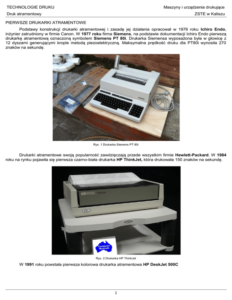 Maszyny i urządzenia drukujące TECHNOLOGIE DRUKU Druk atramentowy ZSTE w Kaliszu PIERWSZE DRUKARKI ATRAMENTOWE Podstawy konstrukcji drukarki atramentowej i zasadę jej działania opracował w 1976 roku Ichiro Endo, inżynier zatrudniony w firmie Canon. W 1977 roku firma Siemens, na podstawie dokumentacji Ichiro Endo pierwszą drukarkę atramentową oznaczoną symbolem Siemens PT 80i. Drukarka Siemensa wyposażona była w głowicę z 12 dyszami generującymi krople metodą piezoelektryczną. Maksymalna prędkość druku dla PT80i wynosiła 270 znaków na sekundę. Rys. 1 Drukarka Siemens PT 80i Drukarki atramentowe swoją popularność zawdzięczają przede wszystkim firmie Hewlett-Packard. W 1984 roku na rynku pojawiła się pierwsza czarno-biała drukarka HP ThinkJet, która drukowała 150 znaków na sekundę. Rys. 2 Drukarka HP ThinkJet W 1991 roku powstała pierwsza kolorowa drukarka atramentowa HP DeskJet 500C 1 Maszyny i urządzenia drukujące TECHNOLOGIE DRUKU Druk atramentowy ZSTE w Kaliszu Rys. 3 HP DeskJet 500C Drukarki atramentowe do druku wykorzystują atrament, który w postaci mikroskopijnych kropel wystrzeliwany jest z głowicy w kierunku zadrukowywanego arkusza papieru, kropelki padając na kartkę tworzą wydruk. Atrament wyrzucany jest z wielu miniaturowych dysz, a nad poprawnym rozmieszeniem na kartce kropel i ich wielkością czuwa elektronika sterująca urządzenia. Głowica strzelająca atramentem przesuwając się wzdłuż papieru tworzy wydruk. Precyzyjne umiejscowienie kropli na kartce papieru nie stanowi większego problemu, gdyż położenie dyszy w pionie i poziomie można kontrolować za pomocą silników krokowych przesuwających zarówno papier, jak i głowicę. Zadrukowywanie kartki przy wykorzystaniu głowicy z jedną lub nawet kilkoma dyszami trwałoby bardzo długo, dlatego współczesne drukarki korzystają z głowic wyposażonych w setki, a nawet tysiące dysz. Dla każdego koloru w systemie sześciokolorowym stosuje się blisko 1 tys. dysz. Rys. 5 Dysze głowicy drukującej Aby zwiększyć precyzję wydruku usytuowane w pionowych rzędach dysze są między sobą przesunięte. Średnica otworu dysz w obecnie sprzedawanych drukarkach ma od 10 do 20 mikrometrów. Z kolei objętość wystrzeliwanej kropli można zmieniać od ok. 0,5–0,8 pikolitra do ok. 20–25 pikolitrów, w zależności od modelu drukarki. Tak małe kropelki pozwalają bez problemu uzyskać rozdzielczości przy druku fotograficznym rzędu 9600×2400 dpi. Mniejsze średnice dysz wykorzystuje się do atramentów kolorowych, większe zaś drukują w kolorze czarnym. Z kolei zmienna wielkość kropli stosowana jest po to, aby atrament na wydruku nie zlewał się, co powoduje lepsze odwzorowanie przejść tonalnych. 2 Maszyny i urządzenia drukujące TECHNOLOGIE DRUKU Druk atramentowy ZSTE w Kaliszu RODZAJE ATRAMENTÓW Atrament barwnikowy jest jednorodną cieczą z rozpuszczonymi barwnikami. Atrament wytwarzany jest z cząsteczek barwnika rozpuszczonego w płynie. Atrament barwnikowy podczas druku ma za zadanie wniknąć głęboko w strukturę papieru, bez rozlewania się na boki. Zalety: - może tworzyć bardzo małe krople umożliwiające otrzymanie na wydrukach wysokich rozdzielczości - większe bogactwo szczegółów na wydruku, a także większą gamę kolorystyczną, - niższa cena od pigmentowych Wada: - podatność wydruków na czynniki zewnętrzne: promienie UV (blaknięcie), woda, ścieranie. Jeśli atrament nie gwarantuje tej odporności, wykonana praca musi być dodatkowo zabezpieczona, np. przez laminowanie, co podnosi koszty. Atrament pigmentowy zawiera w sobie cząstki stałe – pigmenty. Cząsteczki przenoszące kolor nie rozpuszczają się w cieczy, lecz mają strukturę mikro-ziaren. W porównaniu z cząsteczkami atramentu barwnikowego, ziarna pigmentu wydają się być "masywnymi bryłami". W przypadku atramentu pigmentowego ziarna pigmentów muszą pozostać na powierzchni papieru lub nieznacznie wejść w głąb, aby być na równi z powierzchnią. Wydruki na ploterze lub drukarce wielkoformatowej. Zalety: odporność na światło - promienie UV (odporność na degradację barw w wyniku działania intensywnych promieni świetlnych, a także gazów itp.) - stabilność kolorów (atrament podczas wysychania zmienia barwę) - odporność fizyczna, a więc odporność naniesionego druku na ścieranie, wodę i inne czynniki zewnętrzne. Wady: - duża wielkość kropli, utrudnione mieszanie się między sobą. Wybór atramentu zależny jest od przeznaczenia wydruku. - jeśli wydruk musi być długo eksponowany (lub archiwizowany) i ważna jest czasowa stałość jego barw niewątpliwie należy drukować atramentem pigmentowym, - jeśli natomiast decydującym elementem jest jak najwyższa jakość wydruku - atramenty barwnikowe są bardziej odpowiednie. 3 Maszyny i urządzenia drukujące TECHNOLOGIE DRUKU Druk atramentowy ZSTE w Kaliszu TECHNOLOGIE DRUKU ATRAMENTOWEGO Technologia termiczna w tej technologii każda dysza ma w sobie element grzejny (zazwyczaj jest ich 48-512). Impulsy elektryczne wysyłane są do elementu grzejnego, który rozgrzewa atrament do ok. 300 °C, a tworzący się pęcherzyk pary i kropla atramentu wyrzucana jest z dyszy. Dysza wylotowa to otwór średnicy, np. około 40 mikrometrów przez który kropelka atramentu jest przenoszona na nośnik. Głowica drukująca posiada wiele dysz wylotowych - na każdy kolor oddzielny zestaw. Bezpośrednio pod każdą z dysz wylotowych w pokrywie głowicy jest umieszczony opornik (rezystancja), pracujący w tym przypadku jako grzałka. Zasada działania: 1. w przypadku żądania wydruku przez drukarkę grzałka zwiększa swoją temperaturę. Wysoka temperatura, ok. 300 °C jest utrzymywana w czasie 2 do 5 mikrosekund. Wzrost temperatury przebiega w tak szybkim czasie, że tylko cienka warstwa atramentu jest podgrzewana przez grzałkę. 2. w rezultacie powstaje bąbelek powietrza, który w tym momencie działa ja