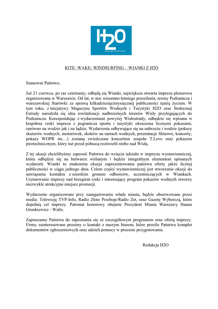 KITE- WAKE- WINDSURFING – WIANKI Z H2O Szanowni Państwo, JuŜ 21 czerwca, po raz czternasty, odbędą się Wianki, największa otwarta impreza plenerowa organizowana w Warszawie. Od lat, w noc wiosenno-letniego przesilenia, tereny Podzamcza i warszawskiej Starówki za sprawą kilkudziesięciotysięcznej publiczności tętnią Ŝyciem. W tym roku, z inicjatywy Magazynu Sportów Wodnych i Turystyki H2O oraz Stołecznej Estrady narodziła się idea rewitalizacji nadbrzeŜnych terenów Wisły przylegających do Podzamcza. Korespondując z wydarzeniami powyŜej Wisłostrady, odbędzie się wpisana w krajobraz rzeki impreza z pogranicza sportu i turystyki okraszona licznymi pokazami, zarówno na wodzie jak i na lądzie. Wydarzenia odbywające się na nabrzeŜu i wodzie (pokazy skuterów wodnych, motorówek, skoków na nartach wodnych, prezentacje filmowe, koncerty, pokazy WOPR etc…) zostaną zwieńczone koncertem zespołu T.Love oraz pokazem pirotechnicznym, który tuŜ przed północą rozświetli niebo nad Wisłą. Z tej okazji chcielibyśmy zaprosić Państwa do wzięcia udziału w imprezie wystawienniczej, która odbędzie się na bulwarze wiślanym i będzie integralnym elementem opisanych wydarzeń. Wianki to znakomita okazja zaprezentowania państwa oferty jakŜe licznej publiczności w ciągu jednego dnia. Celem części wystawienniczej jest stworzenie okazji do nawiązania kontaktu z szerokim gronem odbiorców, uczestniczących w Wiankach. Usytuowanie imprezy nad brzegiem rzeki i interesujący program pokazów wodnych stworzy niezwykle atrakcyjne miejsce promocji. Wydarzenie organizowane przy zaangaŜowaniu władz miasta, będzie obserwowane przez media: Telewizję TVP-Info, Radio Złote Przeboje/Radio Zet, oraz Gazetę Wyborczą, które dopełnią cel imprezy. Patronat honorowy obejmie Prezydent Miasta Warszawy Hanna Gronkiewicz - Waltz. Zapraszamy Państwa do zapoznania się ze szczegółowym programem oraz ofertą imprezy. Firmy zainteresowane prosimy o kontakt z naszym biurem, które prześle Państwu komplet dokumentów zgłoszeniowych oraz udzieli pomocy w procesie przygotowania. Redakcja H2O CENNIK POWIERZCHNIA STOISKA 500,00 zł Cena zawiera najem powierzchni namiotu łącznie z zabudową. Istnieje moŜliwość zaopatrzenia stoiska w energię elektryczną za dodatkową opłatą. EKSPOZYCJA BANNERA/ TABLICY REKLAMOWEJ gratis Ekspozycja bannera lub tablicy reklamowej na terenie odbywającej się imprezy, w miejscu wyznaczonym przez Organizatora. DYSTRYBUCJA MATERIAŁÓW PROMOCYJNYCH ZGŁOSZENIA PRZYJMUJE Anna Krawiecka [email protected] 0 507 296 104 H2O Magazyn Sportów Wodnych i Turystyki Ul. Krakowskie Przedmieście 79 00-079 Warszawa gratis