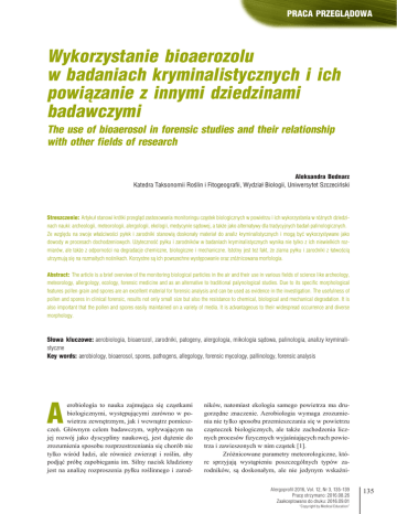 PRACA PRZEGLĄDOWA Wykorzystanie bioaerozolu w badaniach kryminalistycznych i ich powiązanie z innymi dziedzinami badawczymi The use of bioaerosol in forensic studies and their relationship with other fields of research Aleksandra Bednarz Katedra Taksonomii Roślin i Fitogeografii, Wydział Biologii, Uniwersytet Szczeciński Streszczenie: Artykuł stanowi krótki przegląd zastosowania monitoringu cząstek biologicznych w powietrzu i ich wykorzystania w różnych dziedzinach nauki: archeologii, meteorologii, alergologii, ekologii, medycynie sądowej, a także jako alternatywy dla tradycyjnych badań palinologicznych. Ze względu na swoje właściwości pyłek i zarodniki stanowią doskonały materiał do analiz kryminalistycznych i mogą być wykorzystywane jako dowody w procesach dochodzeniowych. Użyteczność pyłku i zarodników w badaniach kryminalistycznych wynika nie tylko z ich niewielkich rozmiarów, ale także z odporności na degradacje chemiczne, biologiczne i mechaniczne. Istotny jest też fakt, że ziarna pyłku i zarodniki z łatwością utrzymują się na rozmaitych nośnikach. Korzystne są ich powszechne występowanie oraz zróżnicowana morfologia. Abstract: The article is a brief overview of the monitoring biological particles in the air and their use in various fields of science like archeology, meteorology, allergology, ecology, forensic medicine and as an alternative to traditional palynological studies. Due to its specific morphological features pollen grain and spores are an excellent material for forensic analysis and can be used as evidence in the investigation. The usefulness of pollen and spores in clinical forensic, results not only small size but also the resistance to chemical, biological and mechanical degradation. It is also important that the pollen and spores easily maintained on a variety of media. It is advantageous to their widespread occurrence and diverse morphology. Słowa kluczowe: aerobiologia, bioaerozol, zarodniki, patogeny, alergologia, mikologia sądowa, palinologia, analizy kryminalistyczne Key words: aerobiology, bioaerosol, spores, pathogens, allegology, forensic mycology, pallinology, forensic analysis A erobiologia to nauka zajmująca się cząstkami biologicznymi, występującymi zarówno w powietrzu zewnętrznym, jak i wewnątrz pomieszczeń. Głównym celem badawczym, wpływającym na jej rozwój jako dyscypliny naukowej, jest dążenie do zrozumienia sposobu rozprzestrzeniania się chorób nie tylko wśród ludzi, ale również zwierząt i roślin, aby podjąć próbę zapobiegania im. Silny nacisk kładziony jest na analizę rozproszenia pyłku roślinnego i zarod- ników, natomiast ekologia samego powietrza ma drugorzędne znaczenie. Aerobiologia wymaga zrozumienia nie tylko sposobu przemieszczania się w powietrzu cząsteczek biologicznych, ale także zachodzenia licznych procesów fizycznych wyjaśniających ruch powietrza i zawieszonych w nim cząstek [1]. Zróżnicowane parametry meteorologiczne, które sprzyjają wystąpieniu poszczególnych typów zarodników, są doskonałym, ale nie jedynym wskaźniAlergoprofil 2016, Vol. 12, Nr 3, 135-139 Pracę otrzymano: 2016.08.26 Zaakceptowano do druku: 2016.09.01 “Copyright by Medical Education” 135 PRACA PRZEGLĄDOWA kiem do przewidywania koncentracji aerospor. Analiza stężeń zarodników jest istotna w aspekcie prognozowania i zapobiegania ich patogennym działaniom. Powietrze, którym oddychamy, składa się nie tylko z gazów, takich jak: azot, tlen i dwutlenek węgla, ale zawiera również inne substancje lotne, cząstki nieorganiczne (np. drobinki skał, produkty spalania i pył z przestrzeni kosmicznej) oraz materiał pochodzenia biologicznego. Oprócz pyłku roślin i zarodników grzybów, występujących w zróżnicowanych kształtach i rozmiarach, bioaerozol może również zawierać protisty (np. pierwotniaki, glony i okrzemki), bakterie, wirusy, zarodniki mchów i paproci, fragmenty roślin i drobnych nasion, bezkręgowce i ich fragmenty (np. nicienie, roztocza, pająki i owady) oraz dowolne fragmenty organiczne. Rozmiary opisanych drobin mieszczą się w przedziale 1–200 µm. Substancje lotne mogą pochodzić ze źródeł biologicznych w postaci metabolitów, powstałych w procesach takich, jak: rozkład, fermentacja lub produkcja toksyn. W warunkach występowania „wystarczająco” wysokiego poziomu zanieczyszczeń w powietrzu wspomniany materiał może być widoczny gołym okiem w postaci pyłu, dymu i smogu [1]. Skład powietrza atmosferycznego zmienia się dynamicznie. W zależności od lokalizacji, warunków pogodowych, pór roku i dnia można zaobserwować odmienne skutki działania powyższych czynników na produkcję, transport i składowanie poszczególnych typów aerospor [2]. Na efektywność ich rozproszenia w powietrzu wpływają: liczba i sposób uwalniania produkowanych zarodników, rodzaj transportu i osadzania, a także ich długowieczność i uwarunkowania środowiskowe. Większość modeli opisujących codzienną okresowość „zarodnikowania” jest związana z czynnikami środowiskowymi, takimi jak: światło, temperatura czy wiatr. Znaczenie rytmów dobowych w produkcji i uwalnianiu zarodników w sukcesie ewolucyjnym grzybów rozważanych jako patogeny roślinne nie została potwierdzona. Aby zarodniki skutecznie rozproszyły się w powietrzu, muszą pokonać liczne przeszkody – przebyć trzy etapy porównywane z lotem samolotu: wyzwolenie zarodników („start”), transport („lot”) oraz osadzanie („lądowanie”) [3]. Szlaki aerobiologiczne ukazują różne etapy ruchu cząstek, takich jak zarodniki lub pyłek, zaczynając od ich źródeł, aż do skutków, jakie powodują podczas lądowania. Często, zamiast badać każdy proces z osobna, badano kombinację kilku procesów. Pobieranie próbek powietrza do badania niektórych cząstek (zwykle zarodników lub pyłku) może być przydatne do monitorowania zmian klimatycznych, sz
